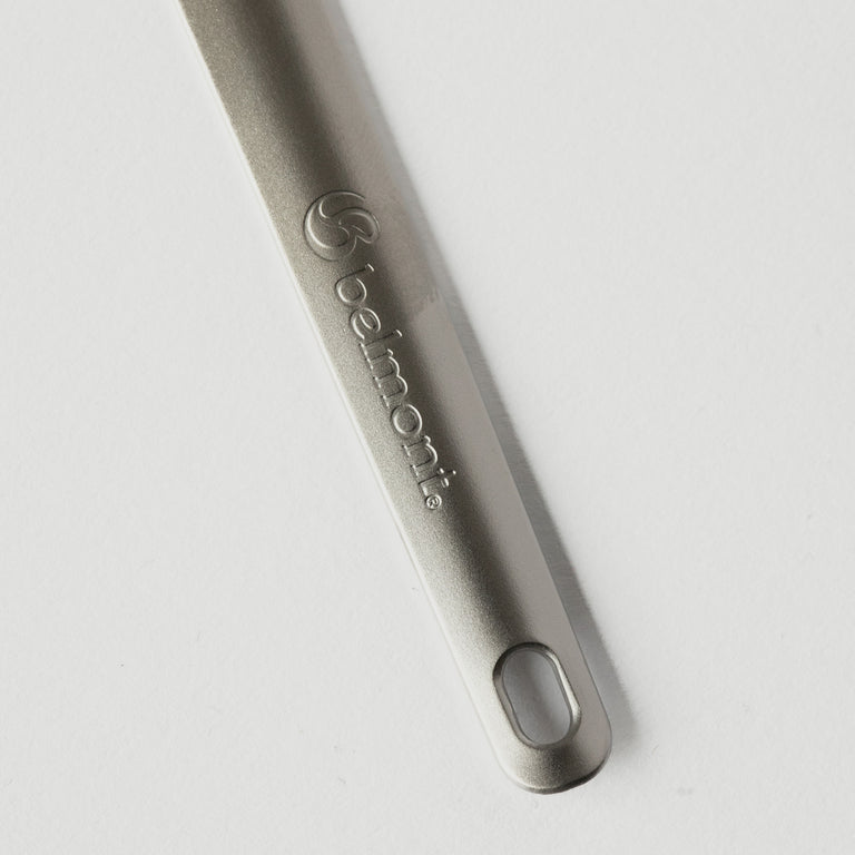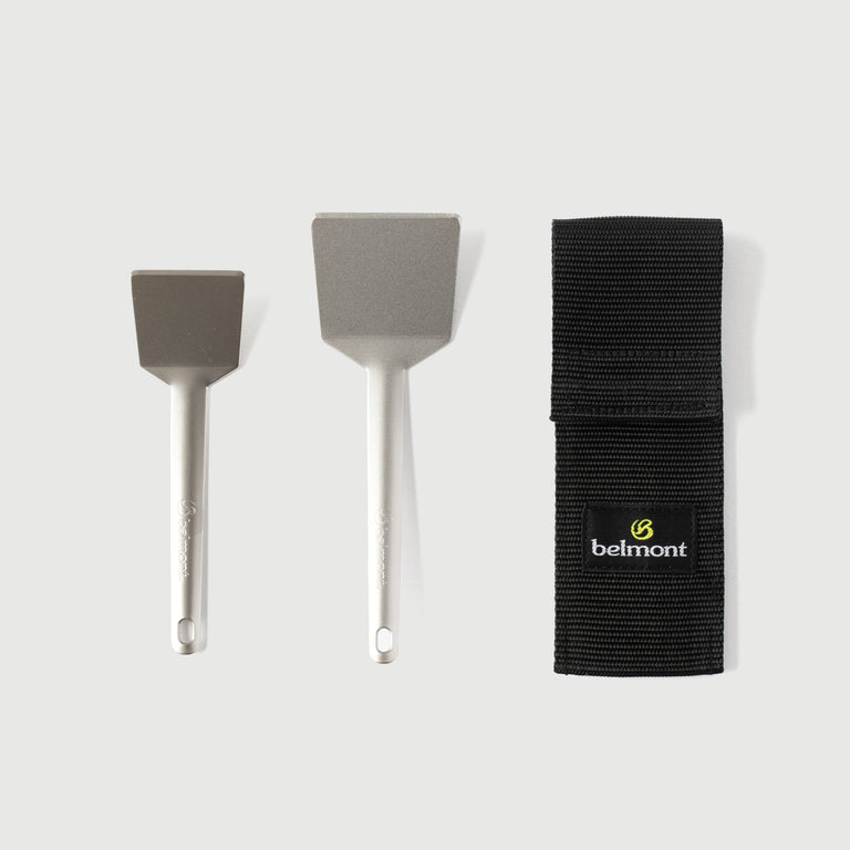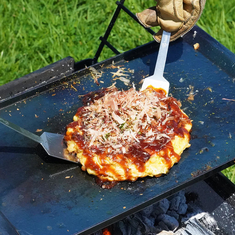 A lightweight titanium spatula for flipping, cutting, mixing, and eating, ideal for okonomiyaki, dumplings, cheese, and scraping.
