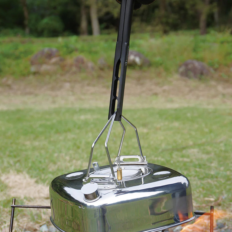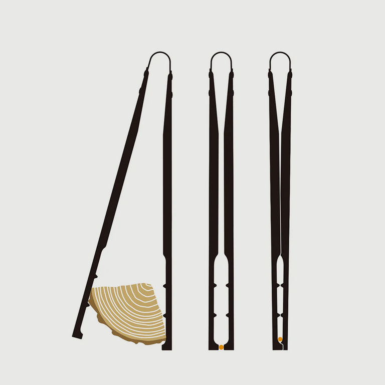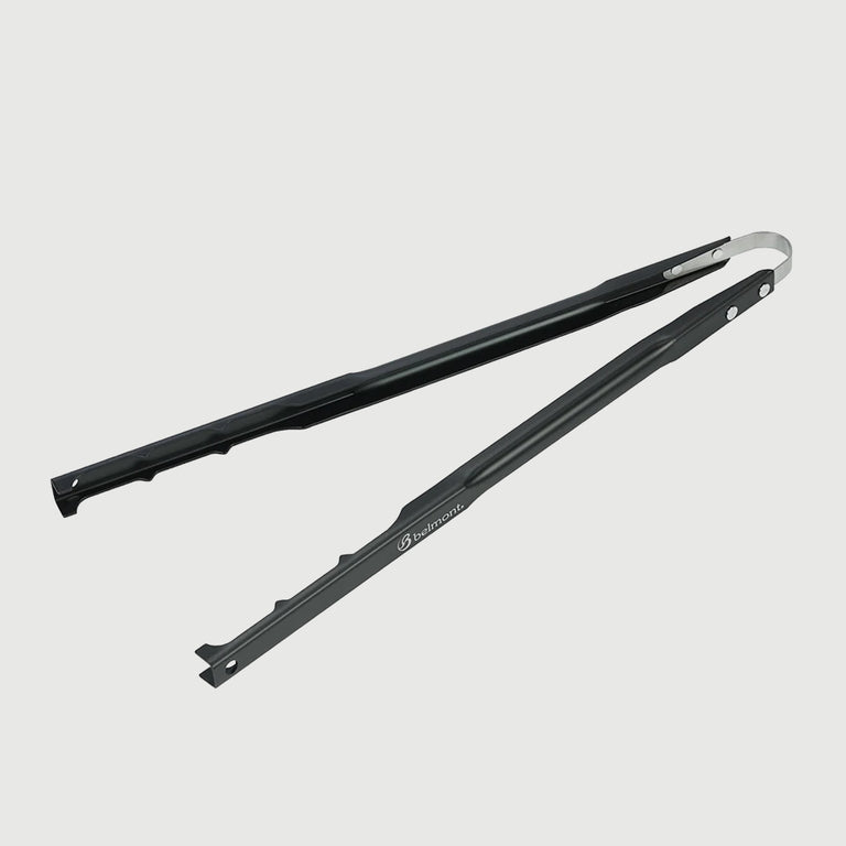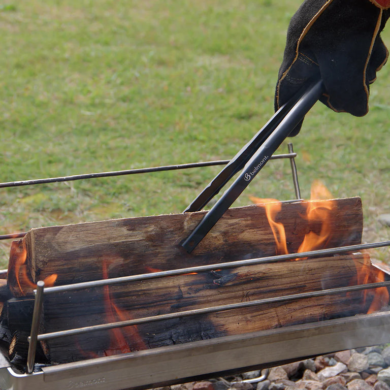 This lightweight 70g aluminium fire tong features a durable U-shaped design, spring mechanism, and offset tips or handling firewood and small branches.