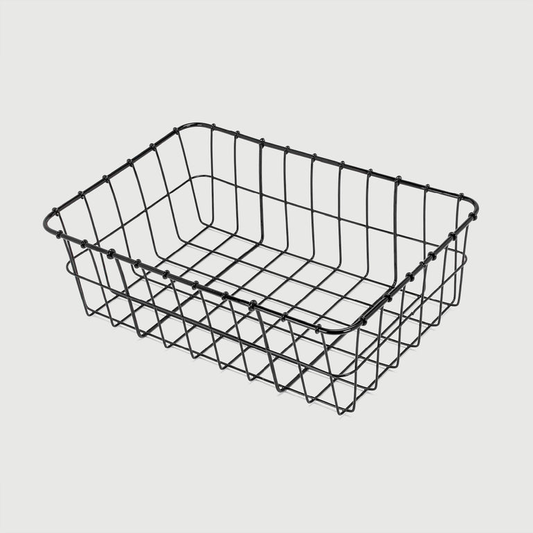 A shallow front basket suitable for most bicycles and available in powder-coated black or zinc-coated silver.
