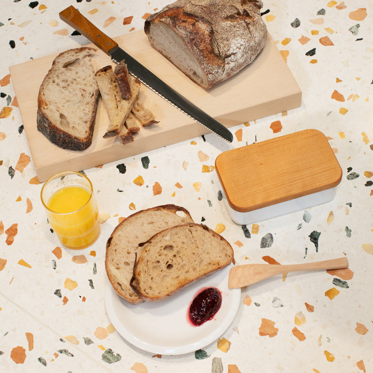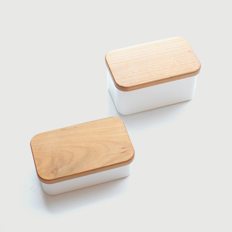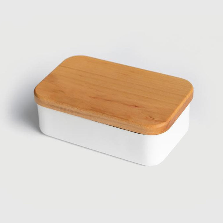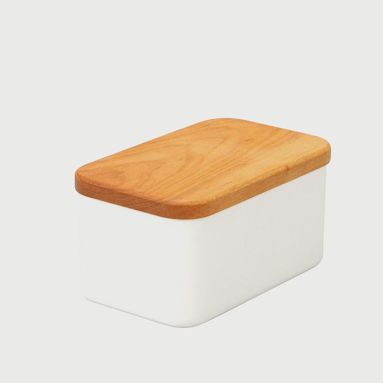 A butter dish, designed by Noda Horo and made from enamel with a cherry wood lid.