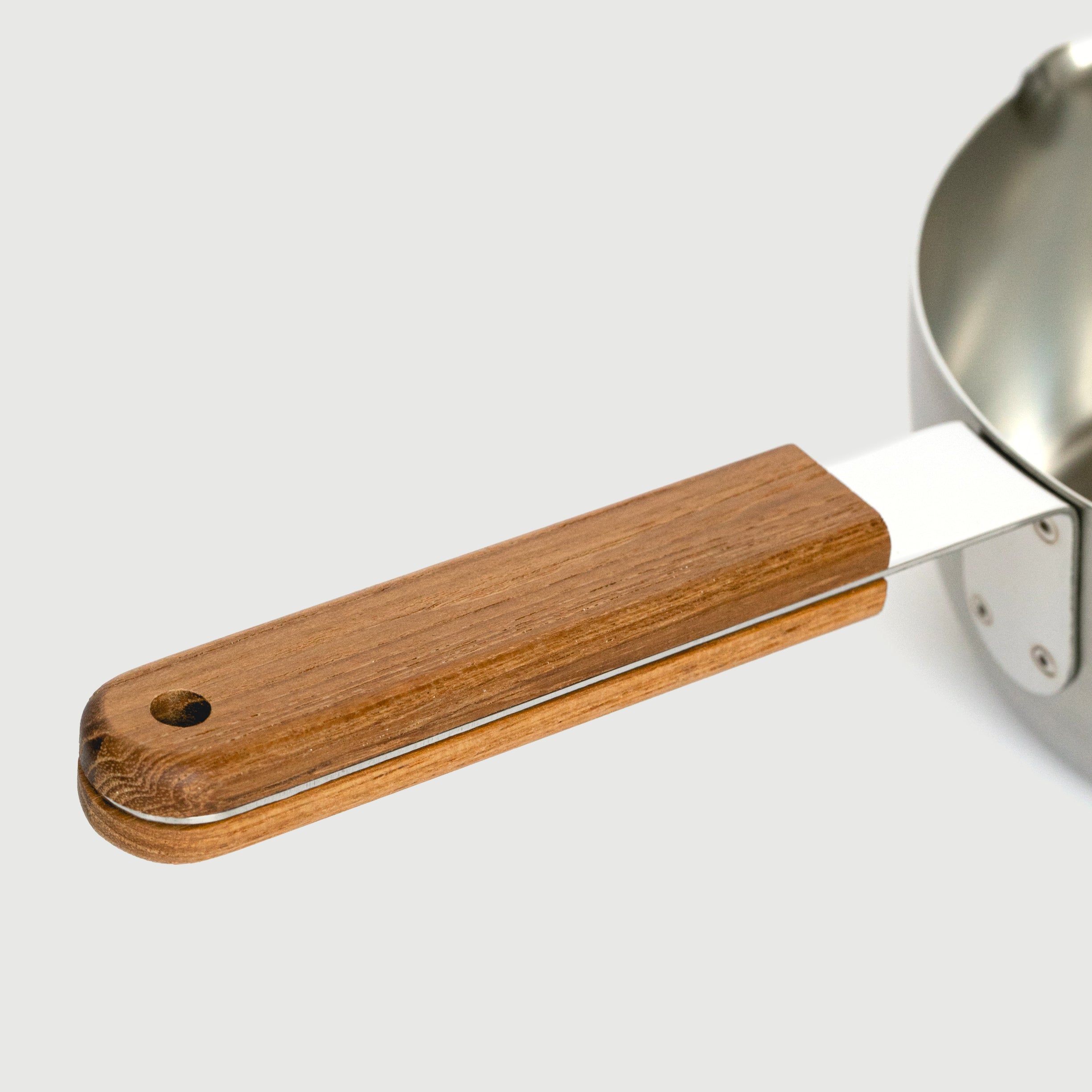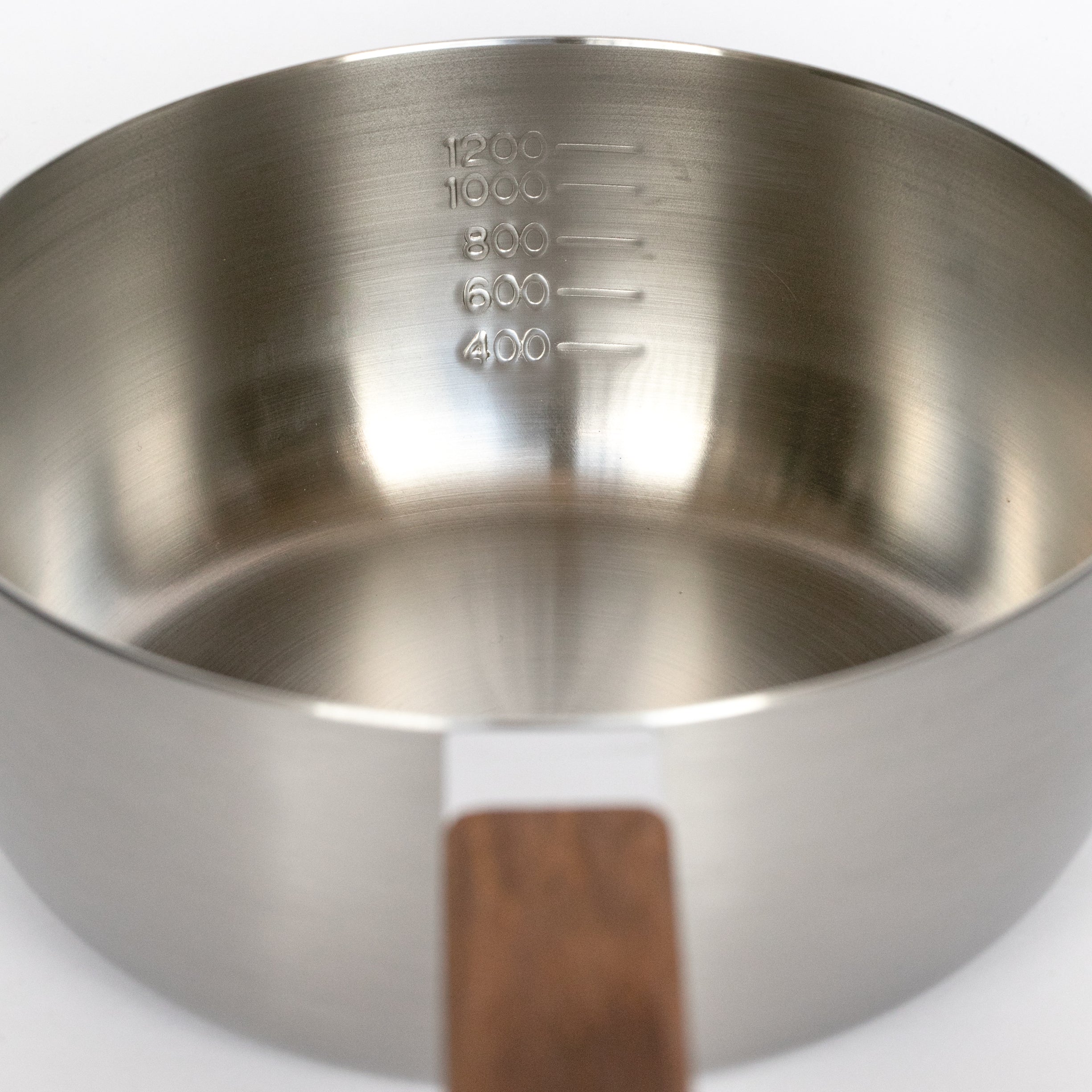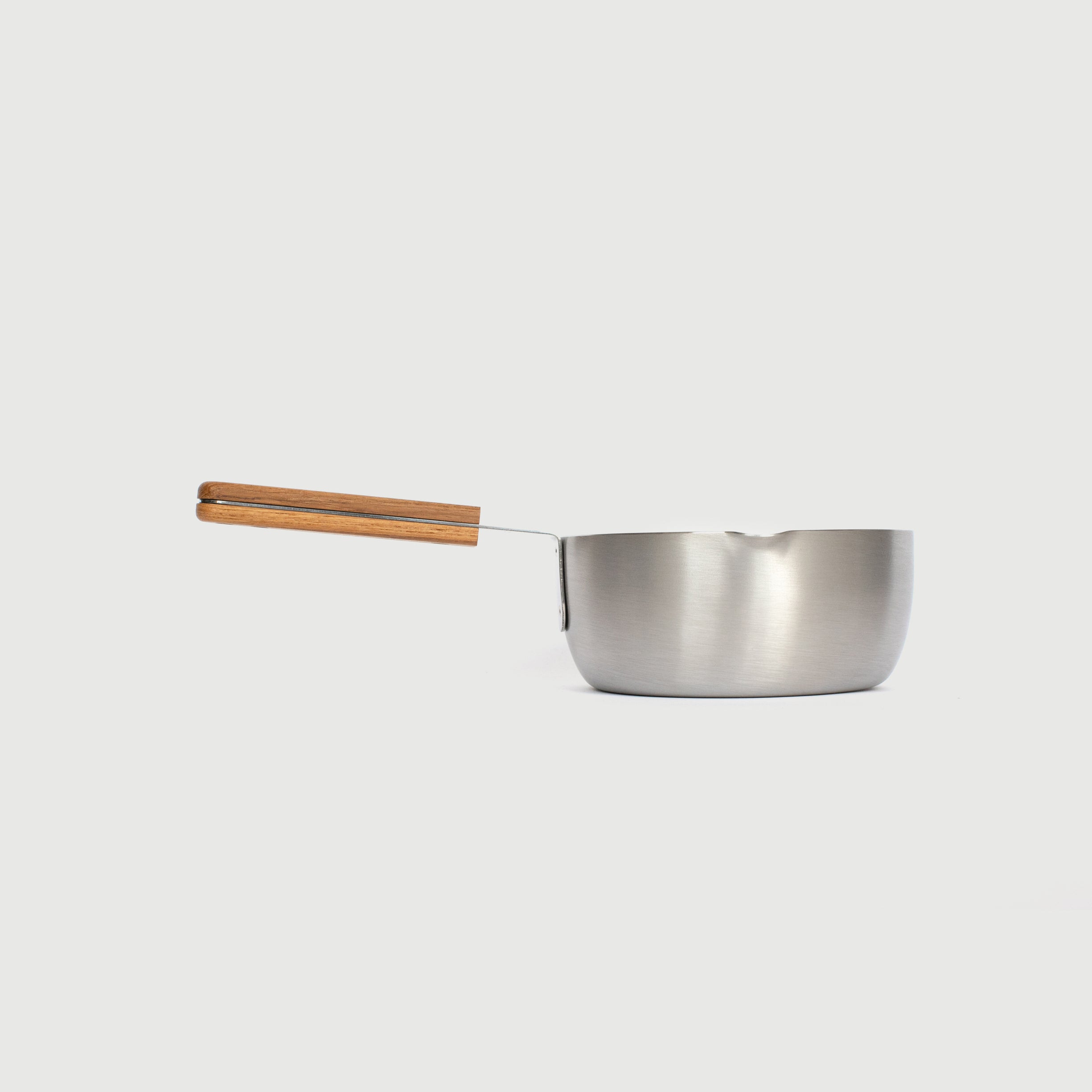 A Yukihira Pan designed by Makoto Koizumi for Ambai. Traditionally Yukihira pans are made from aluminium to heat quickly, but these contemporary, stainless steel versions with teak handles are hard wearing and thoughtfully designed. Three layers of stainless steel provide excellent heat conduction while measurements on the interior surface aid with cooking. The inbuilt spout makes pouring easier.