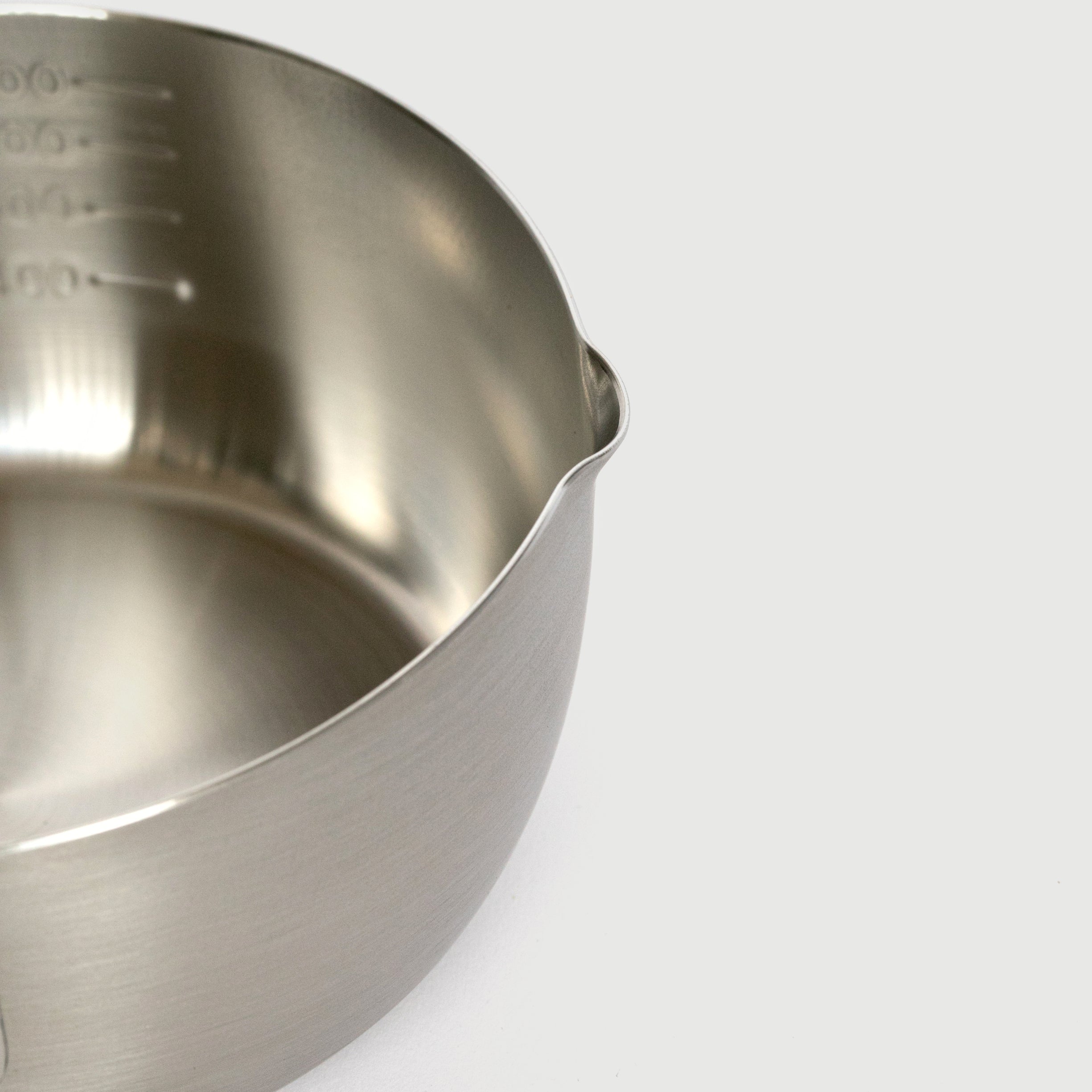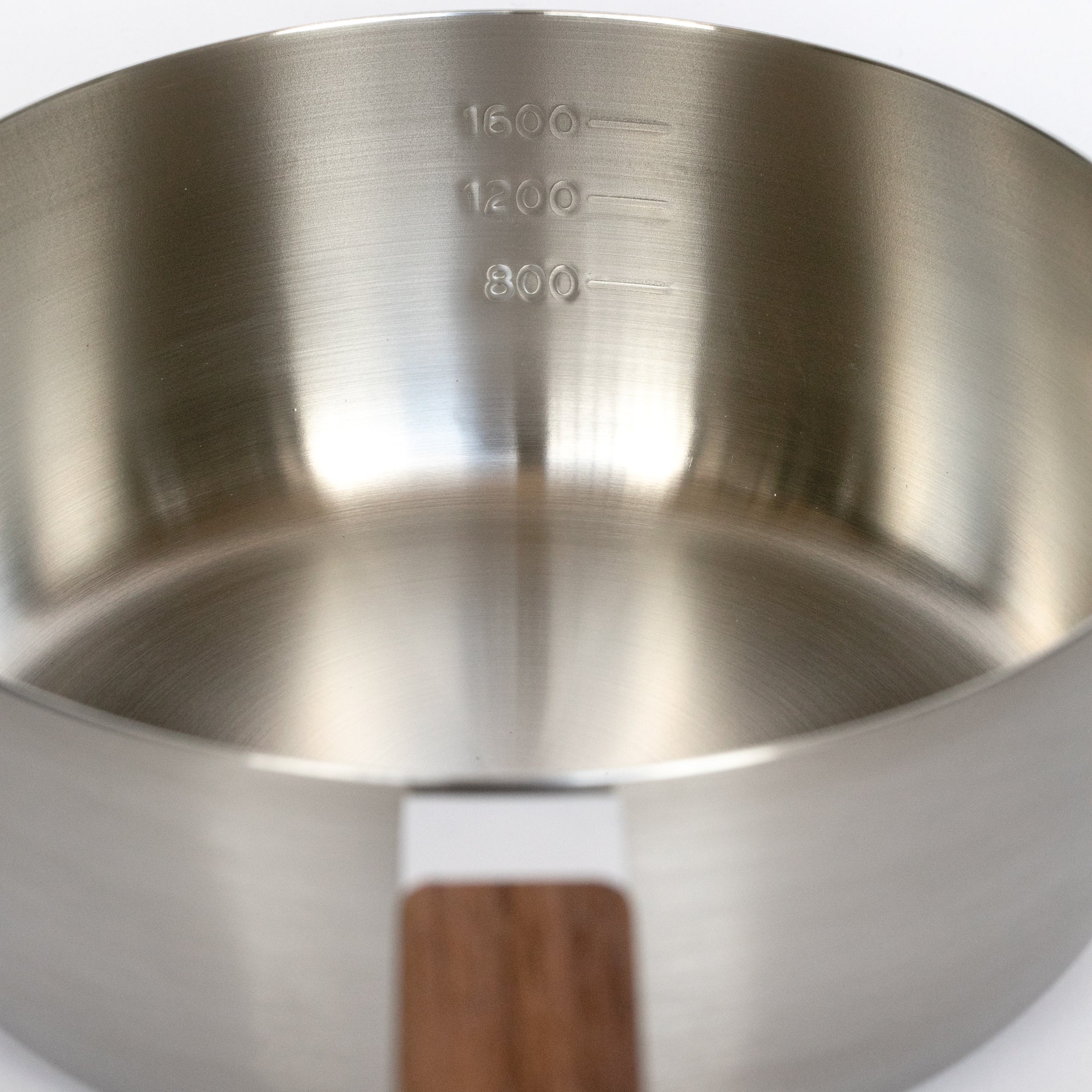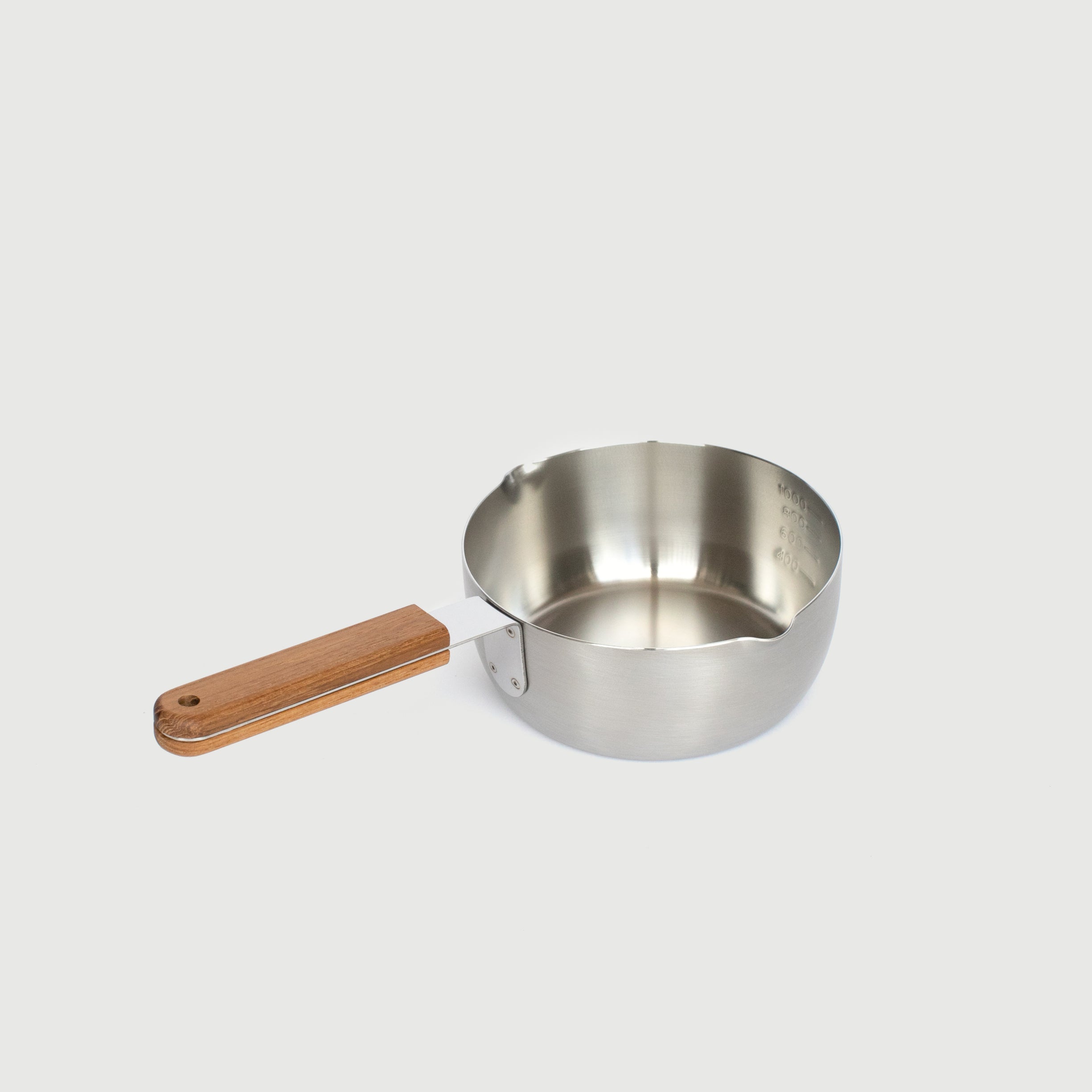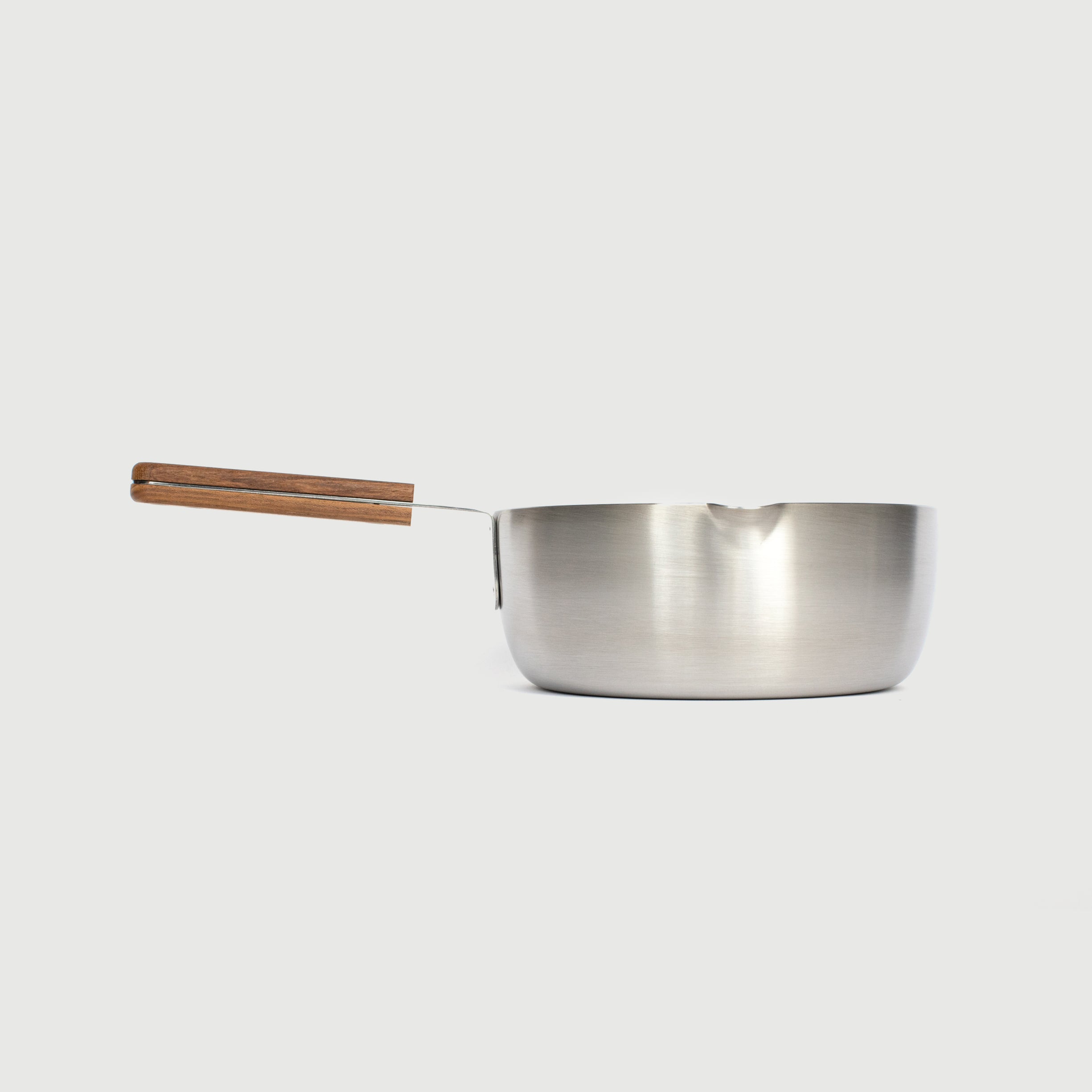 A Yukihira Pan designed by Makoto Koizumi for Ambai. Traditionally Yukihira pans are made from aluminium to heat quickly, but these contemporary, stainless steel versions with teak handles are hard wearing and thoughtfully designed. Three layers of stainless steel provide excellent heat conduction while measurements on the interior surface aid with cooking. The inbuilt spout makes pouring easier.
