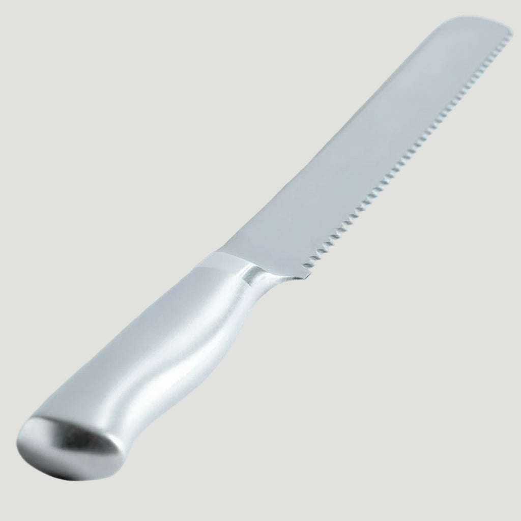 A stainless steel bread knife by indudtrial designer, Sori Yanagi. Made from single-ply stainless steel, blended with molybdenum vanadium, which provides superior sharpness, durability and corrosion resistance when compared to typical stainless knives. It seamlessly blends functionality with simple, elegant aesthetics, a trait found in so many of the Sori Yanagi's designs.