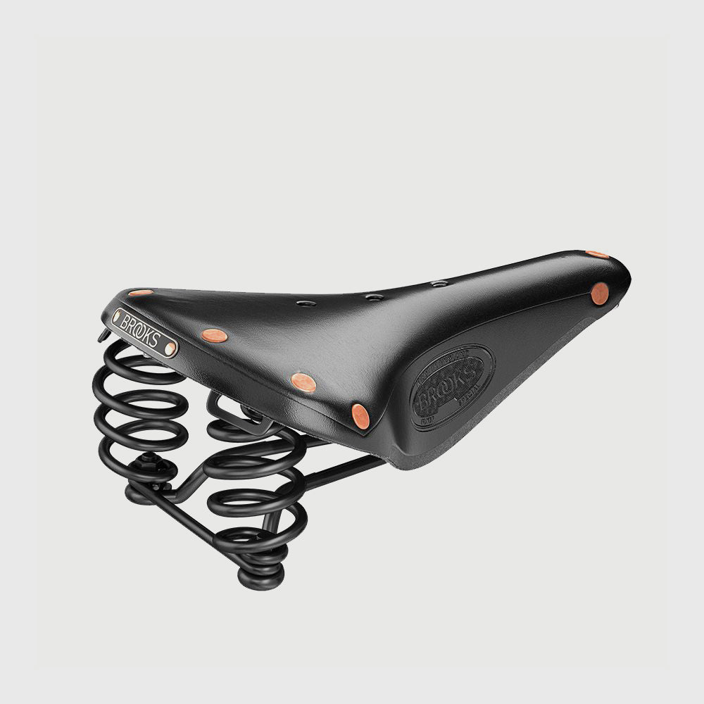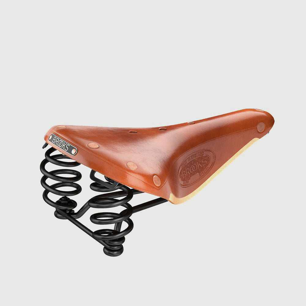 The Flyer Special is a touring saddle with suspension springs for comfort and hand-hammered rivets for long-lasting durability, sharing the same leather top as the B17 model but with extra suspension and hand-hammered copper rivets to protect the leather over time.