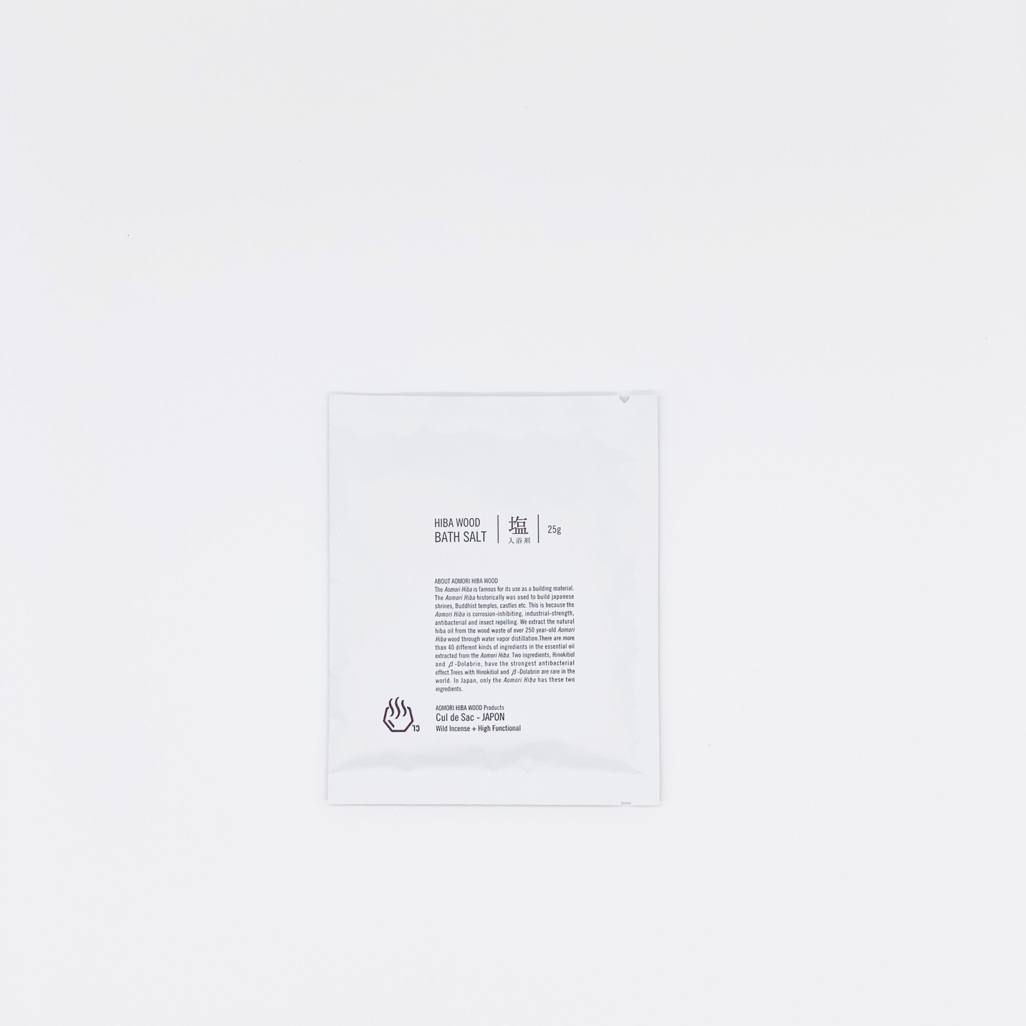 With a combination of Aomori Hiba Wood Oil and salt, the aromatic Hiba Wood Bath Salts are made by pumping and distilling the mineral rich sea water, from the Tsugaru Strait. Each bag is good for a single use.