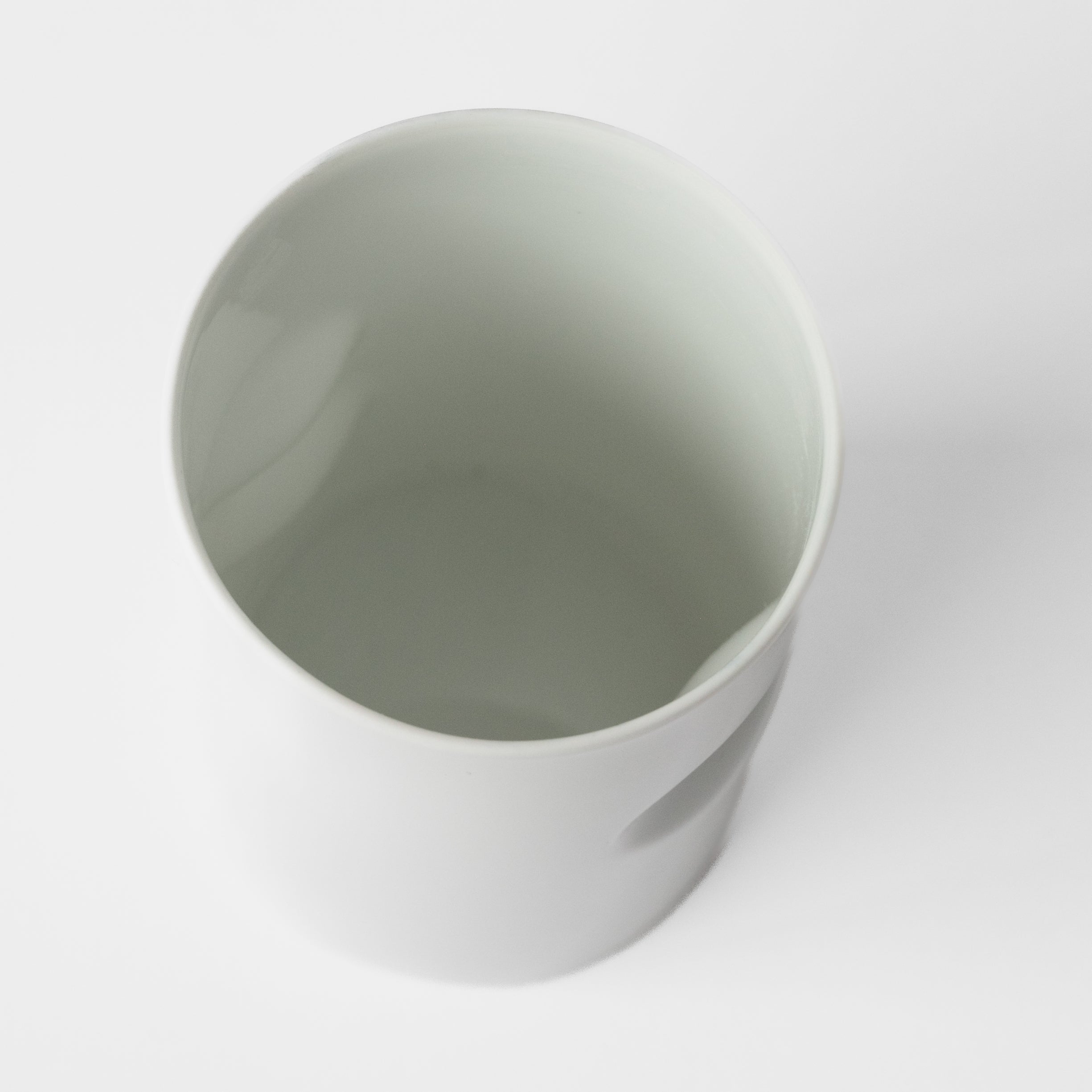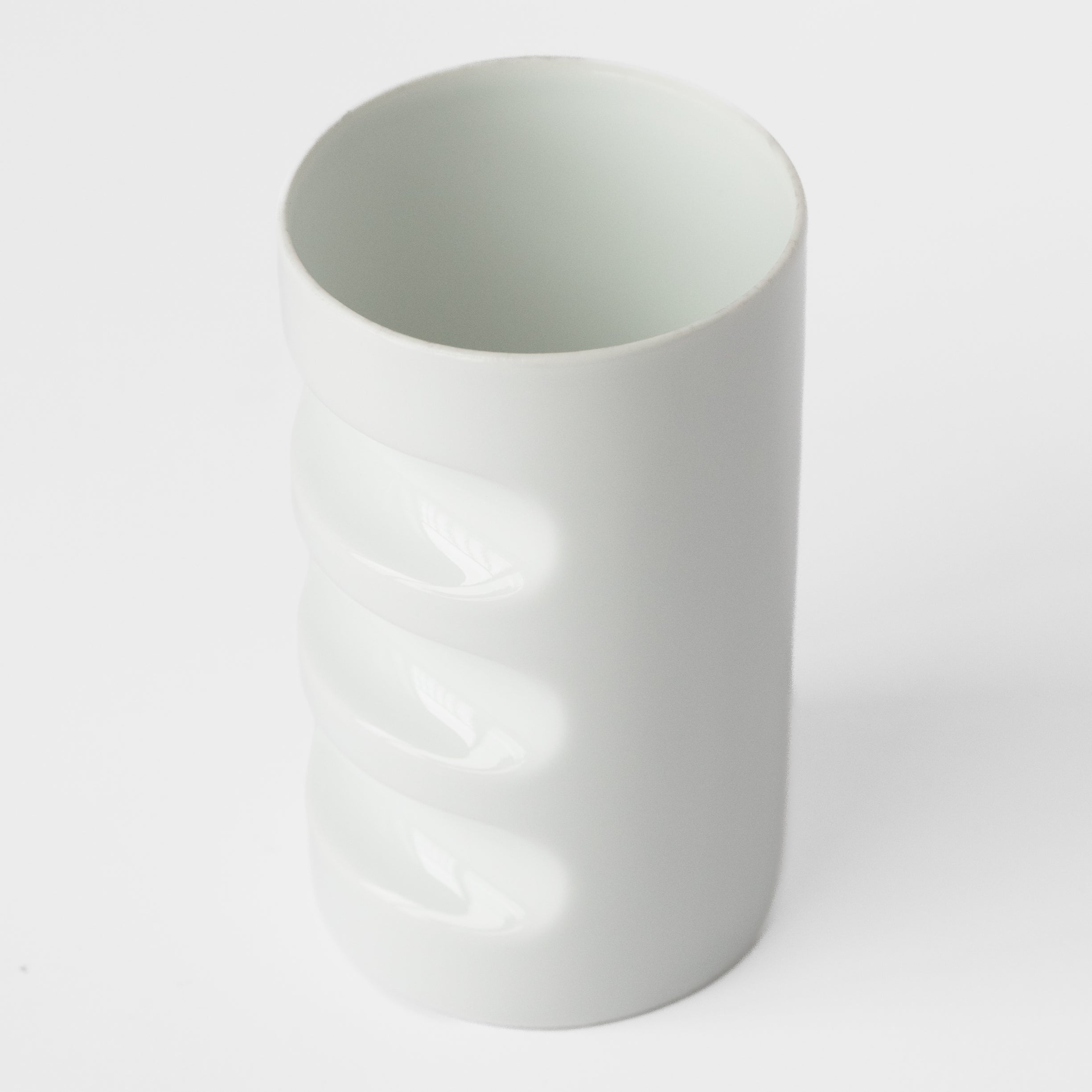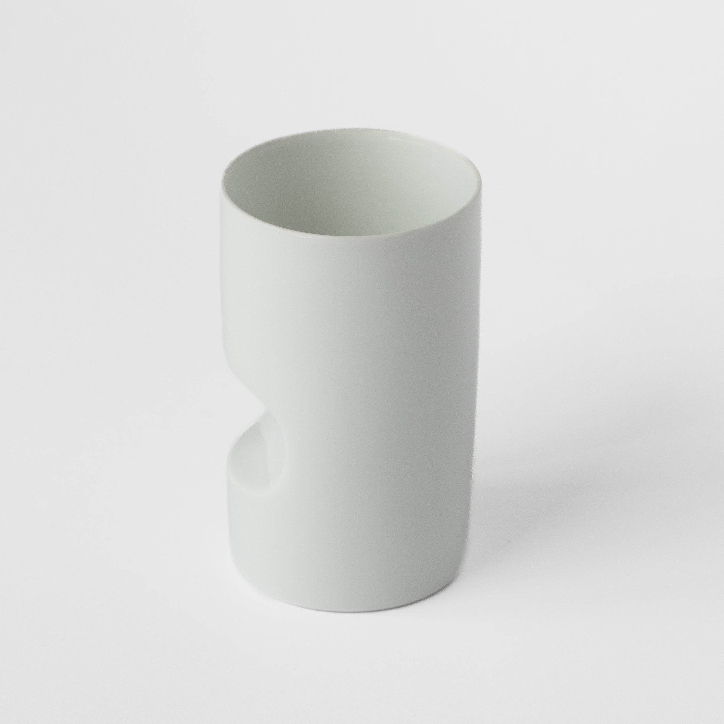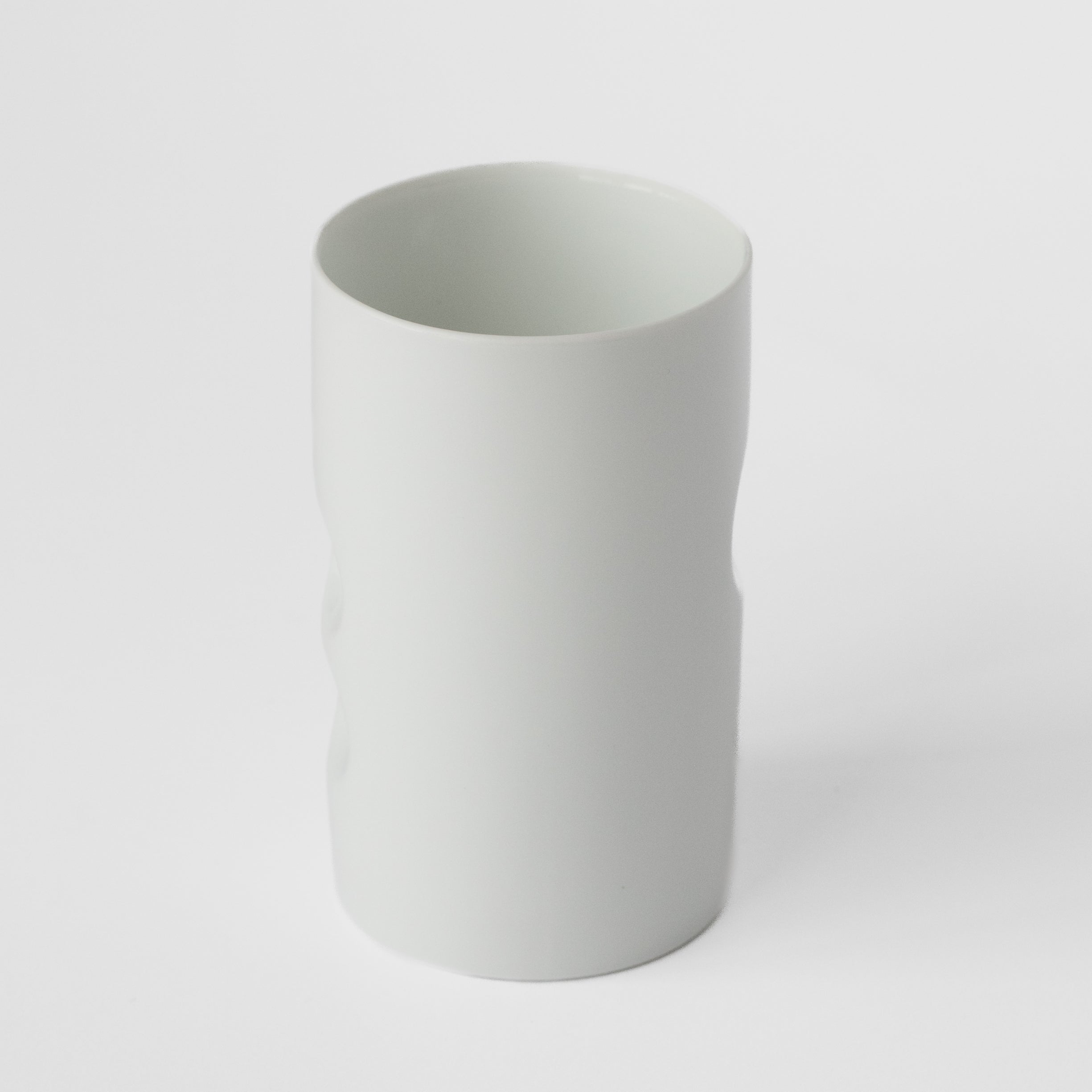 The Fancy Cup, designed by Masahiro Mori in 1969, is a delicate, translucent porcelain tumbler with a smooth finish and a unique shape. It can be used for cold drinks, as a vase, or as a decorative item. The cup comes in six tactile and individual shapes with a surface designed to perfectly fit your fingers. Made of quality, blue-toned porcelain, the tumbler has been in continuous production for over 50 years and in 2006 received the prestigious Good Design Award.