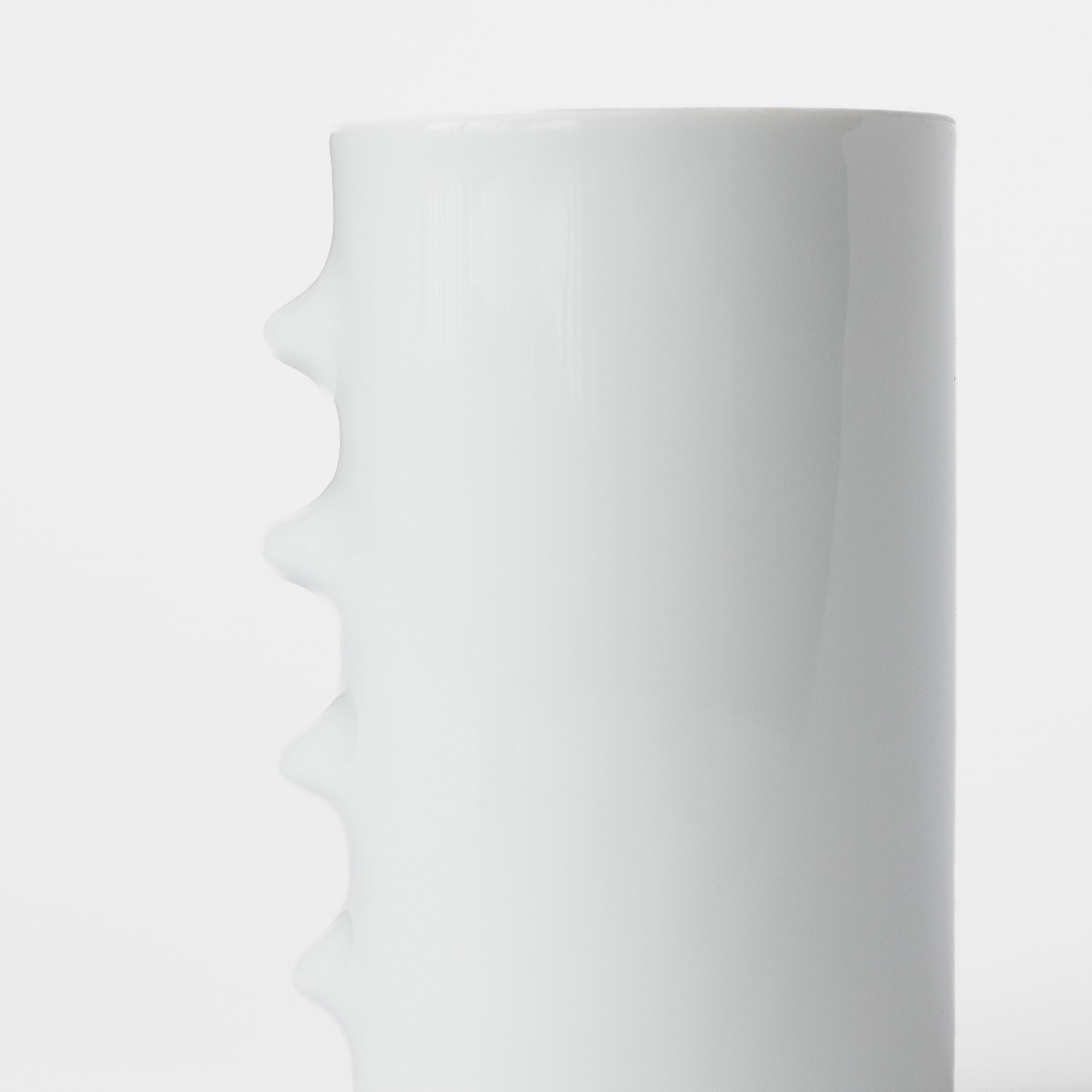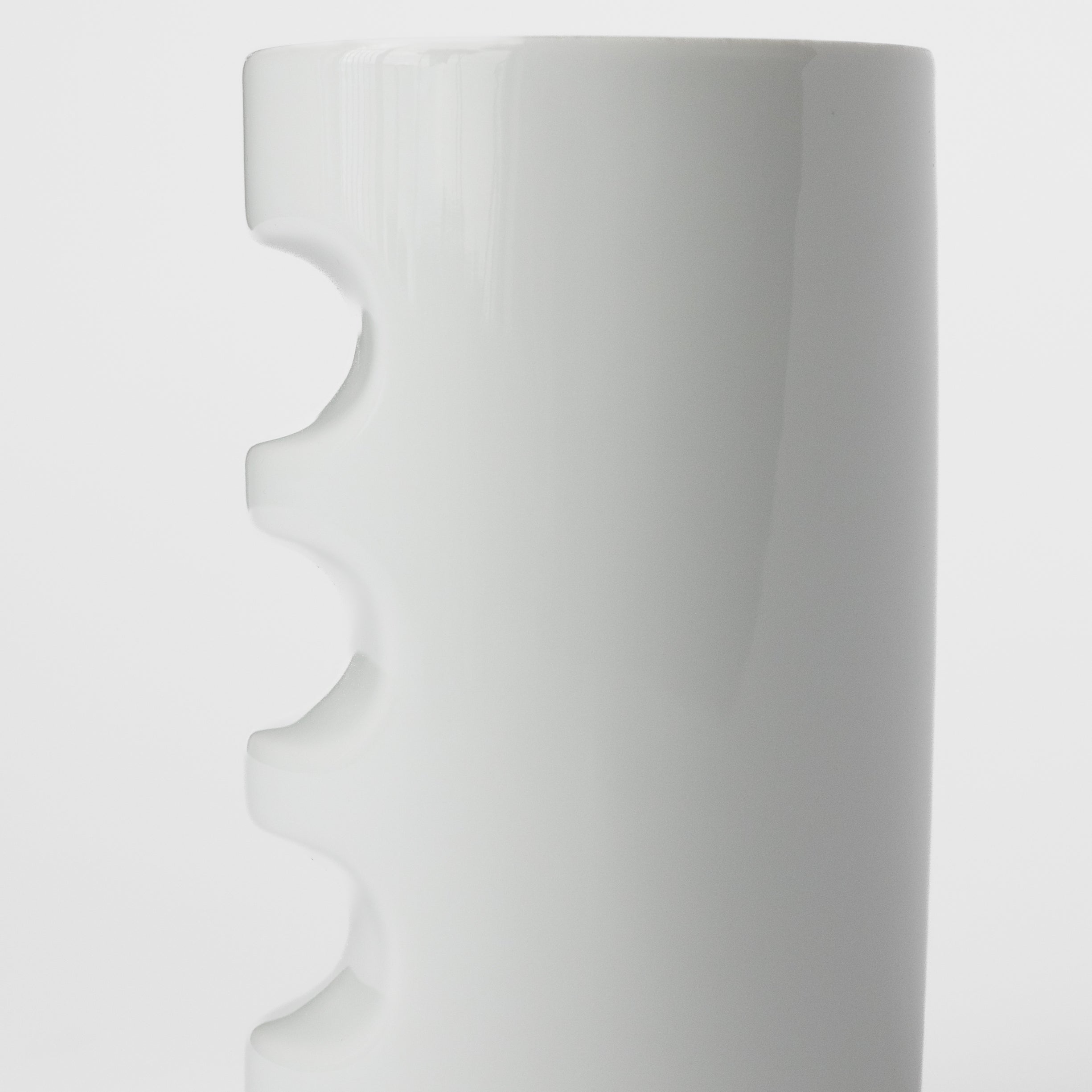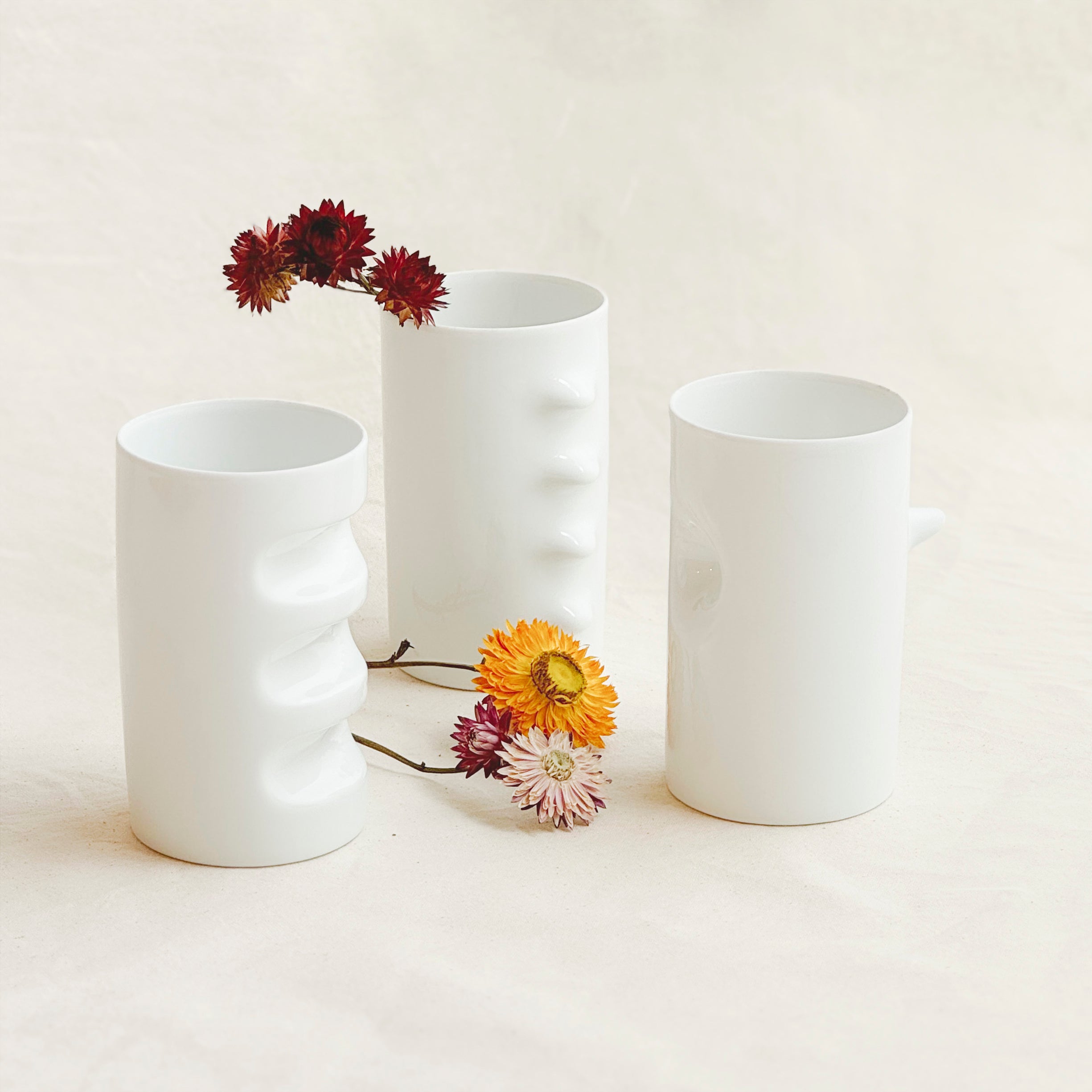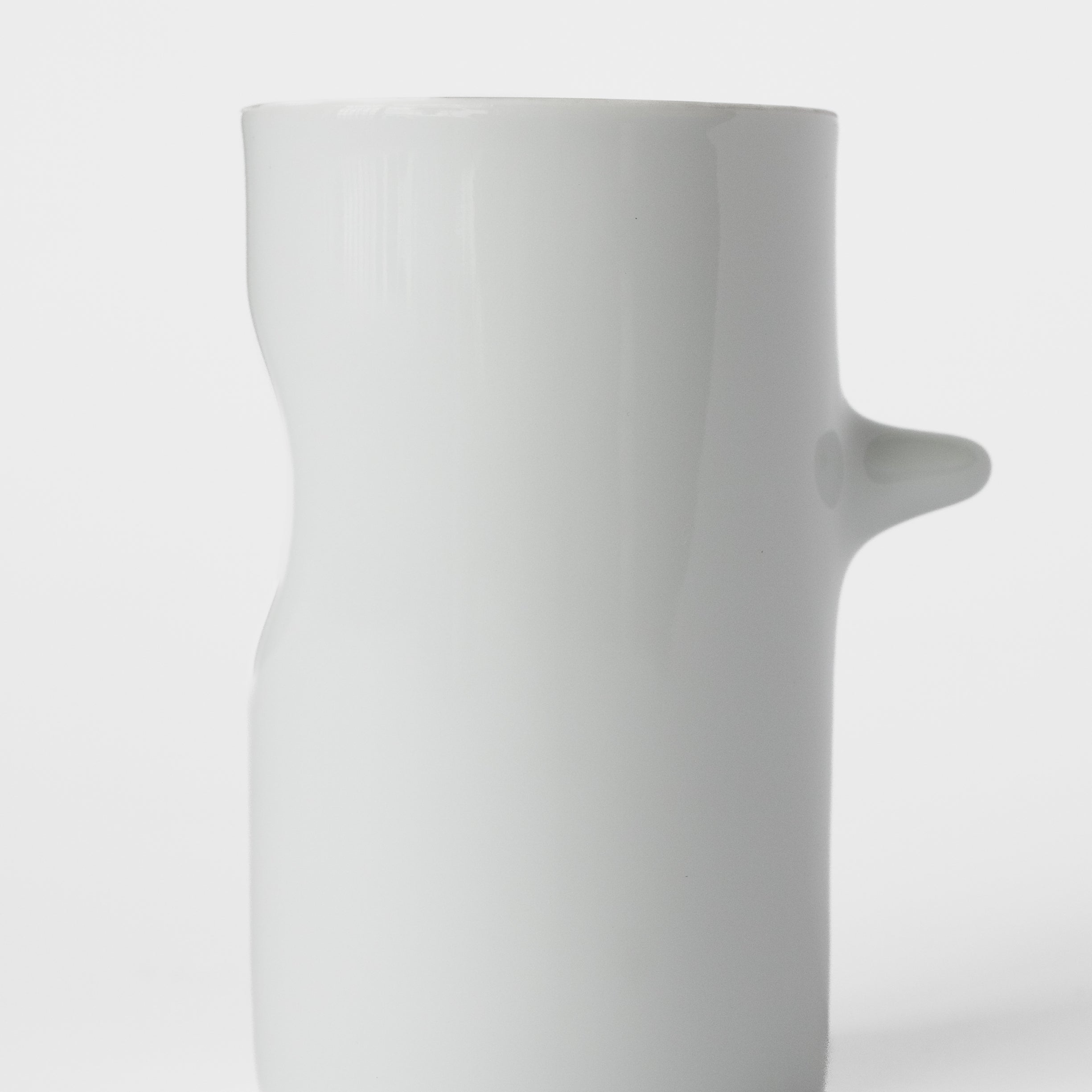 The Fancy Cup, designed by Masahiro Mori in 1969, is a delicate, translucent porcelain tumbler with a smooth finish and a unique shape. It can be used for cold drinks, as a vase, or as a decorative item. The cup comes in six tactile and individual shapes with a surface designed to perfectly fit your fingers. Made of quality, blue-toned porcelain, the tumbler has been in continuous production for over 50 years and in 2006 received the prestigious Good Design Award.