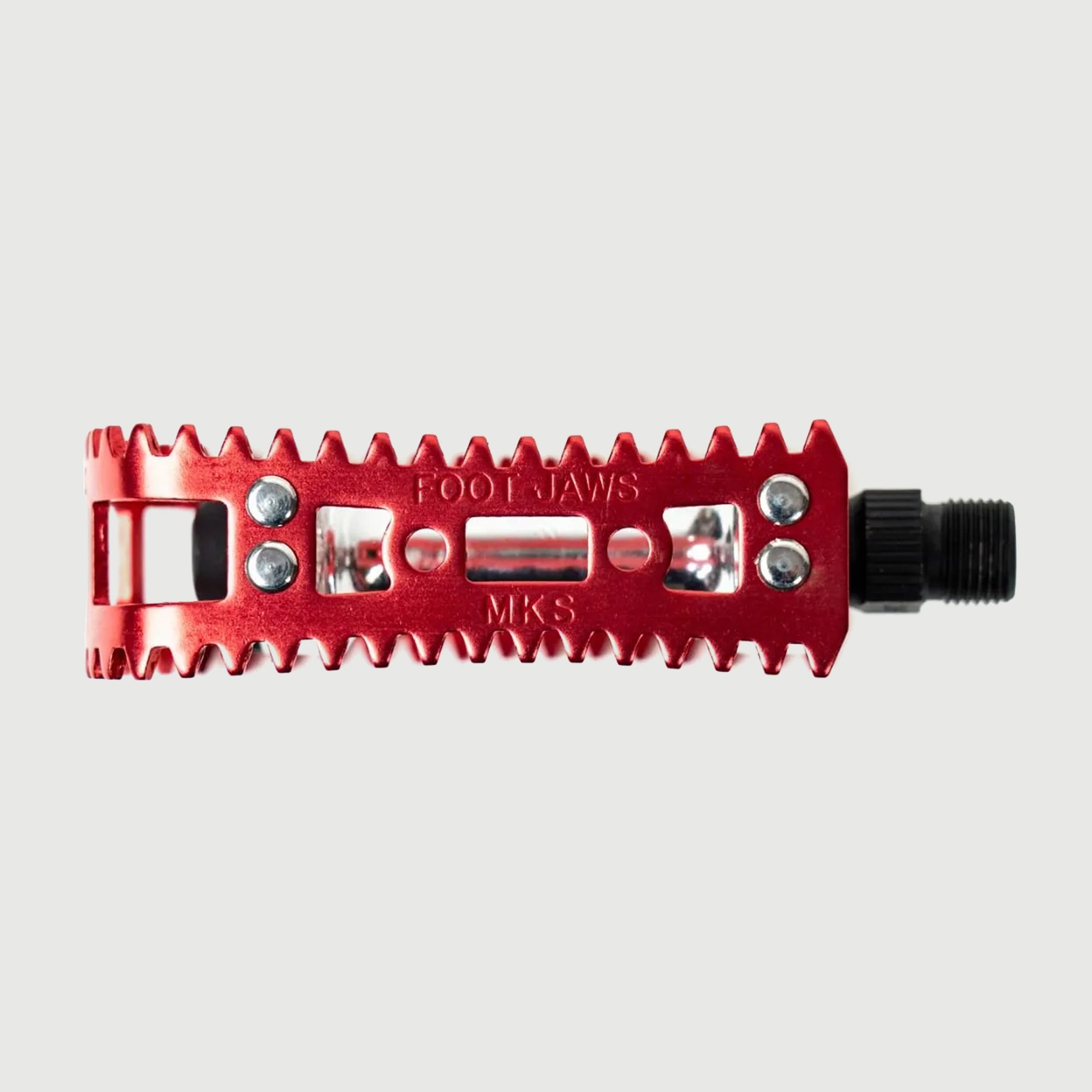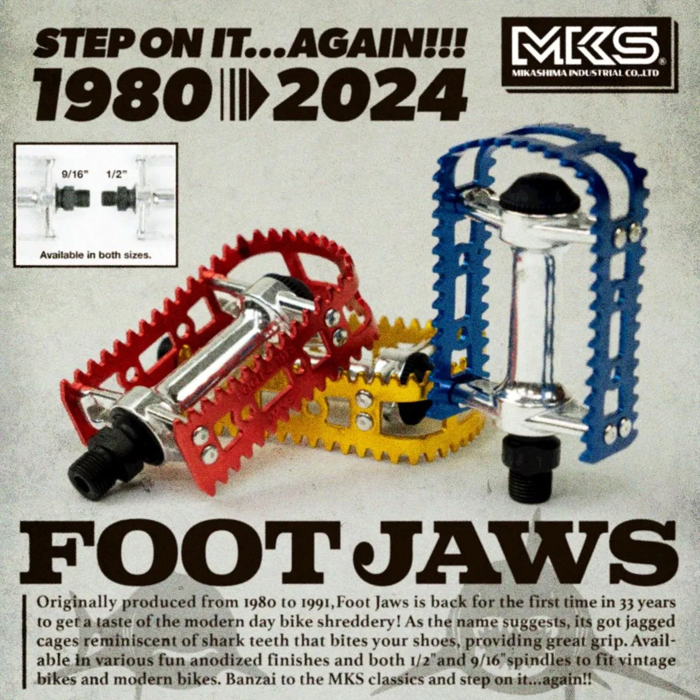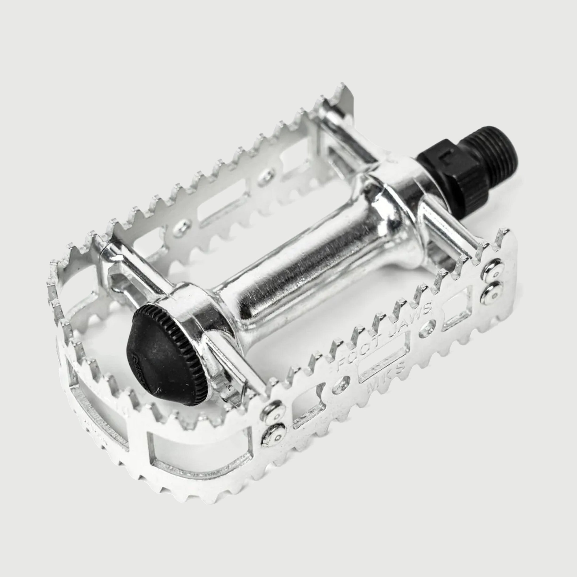 A revival of MKS’s iconic 1980–1991 BMX pedal, the "FOOT JAWS" returns after 33 years with its signature shark-tooth cage for unbeatable grip. Ideal for vintage MTBs, commuters, and more.