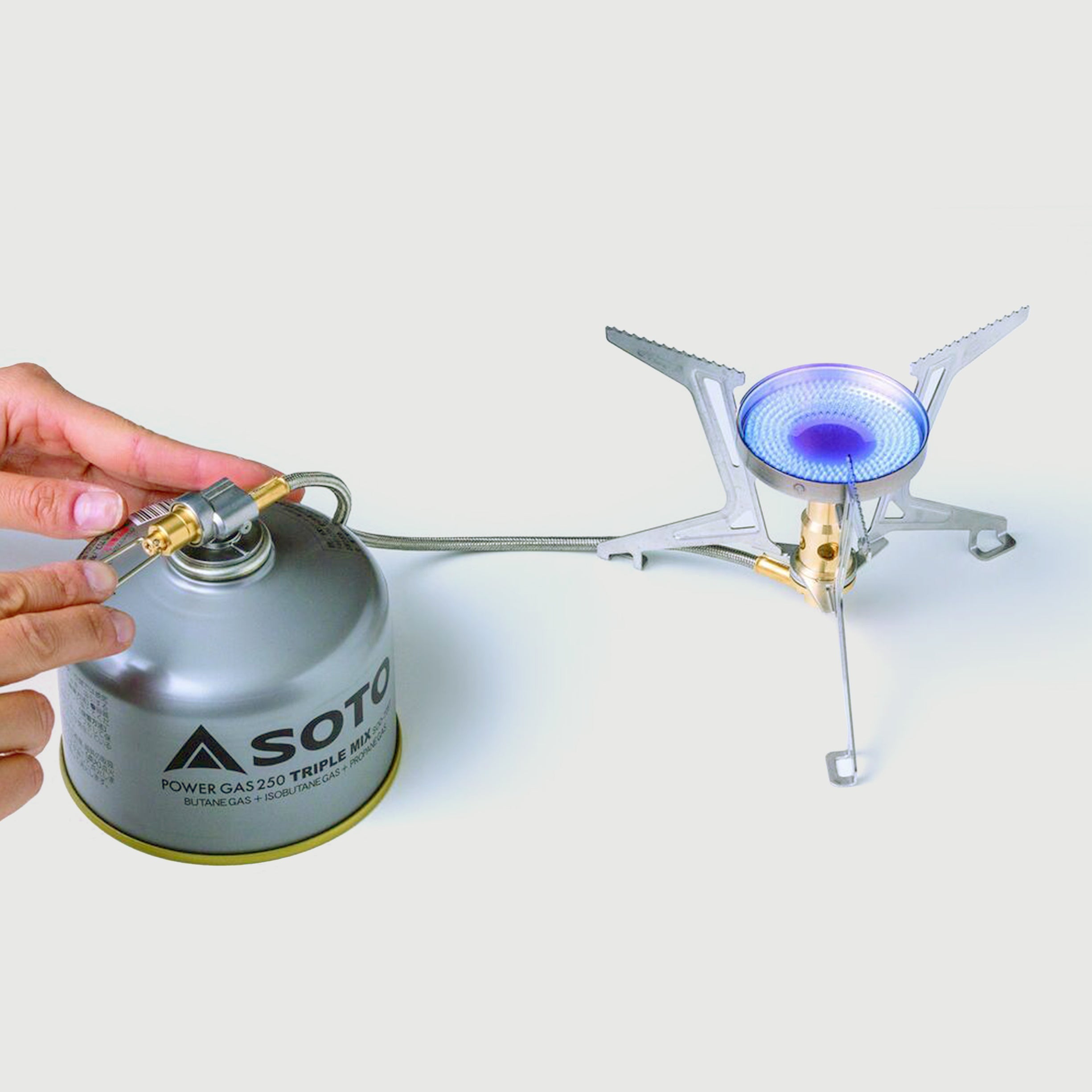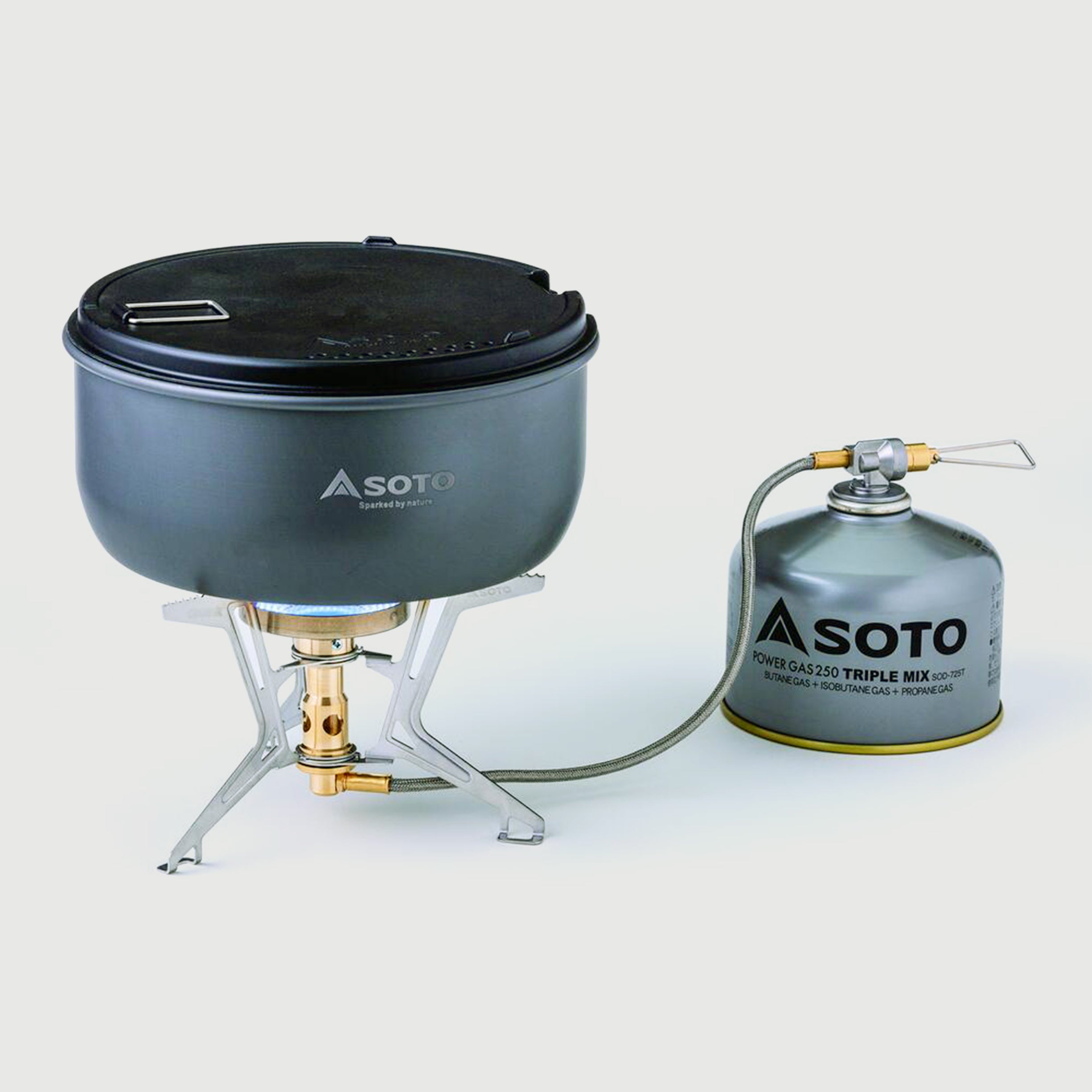 The stove features Soto’s Micro Regulator technology, ensuring a steady flame even in cold weather and when fuel levels are low. The concave burner head, with over 300 sub-flames, delivers powerful, wind-resistant performance, while the flame control knob, located on the gas adapter, allows for safe and precise adjustments away from the burner.