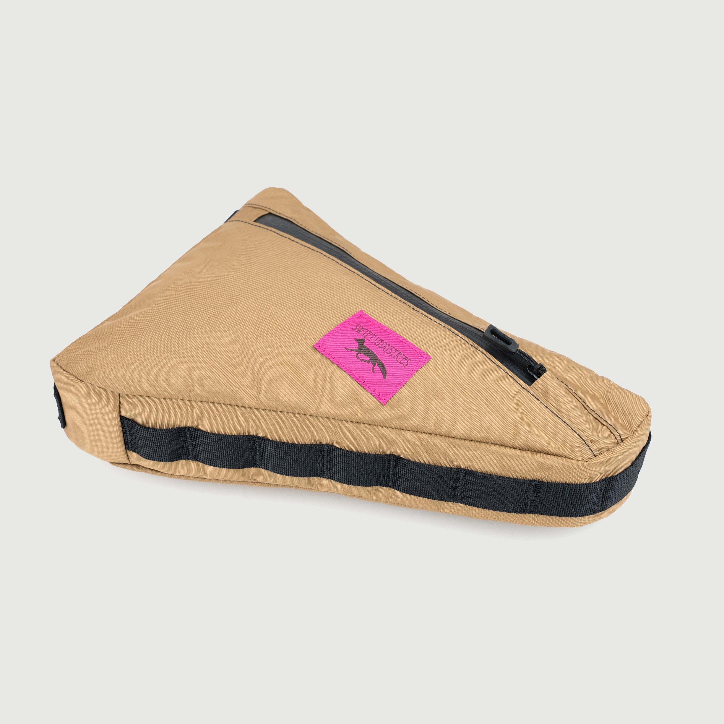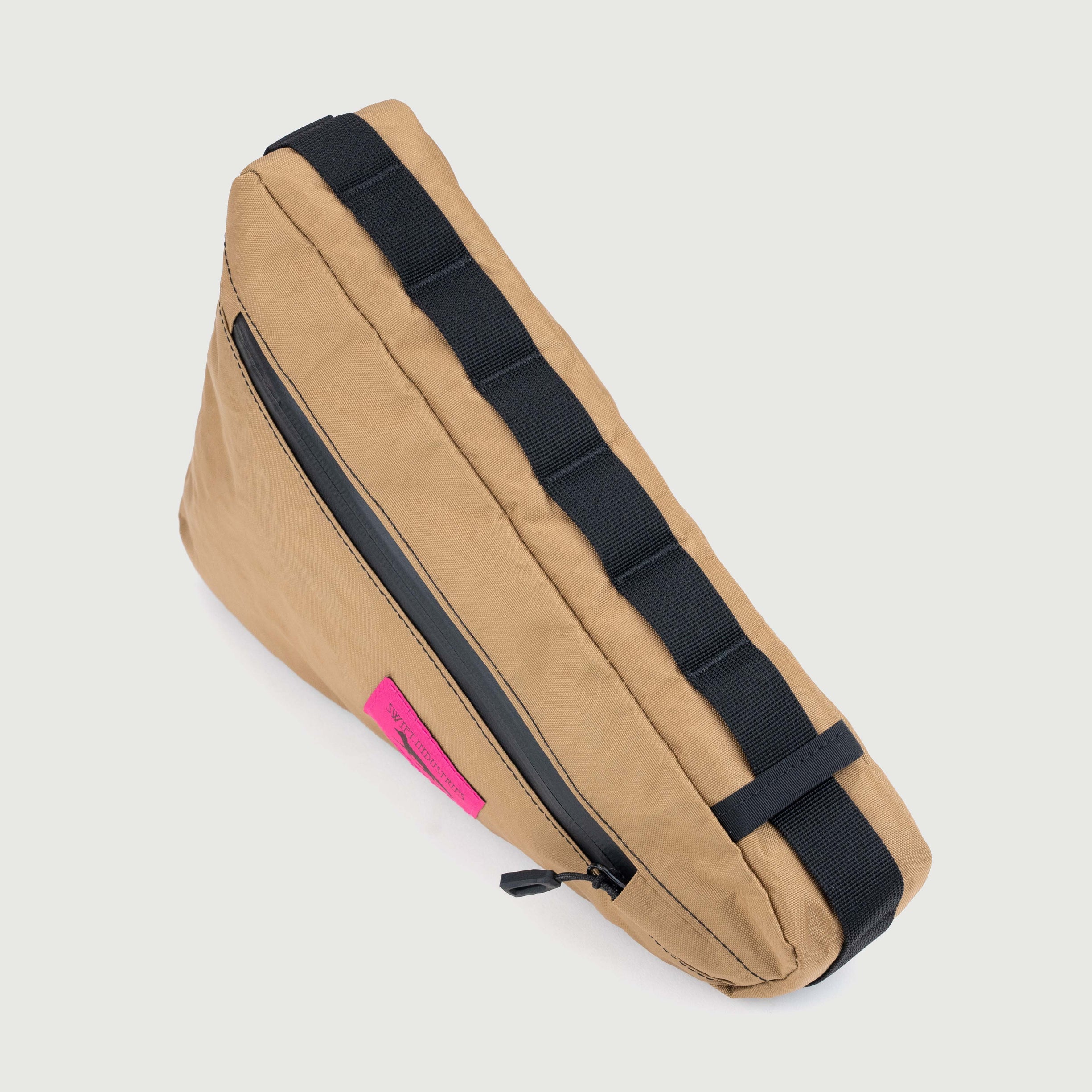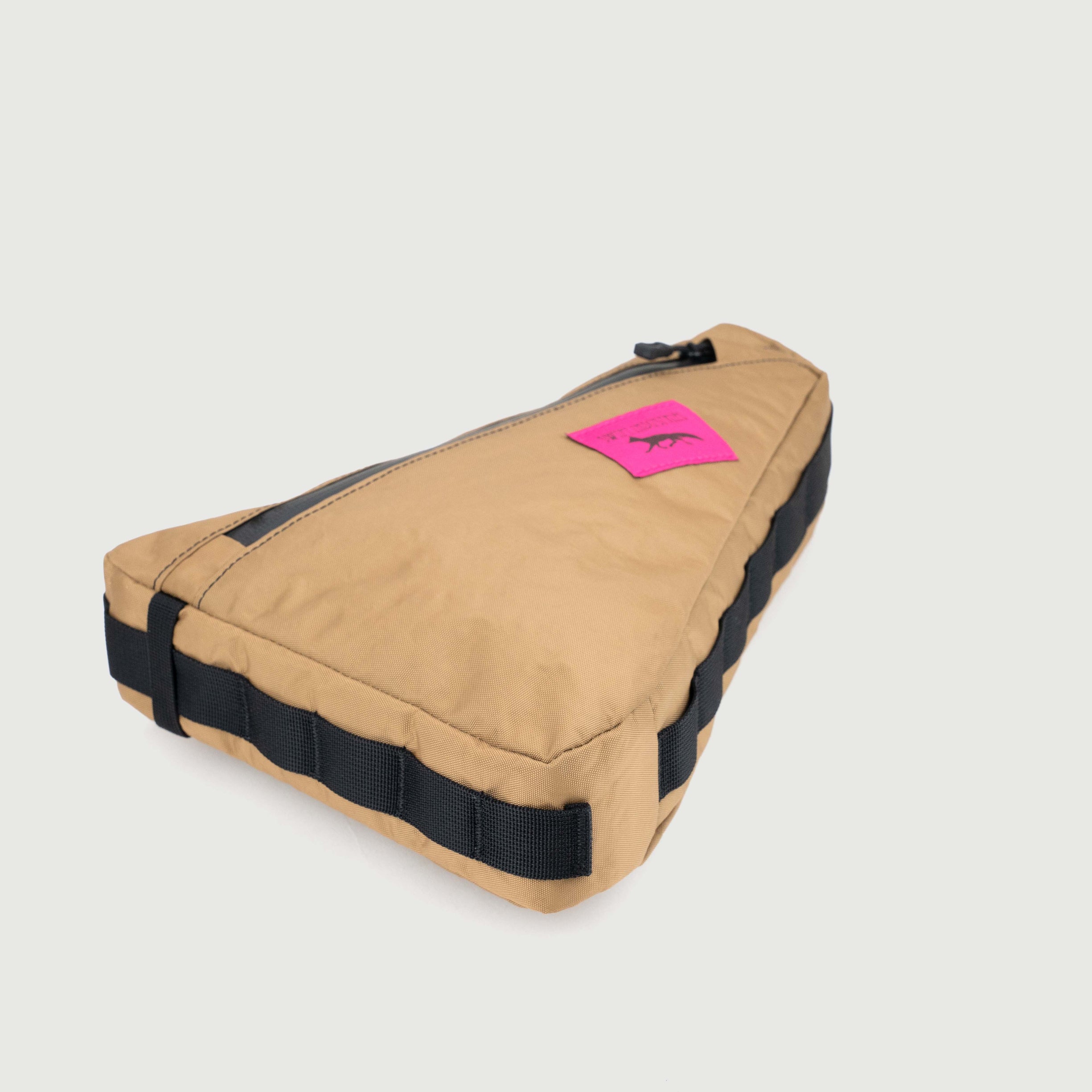 A versatile frame bag that works equally on tough trails or casual commutes. It stores up to 3 litres out of the way with a spacious main compartment (with hydration hose outlet) and a shallow pocket on the non-drive side to keep essentials at hand. The bag’s adjustable webbing daisy chain ensures a snug fit across different frame sizes.