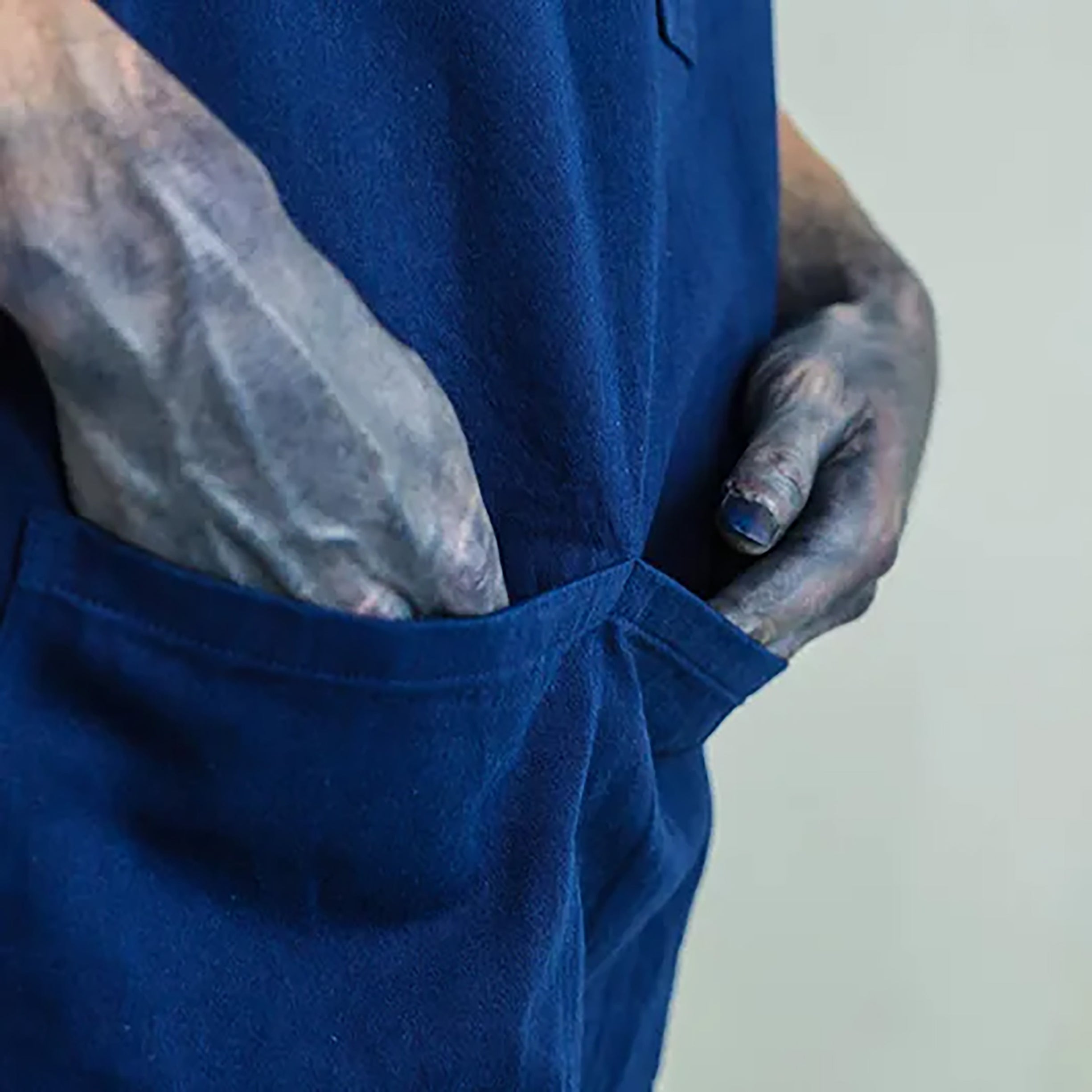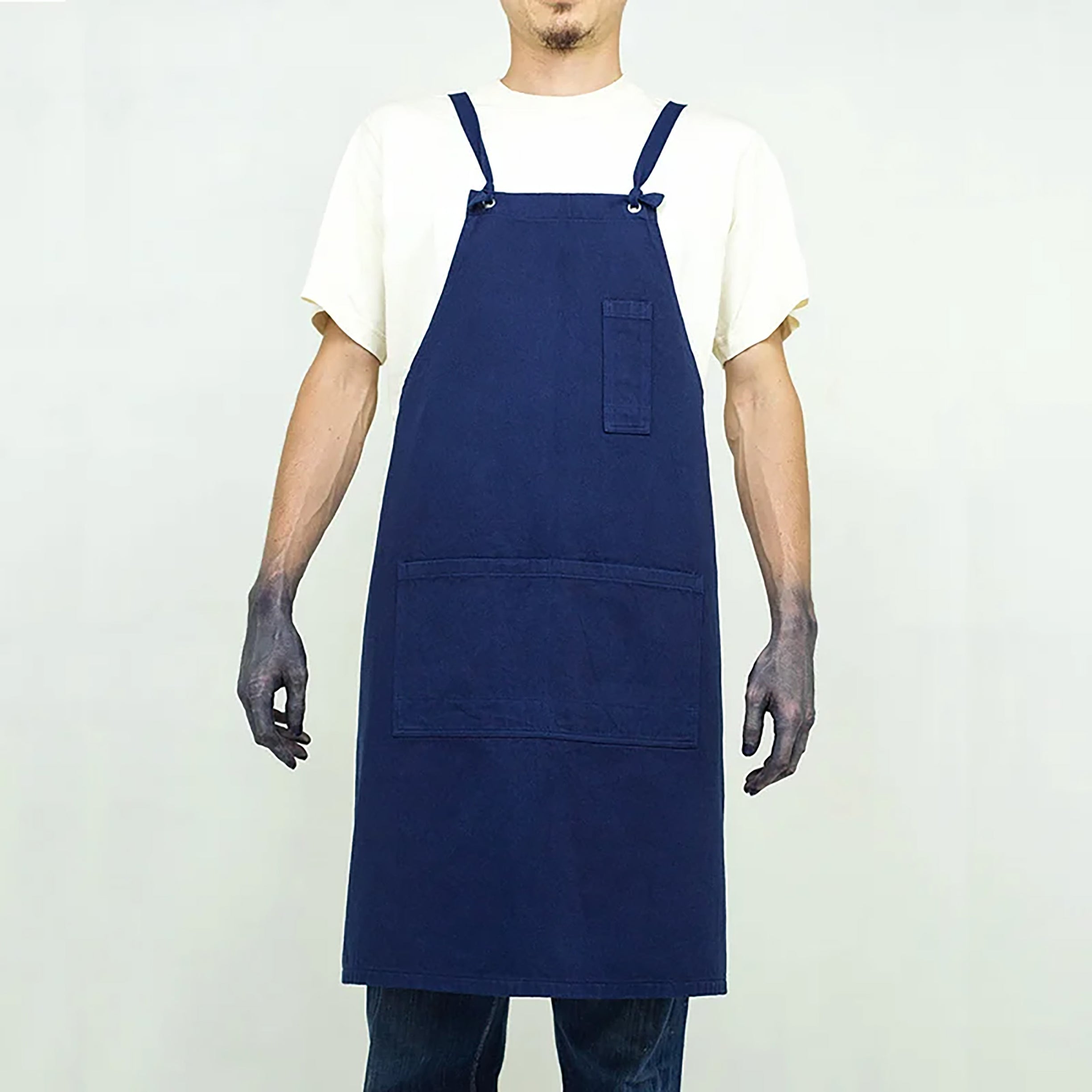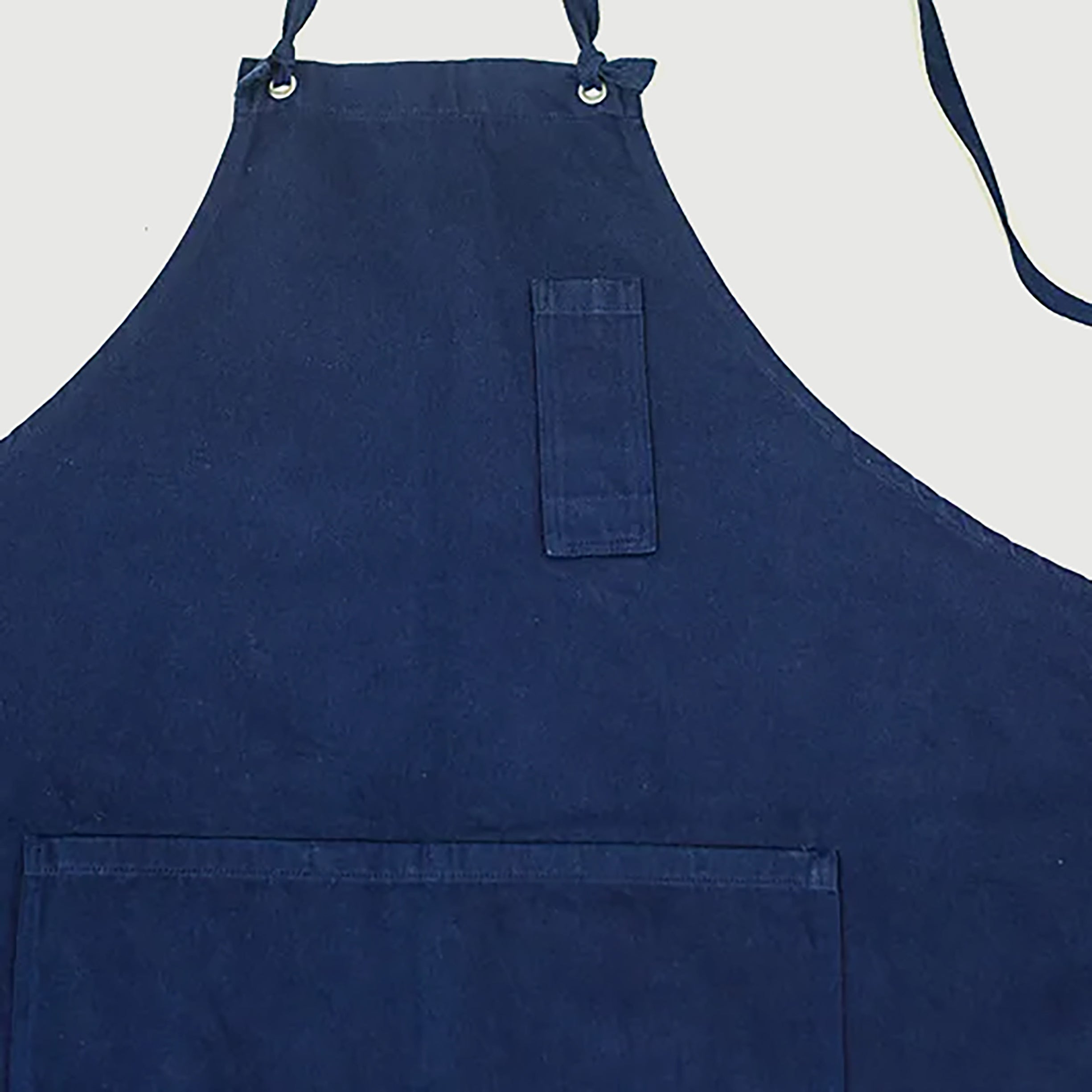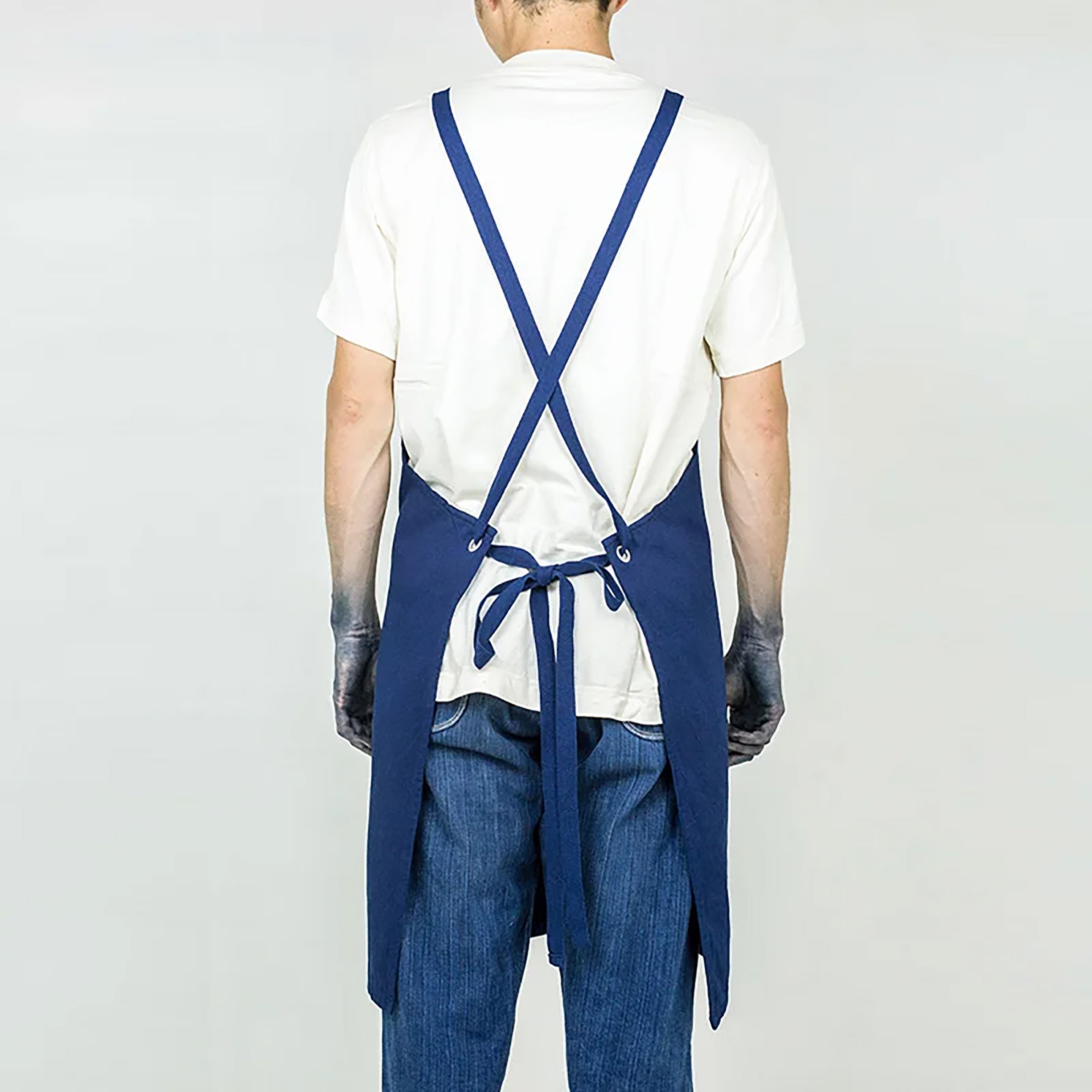 Made from twill cotton with cotton warp yarn and linen weft yarn for a rich texture, this apron features a breast pen pocket, a reinforced large front pocket, and cross-back button straps for neck comfort.