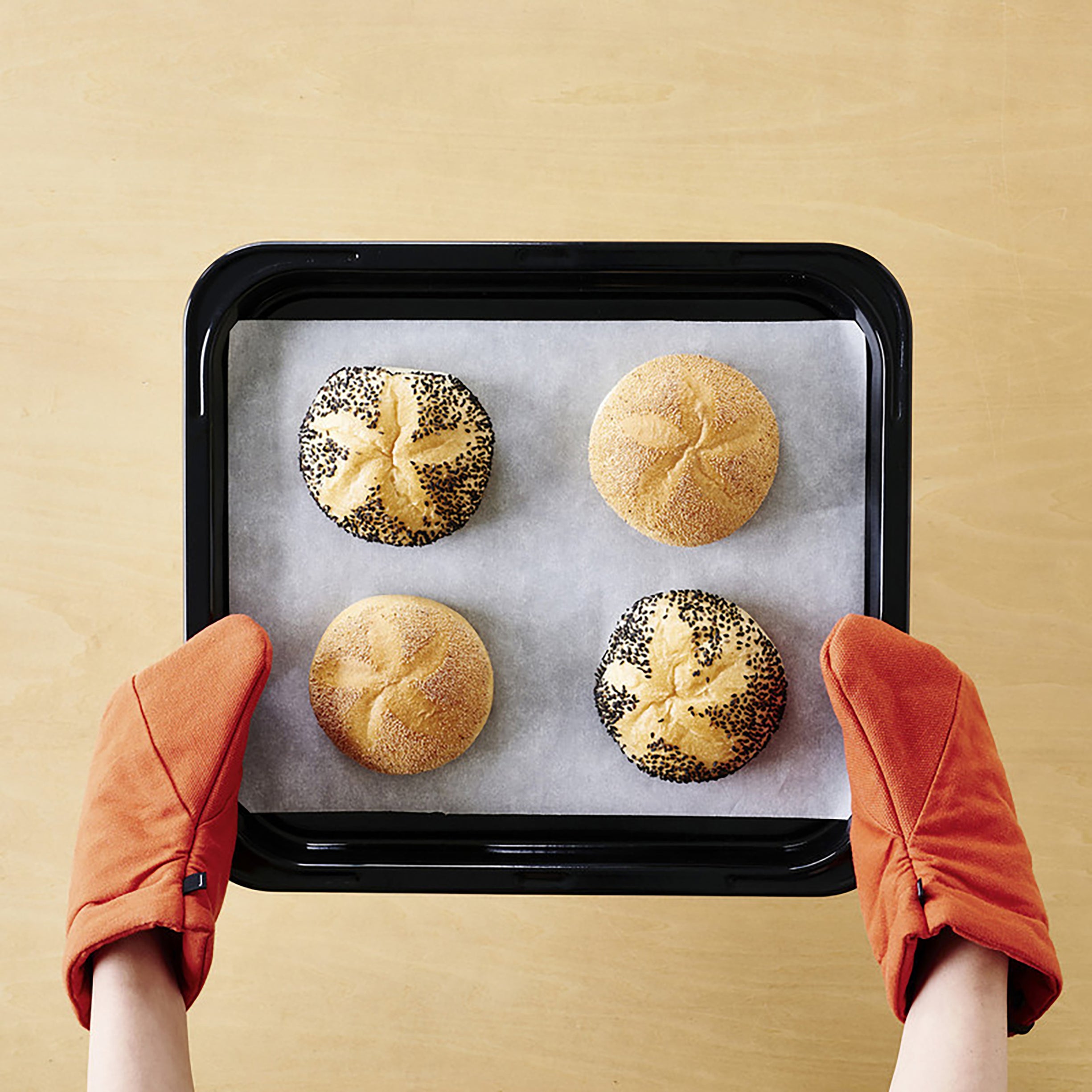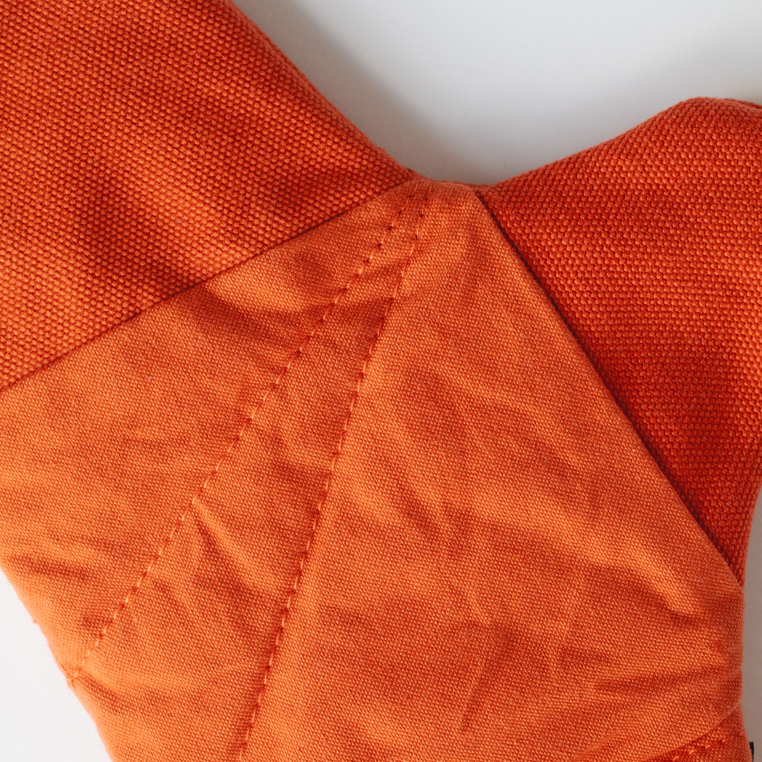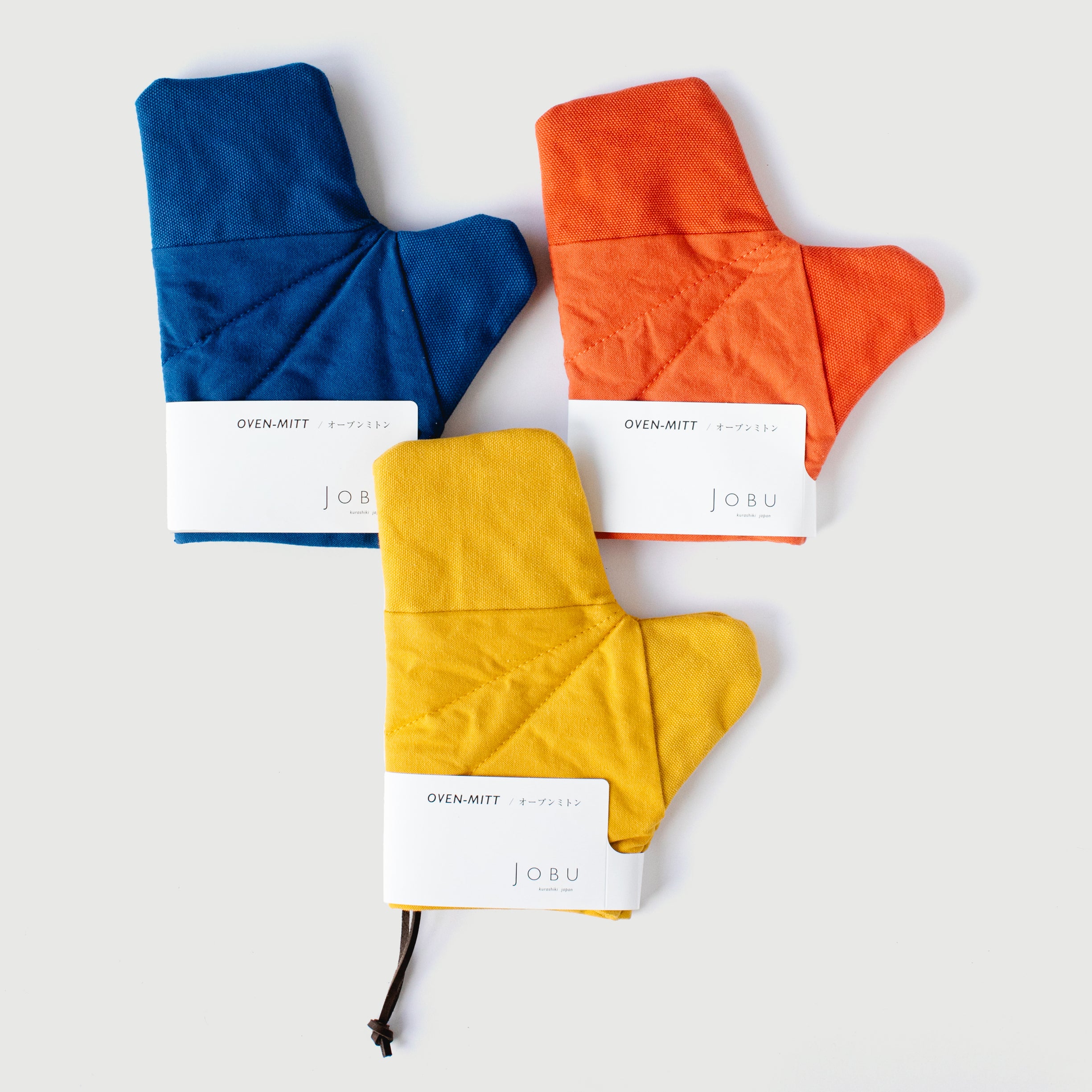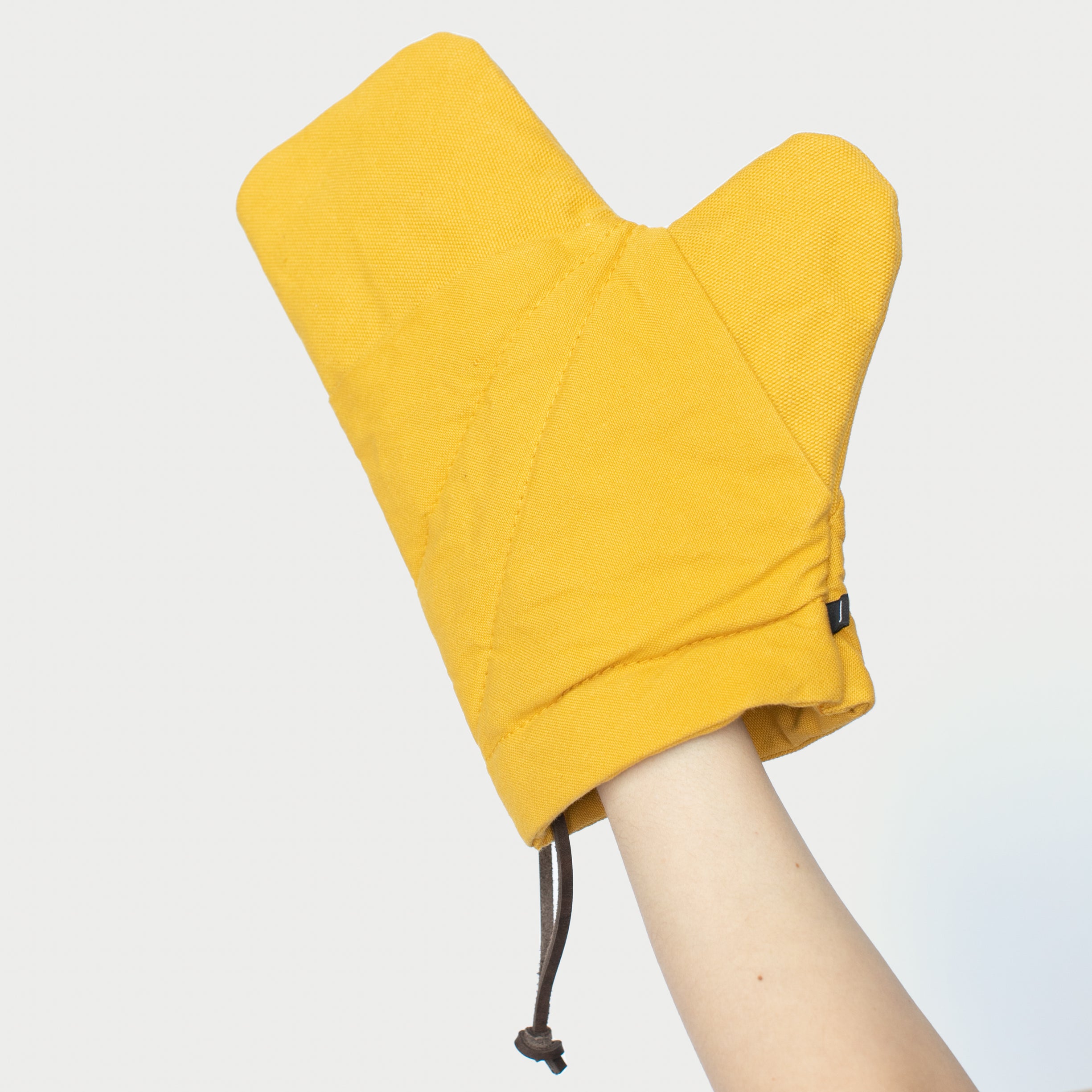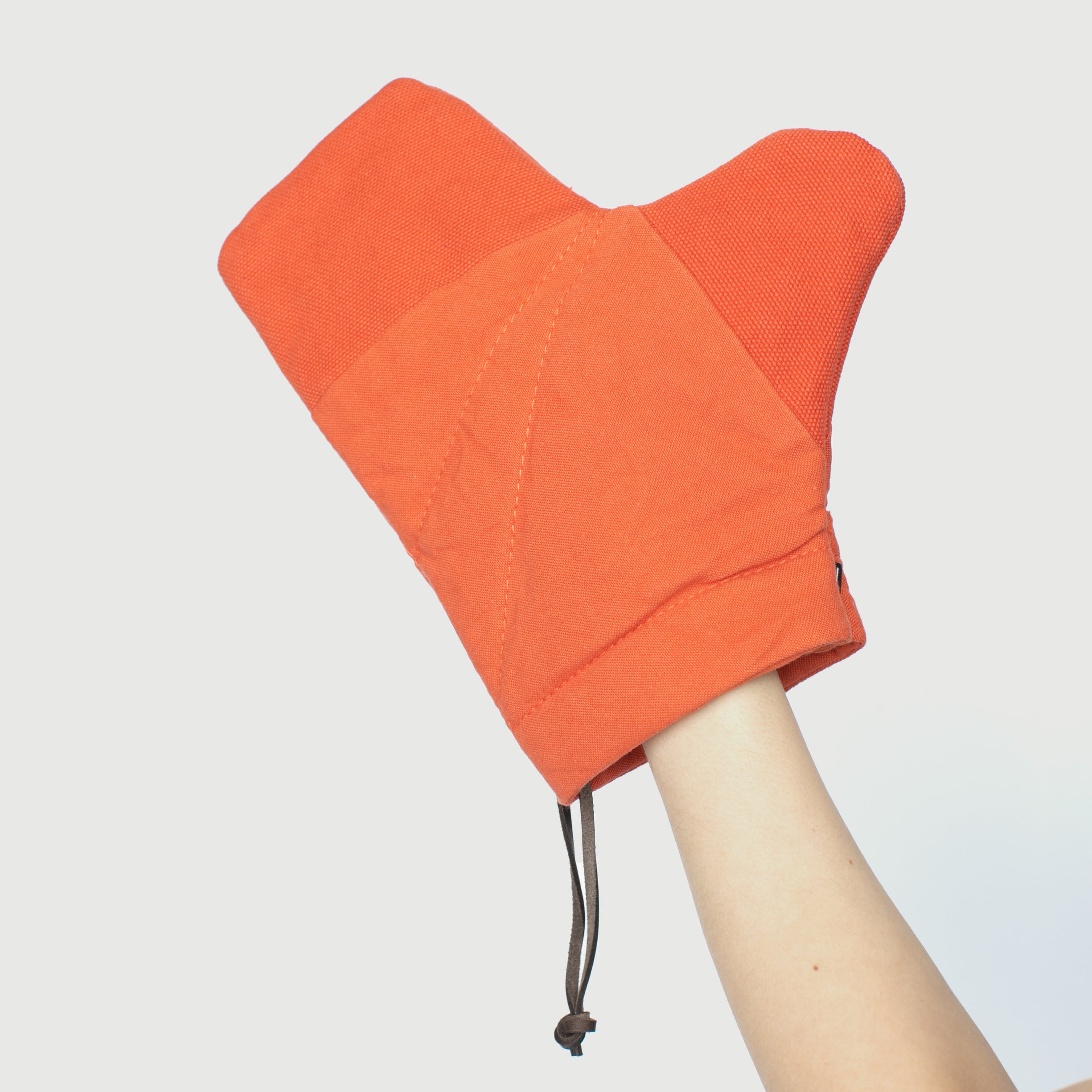 An oven mitt made from Kurashiki sailcloth* constructed with two different thicknesses of canvas. The thicker canvas protects the fingers and the more flexible one, your palm. The stitching is carefully designed to ensure a comfortable fit.