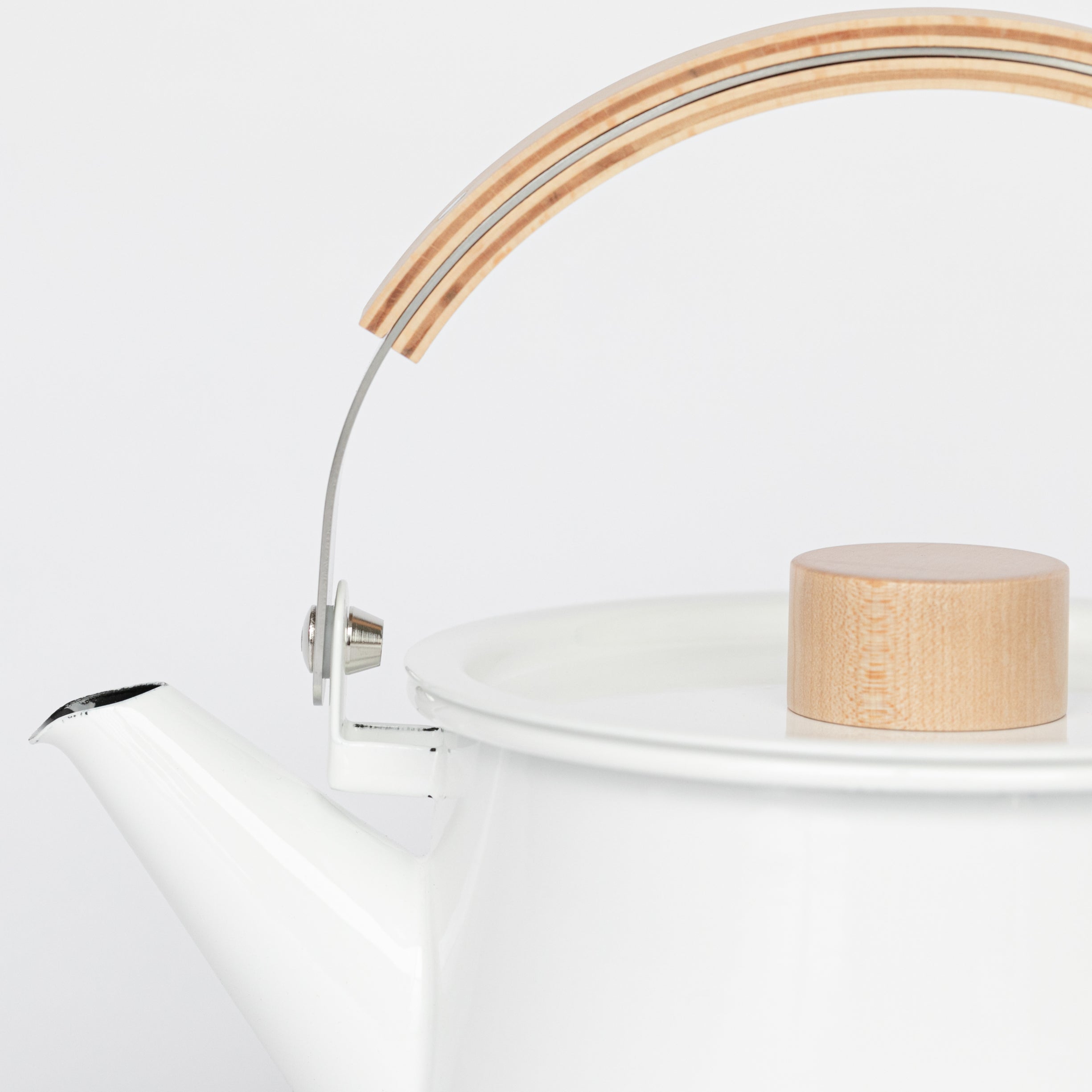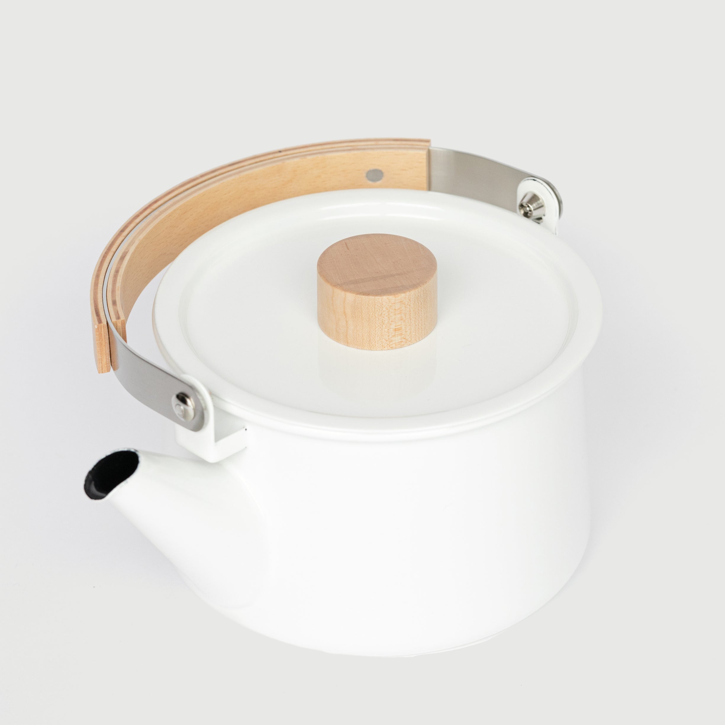 A beautiful enamel kettle designed by Makoto Koizumi for Kaico. It heats quickly and is easy to clean, while the maple accents to the handle and lid make it comfortable to touch when hot. Its also uitable for use on induction, gas and electric stovetops.