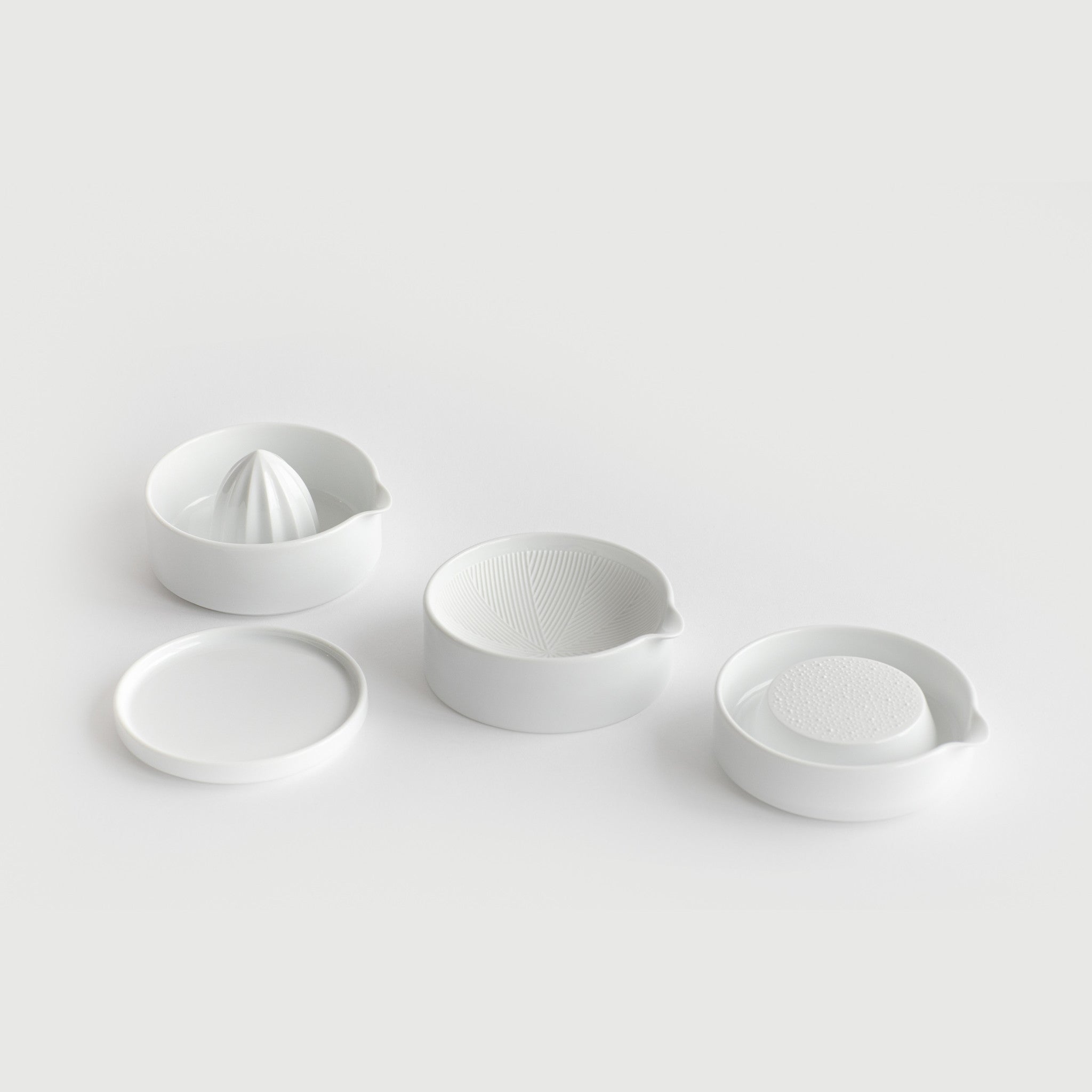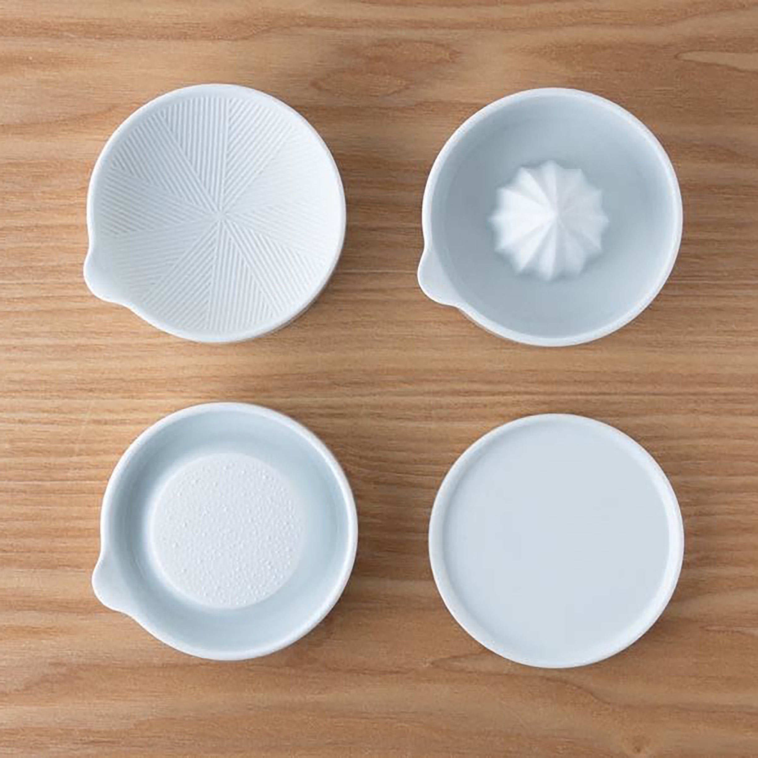 Combining the grater, squeezer and mortar, this four-piece set also includes a lid. The lid can be used to cover the grater or mortar as well as function as a small plate. The grater is for ginger, garlic or wasabi and the juicer can be used for citrus fruits. The mini mortar is useful for grating small amounts when needed.