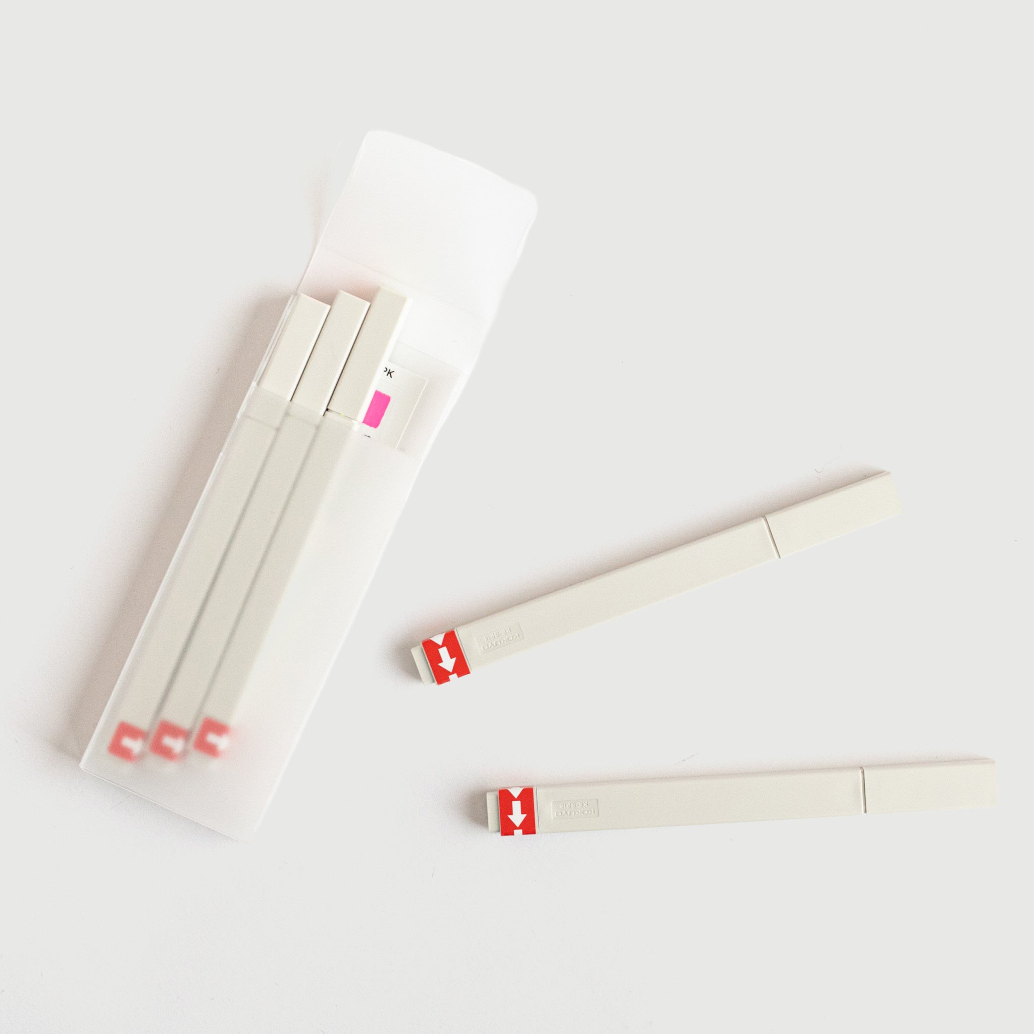 This refillable, non-permanent set include the colours blue, green, orange, pink and yellow.
