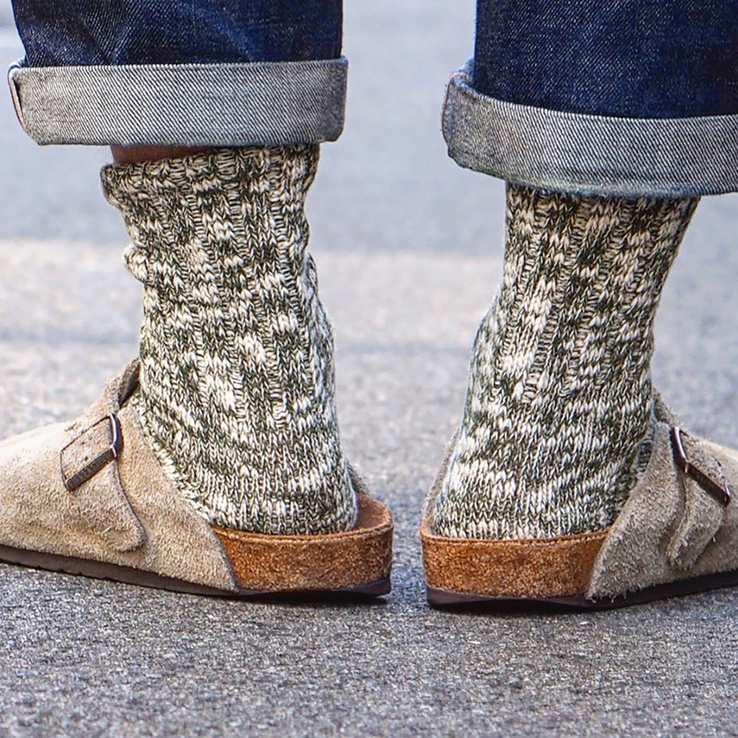 Standard knitting machines use 170-180 stitches, whereas the older machines use 60 stitches - the looser knit allows a thicker yarn and the low gauge means the sock better takes the shape of the wearer and makes it ultimately more comfortable.