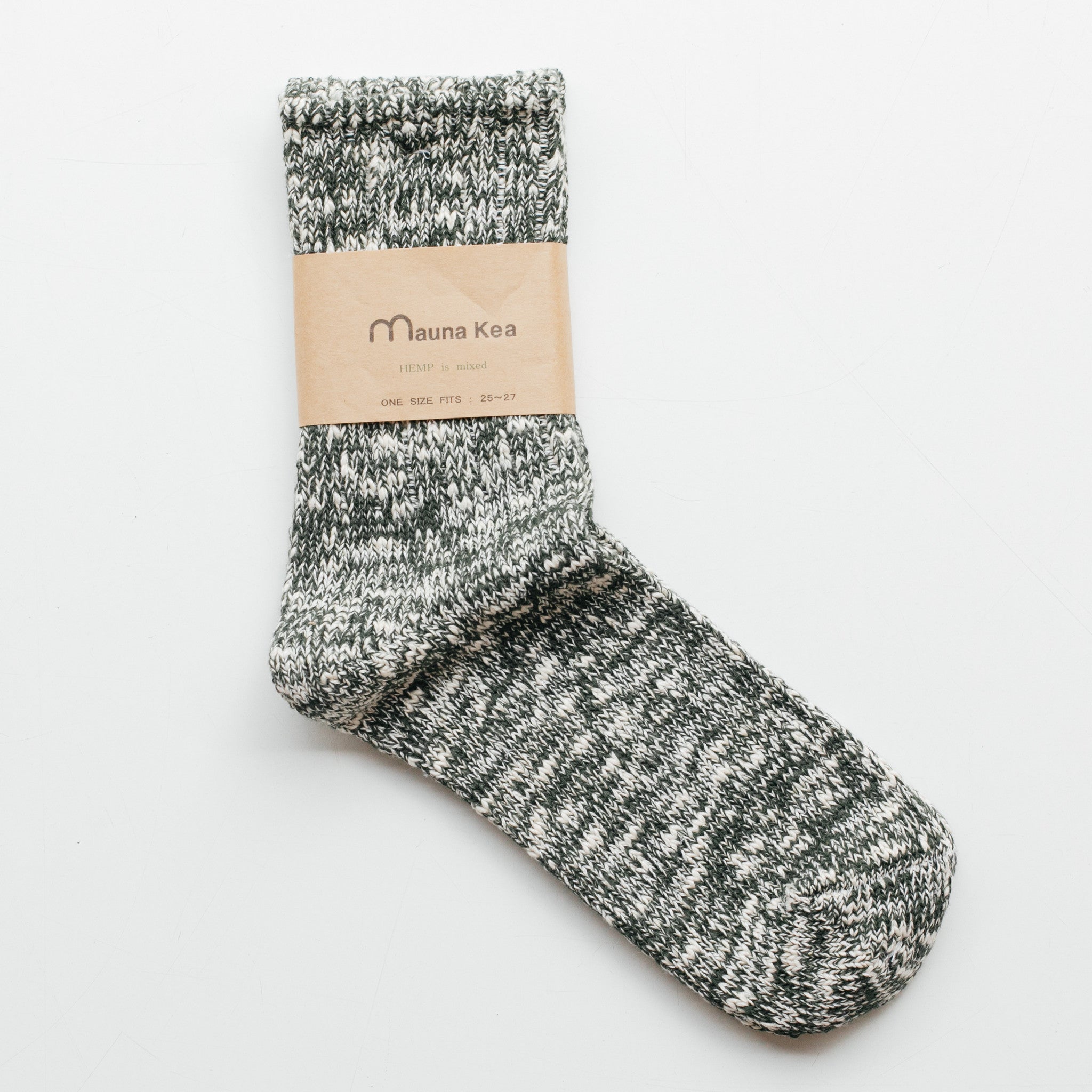 Mauna Kea produce socks on vintage machines using a hemp / cotton blend to ensure high moisture absorption and in a tubular shape with a thick yarn and loose knit to make them supremely comfortable.