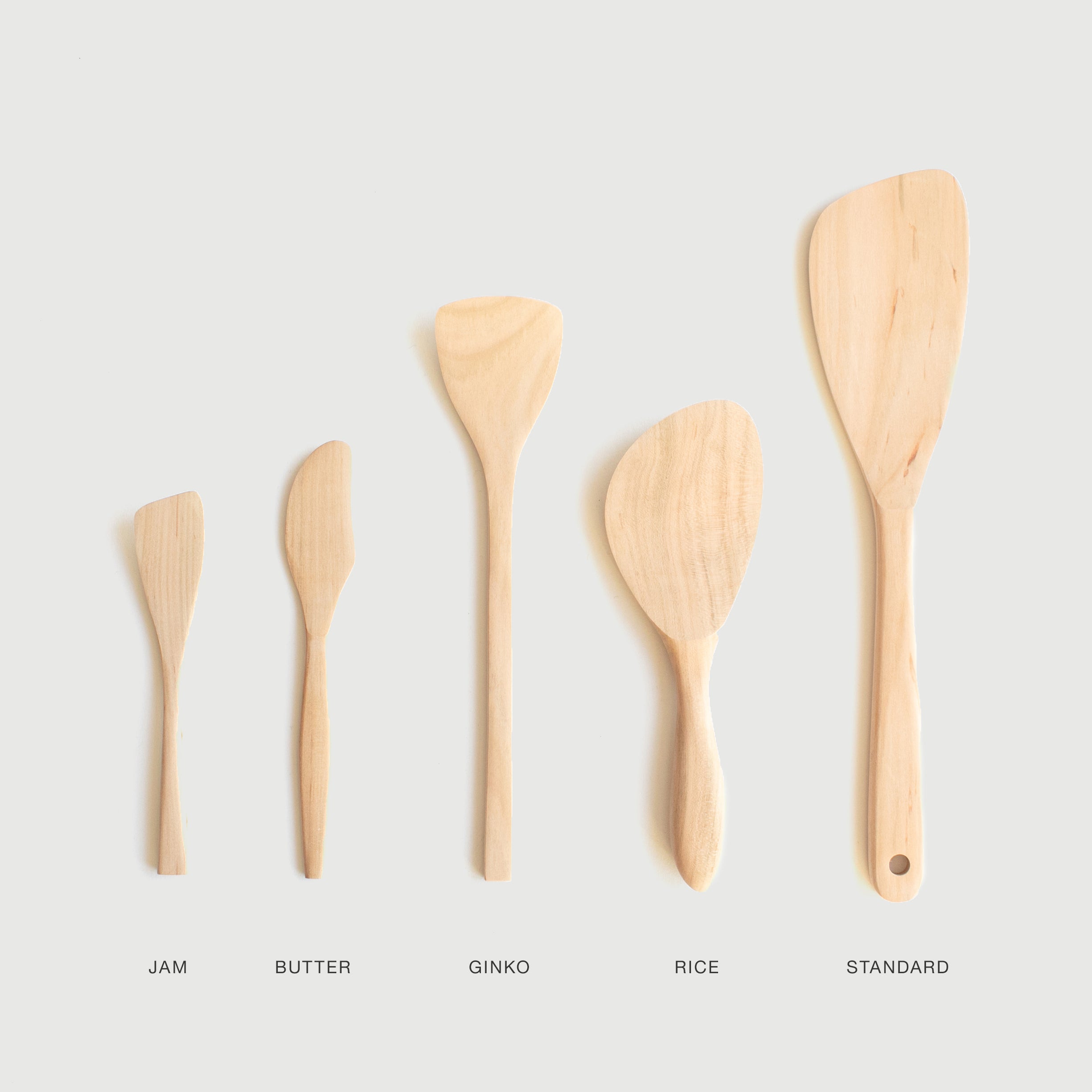 The Ginkgo, Rice and Standard Spatulas are great for use with enamelware, non-stick or cast-iron cookware while the little Butter and Jam Spatulas are perfect for scraping out the bottom of jars to avoid waste.