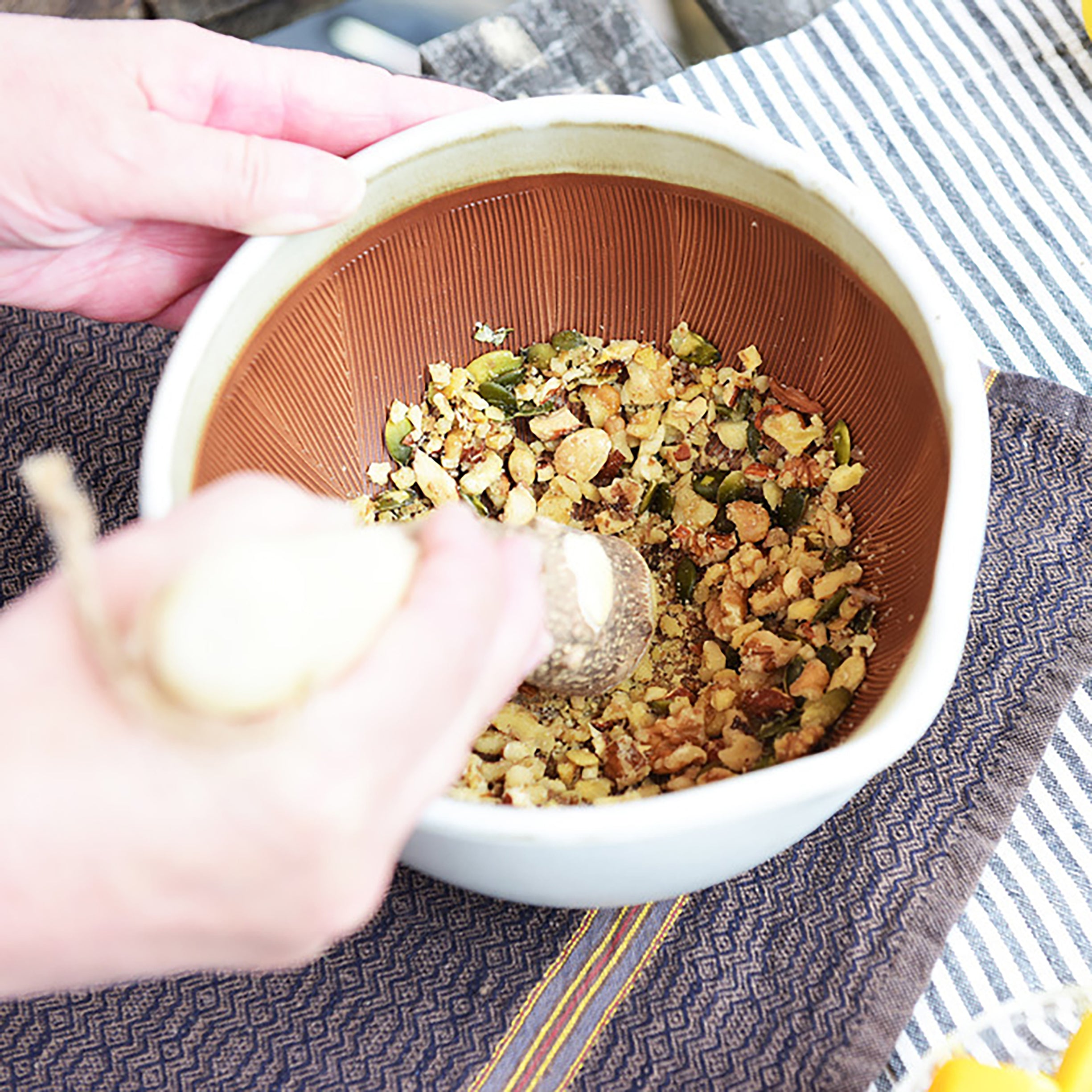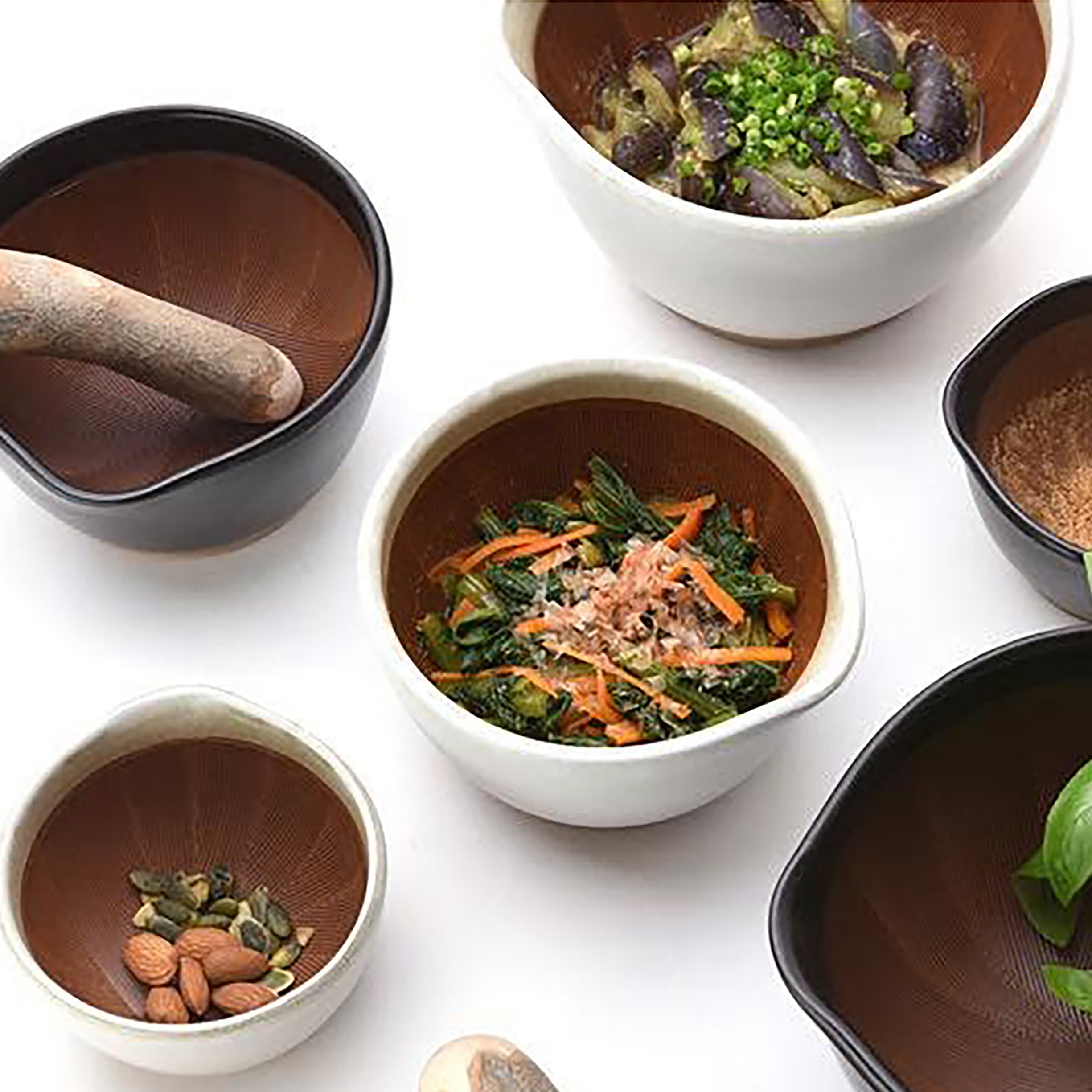 Suri-kogi and Suri-bachi are a traditional Japanese pestle and mortar, commonly used for grinding sesame seeds and spices, as well as being used to make a fine paste or dressing. The grinding grooves inside the mortar are shaped by hand and glazed, reducing odours and making it easier to clean. The mortar comes with a silicone base to prevent slipping when in use.