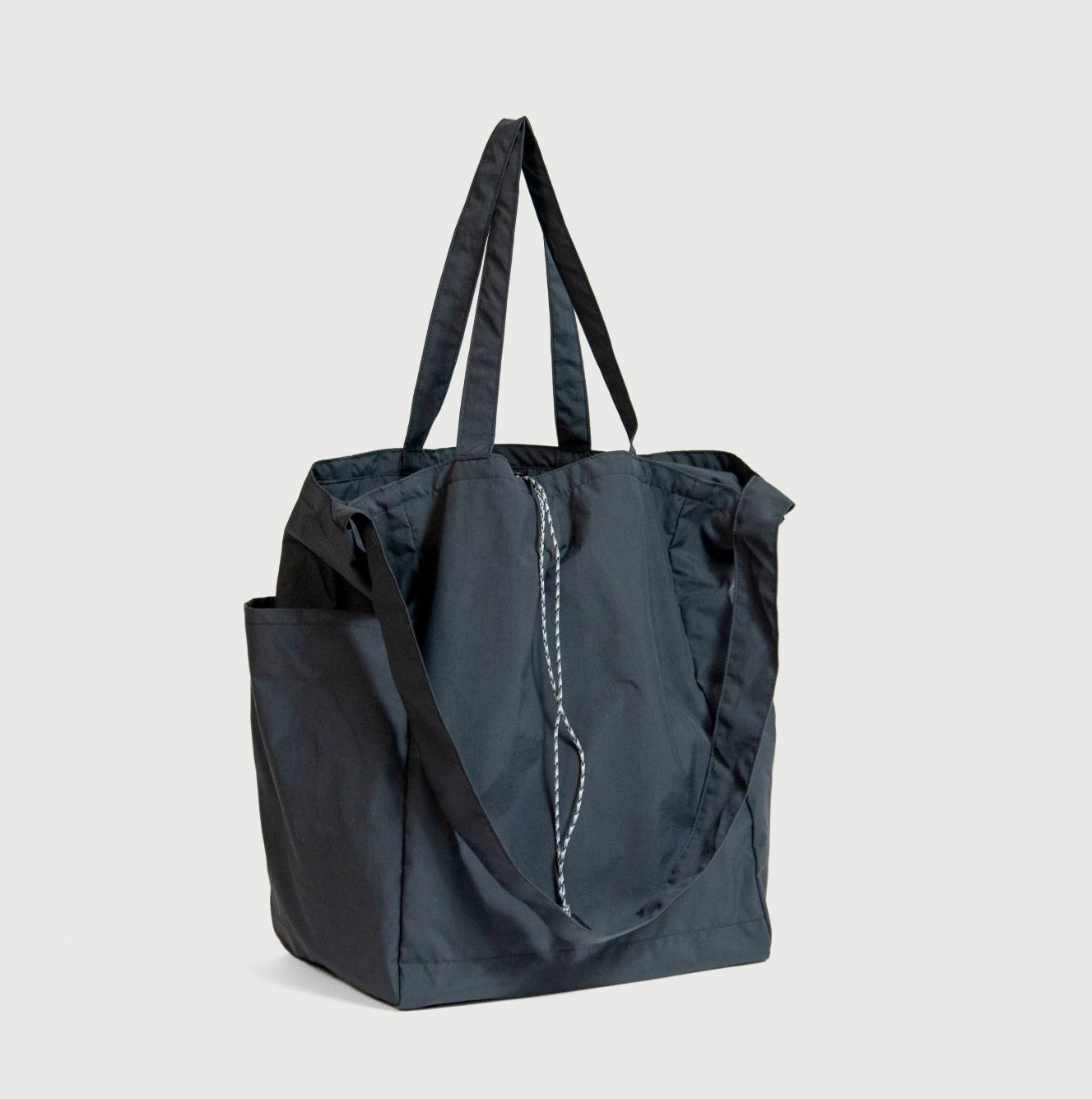 The top of the tote can be quickly opened and closed with the cord drawstring and stopper. Featuring two inner pockets and one outer pocket to the side, the bag can be used daily or folded into its inner pocket and used as an extra bag for travel or for days when you need to carry more.