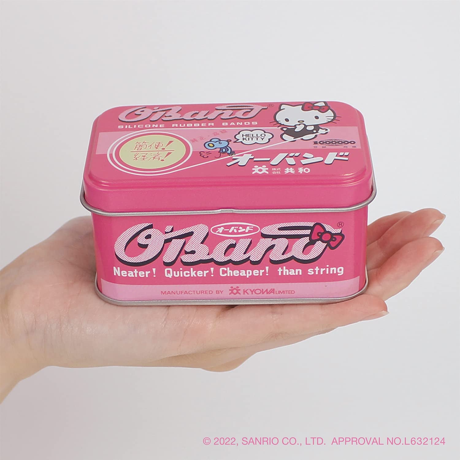 A cute, palm-sized O'band x Hello Kitty Can contains transparent, pink silicone rubber bands.