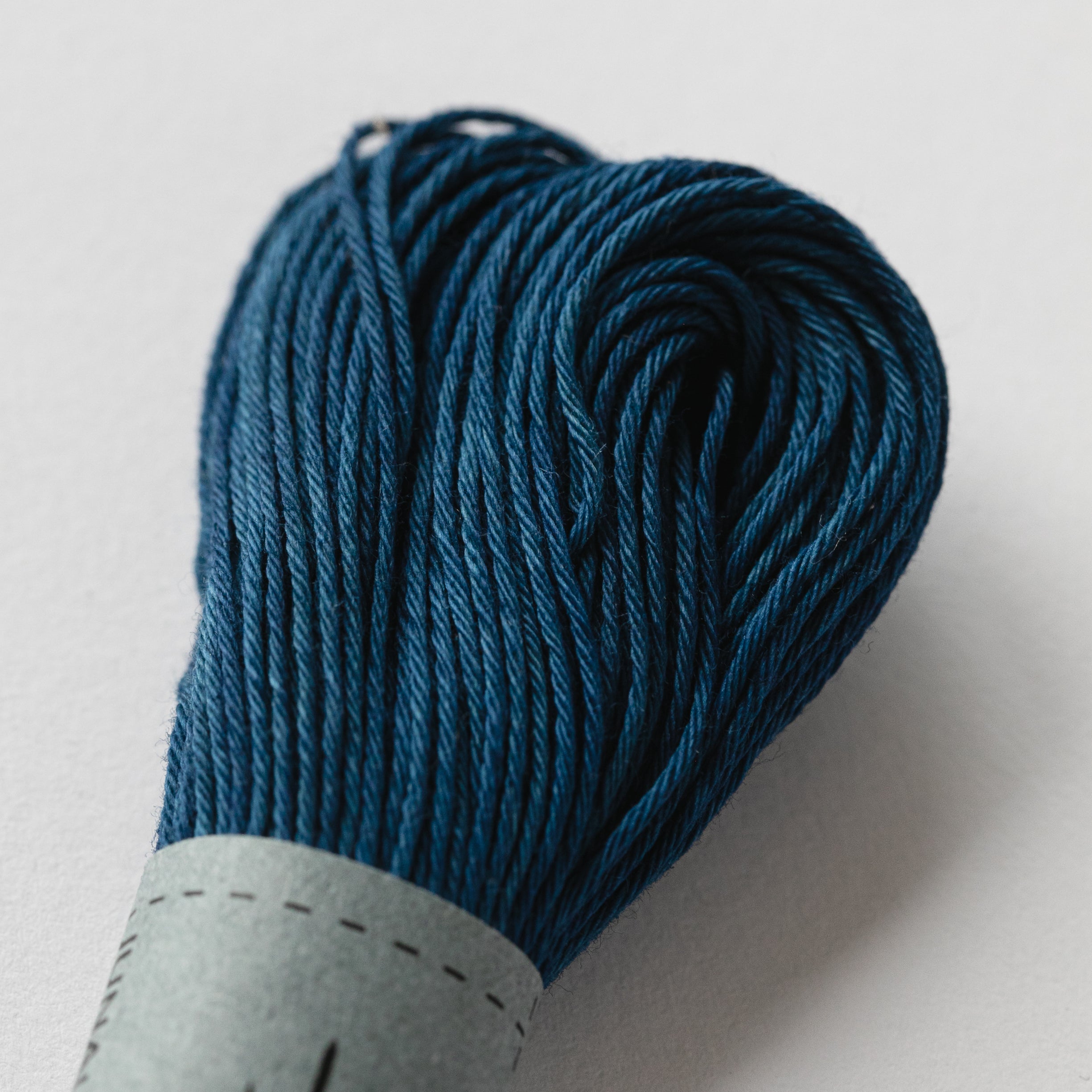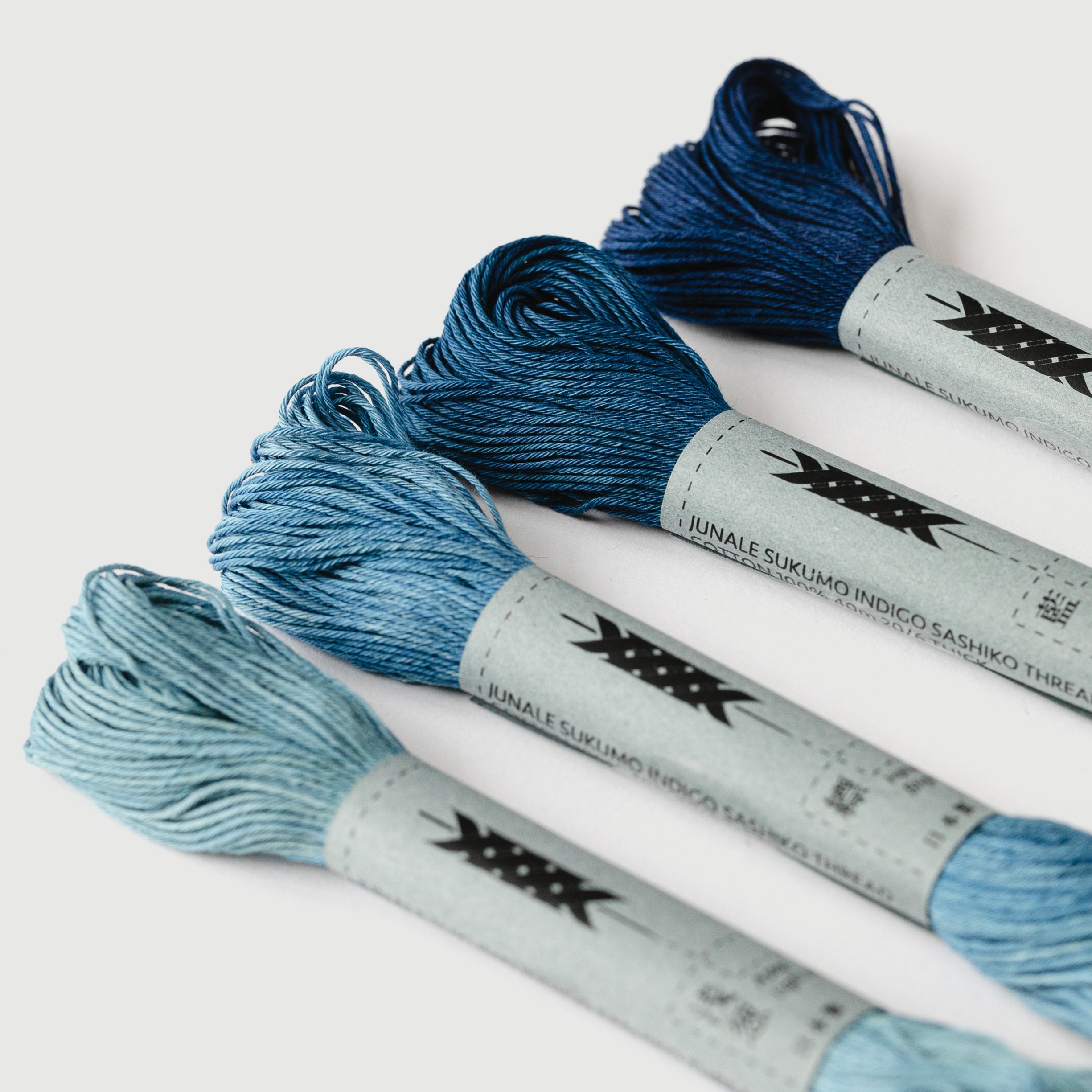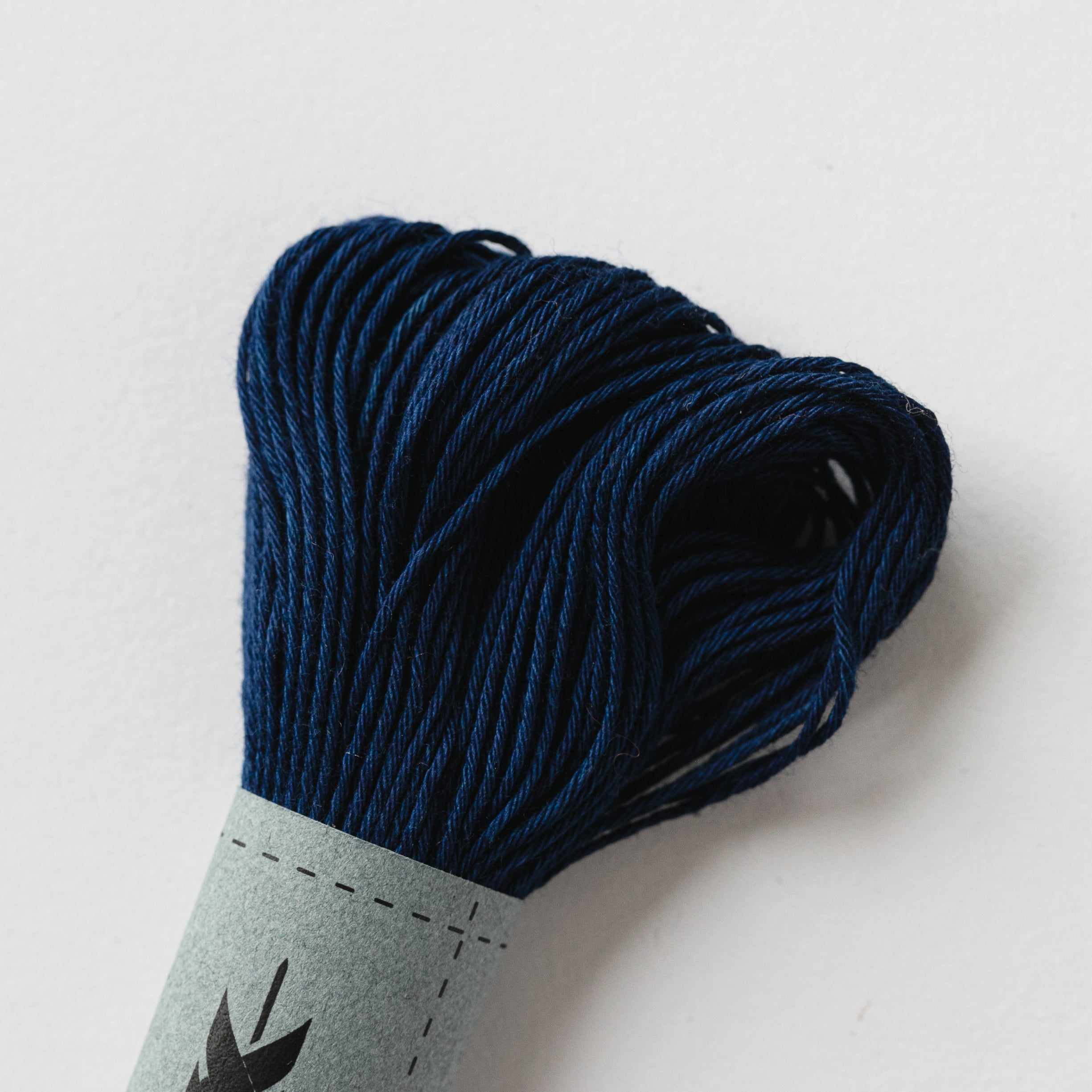 Hand-dyed by Junale in Osaka, this soft indigo-dyed cotton thread is ideal for Sashiko. Each thread is individually processed post-indigo fermentation, preserving subtle colour variations that add depth when stitched.