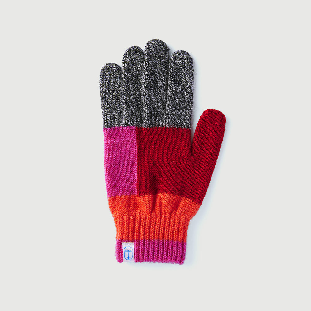 Knitted gloves in a vibrant, four-color block design, from tet, Japan..They are made from Australian “Winners” wool thats shorn at just the right time to combine the softness of lamb wool with the structure of adult wool resulting in comfort and durability.