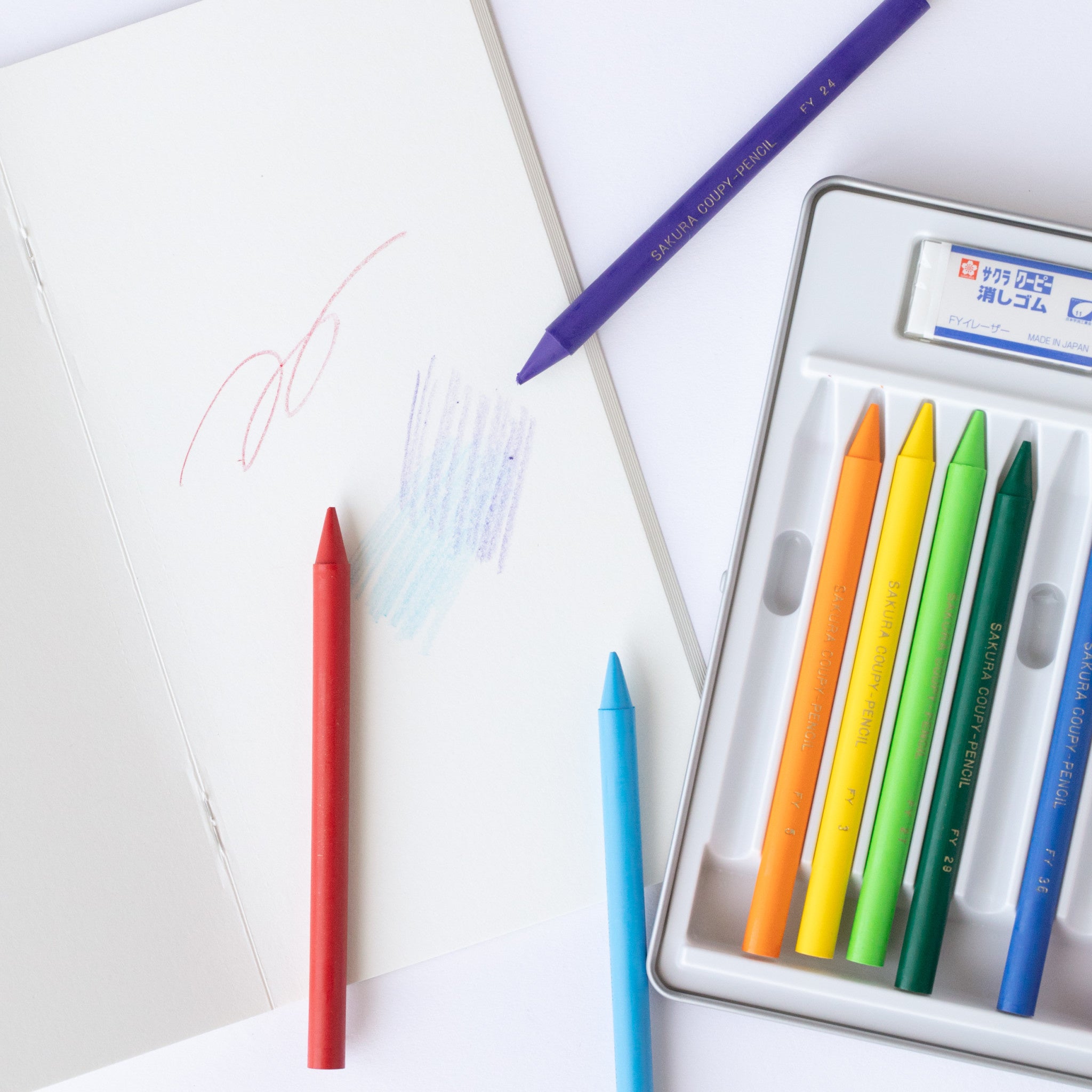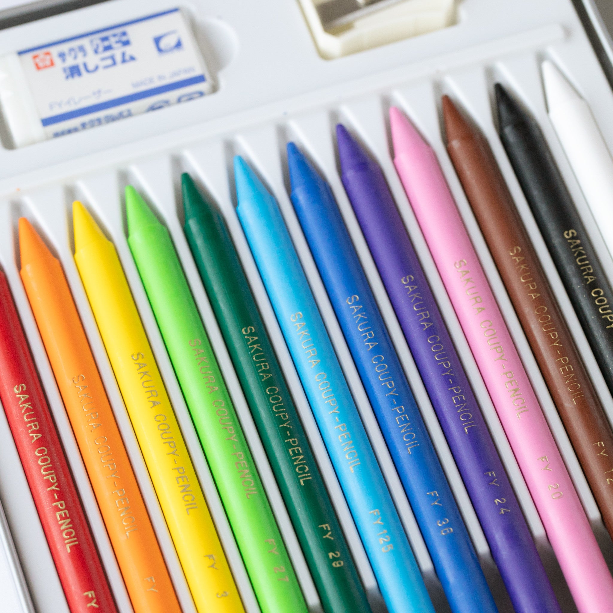 A vibrant set of crayons, the Coupy Pencil Set by Sakura combine the smooth colour application of crayons with the brightness of dry pastels. Excellent for creating colour blocking and vivid tones, hard to break and easy to erase, the pencils are mess and grease-free when using.