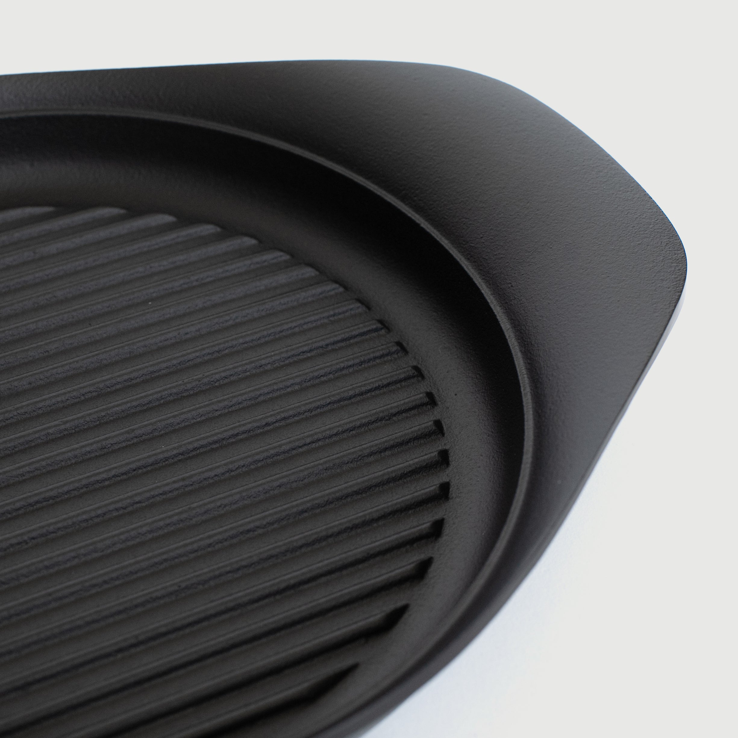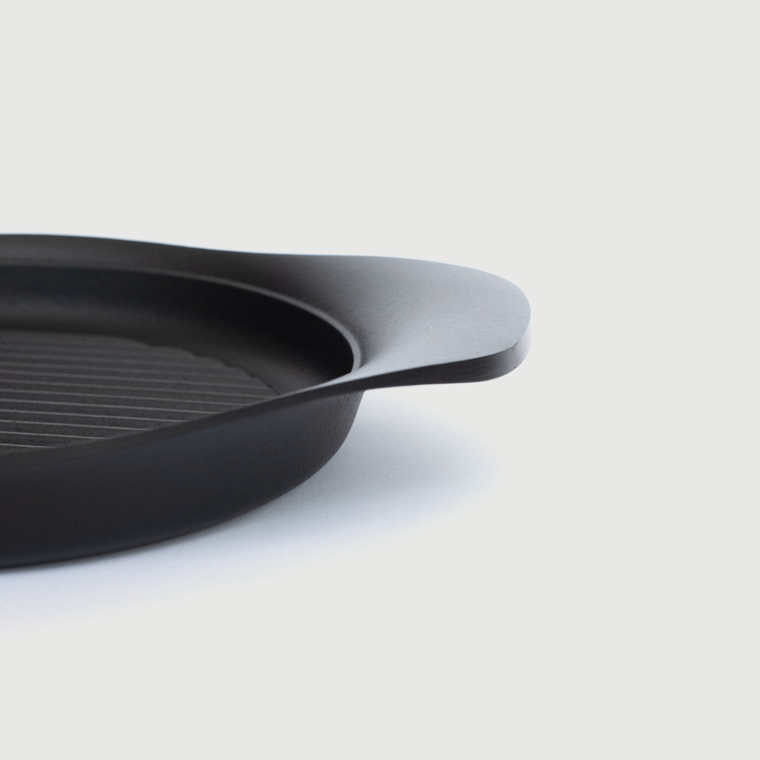 Designed by Sori Yanagi and made of Nambu Tekki cast iron, a material traditional in Japan and known for its durability as well as superior heat distribution and retention. The curved edges allow for easy pouring and the raised ridges produce a good sear on meat, fish and vegetables while keeping food raised above any cooking fats.