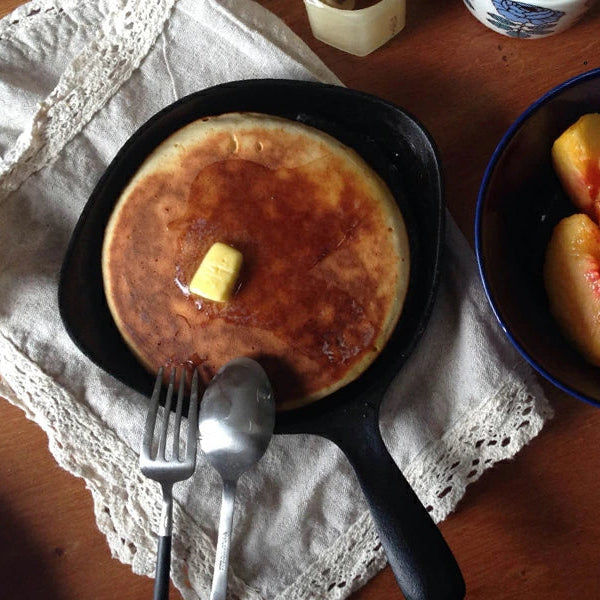 A small pan / skillet, designed by Sori Yanagi and made of Nambu Tekki cast iron - a material traditionally used in Japan and known for its durability as well as superior heat distribution and retention.