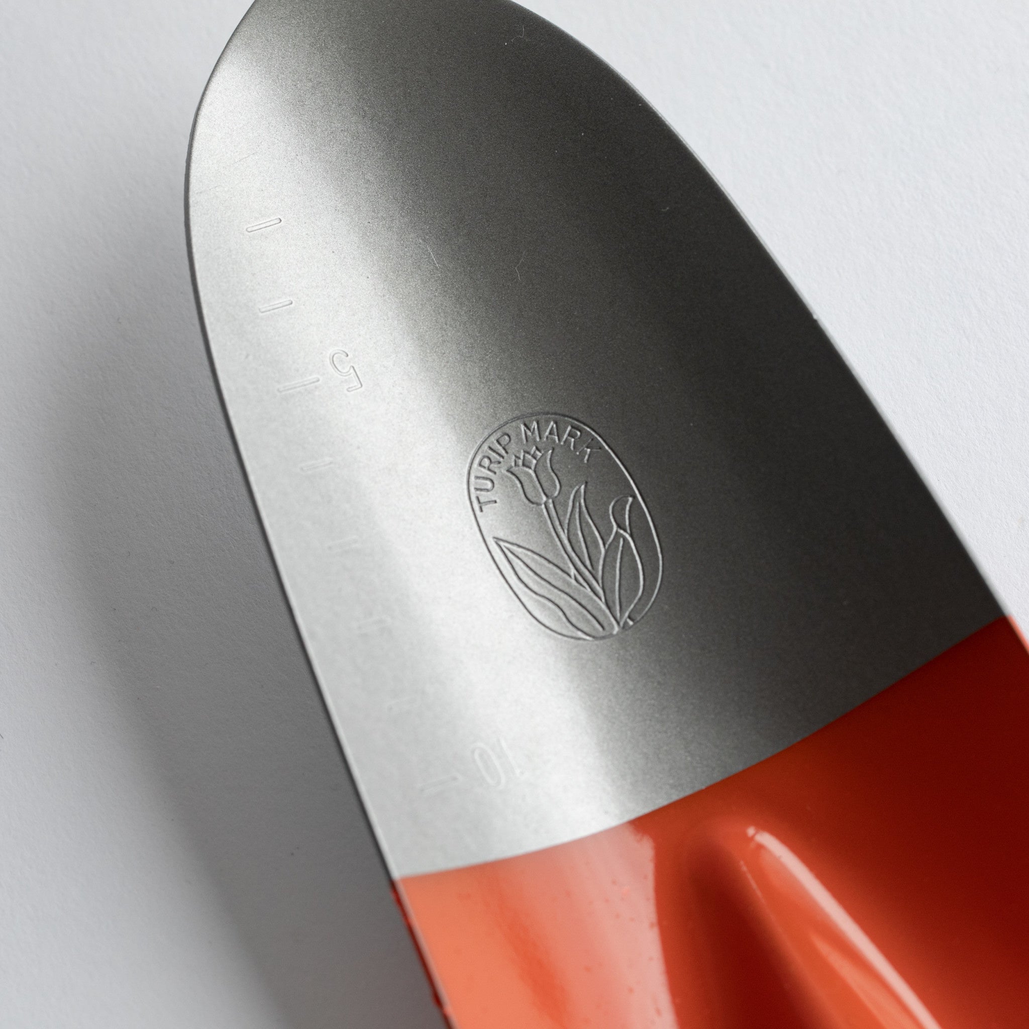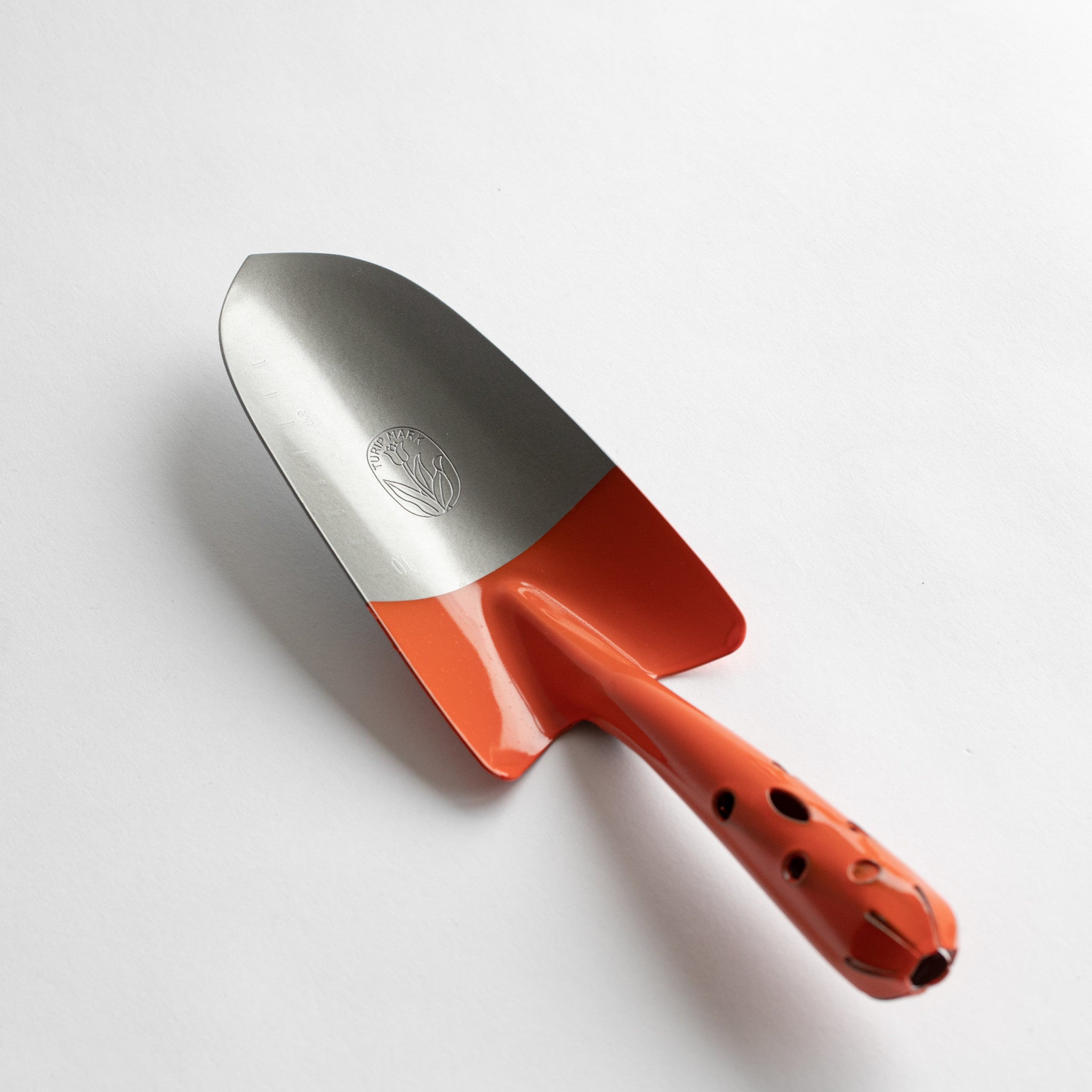 Garden trowel made of steel with a powder coated orange handle*. There are centimetre markings to one side and a handle that is perforated with an integrated hook for neat storage.