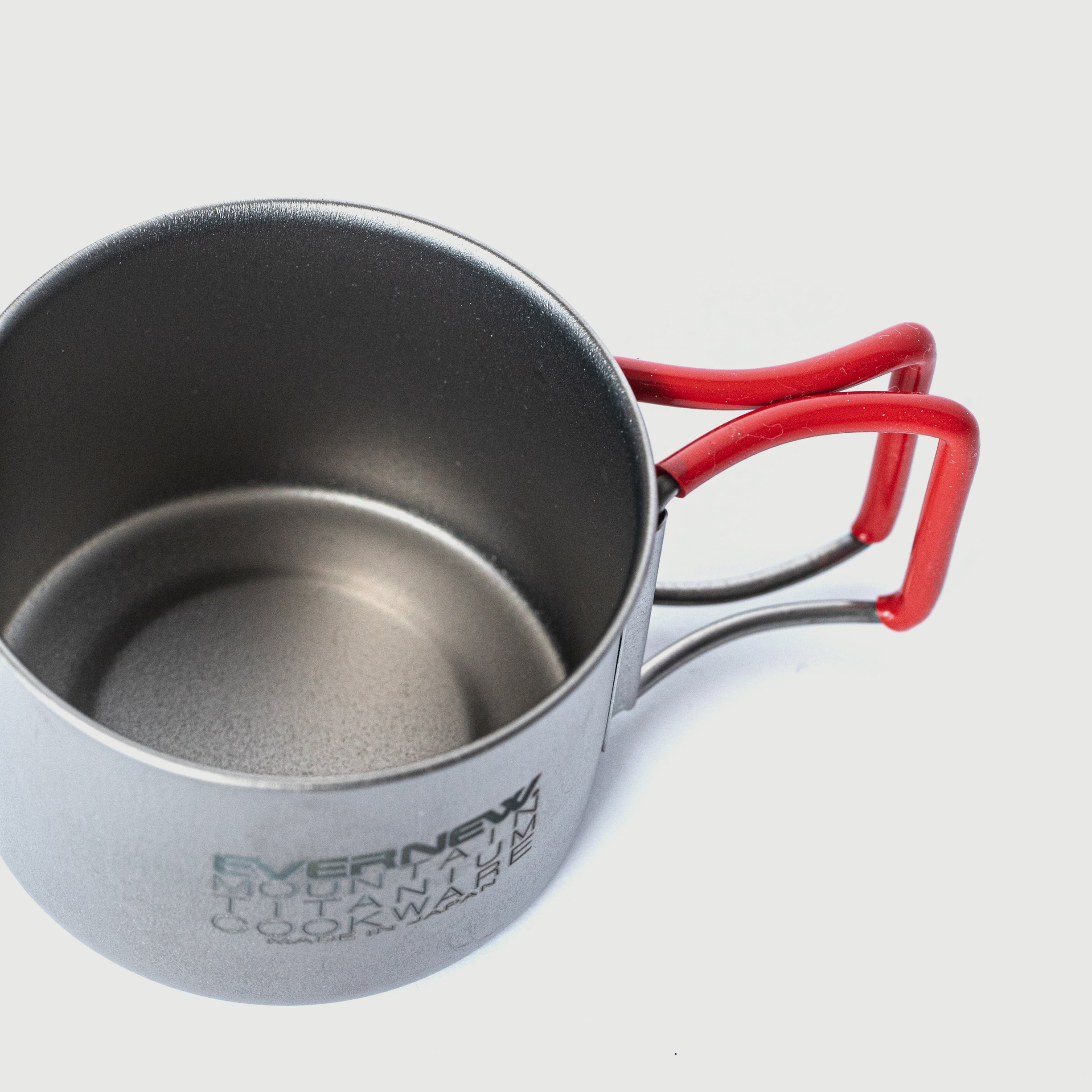 The Evernew Ti Demitasse 220 FH is a lightweight, 0.3mm titanium cup designed for outdoor use. Perfect for a small coffee, it features foldable handles with silicone grips for comfort and portability.