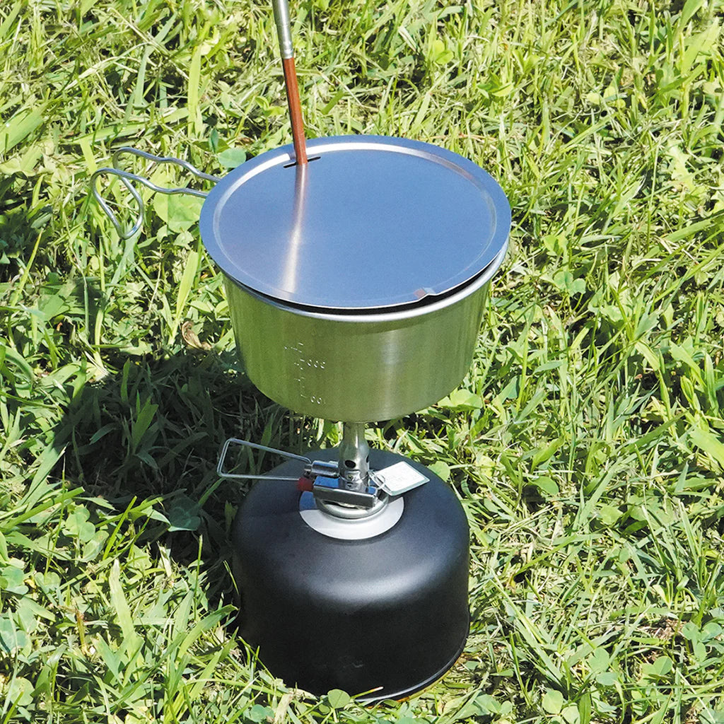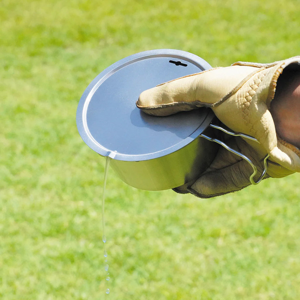 This lightweight, round lid packs easily without bulky flaps. It features a spout for pouring and a notch for lifting with chopsticks or a spoon. Doubles as a plate or cutting board.
