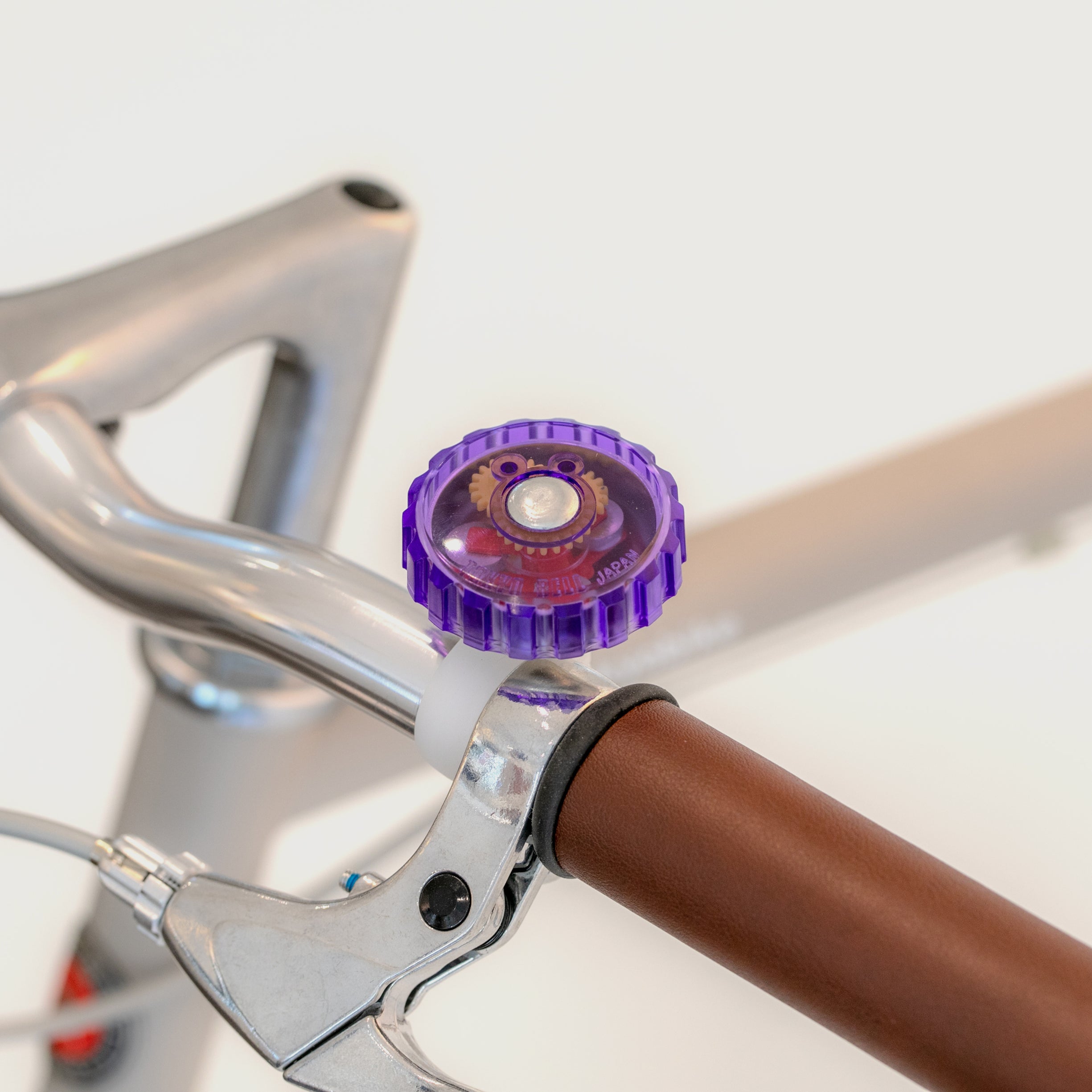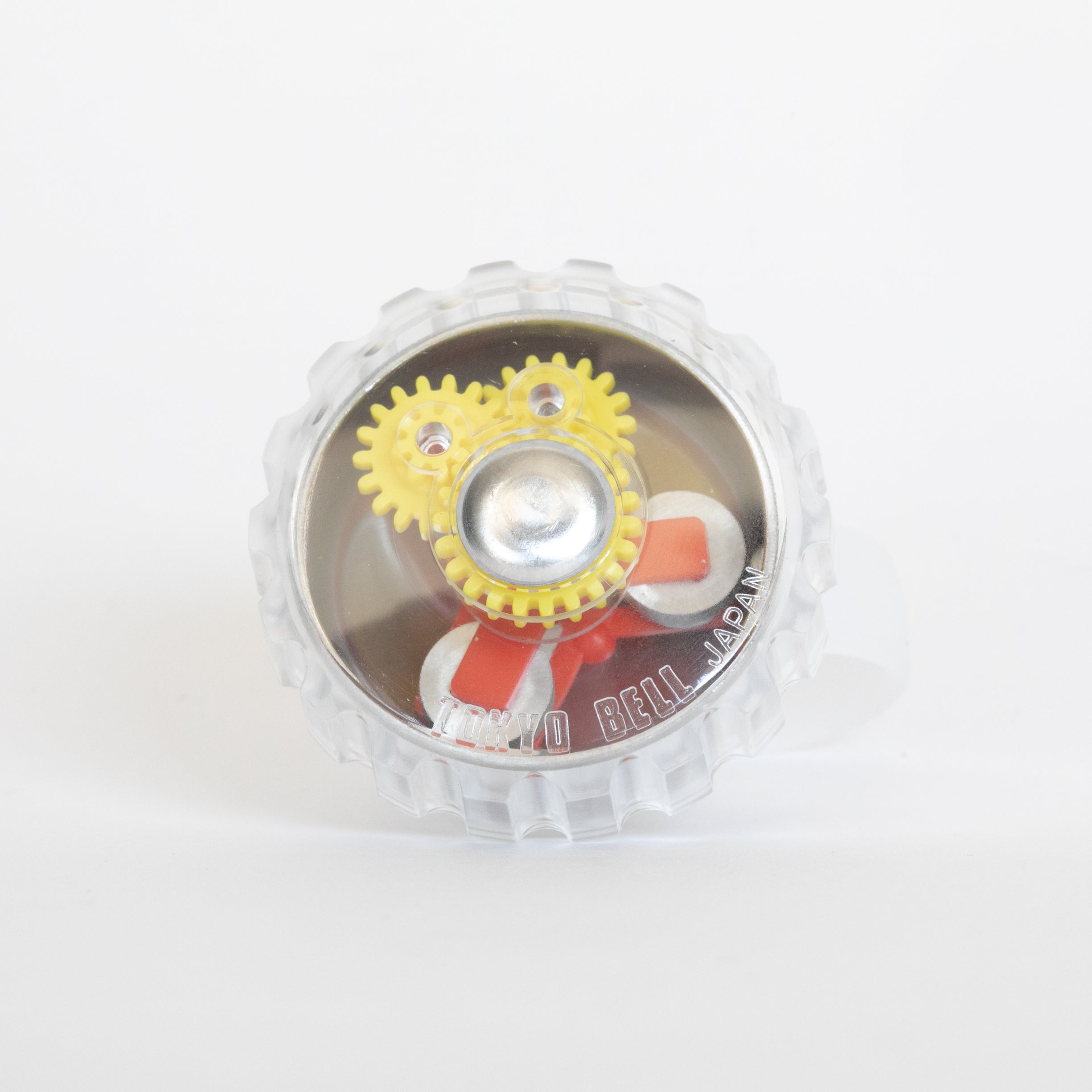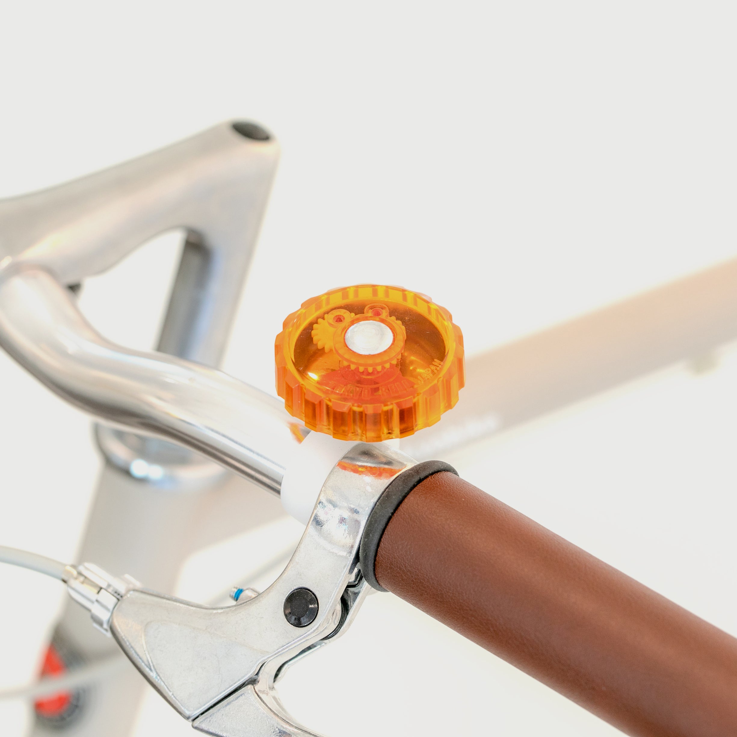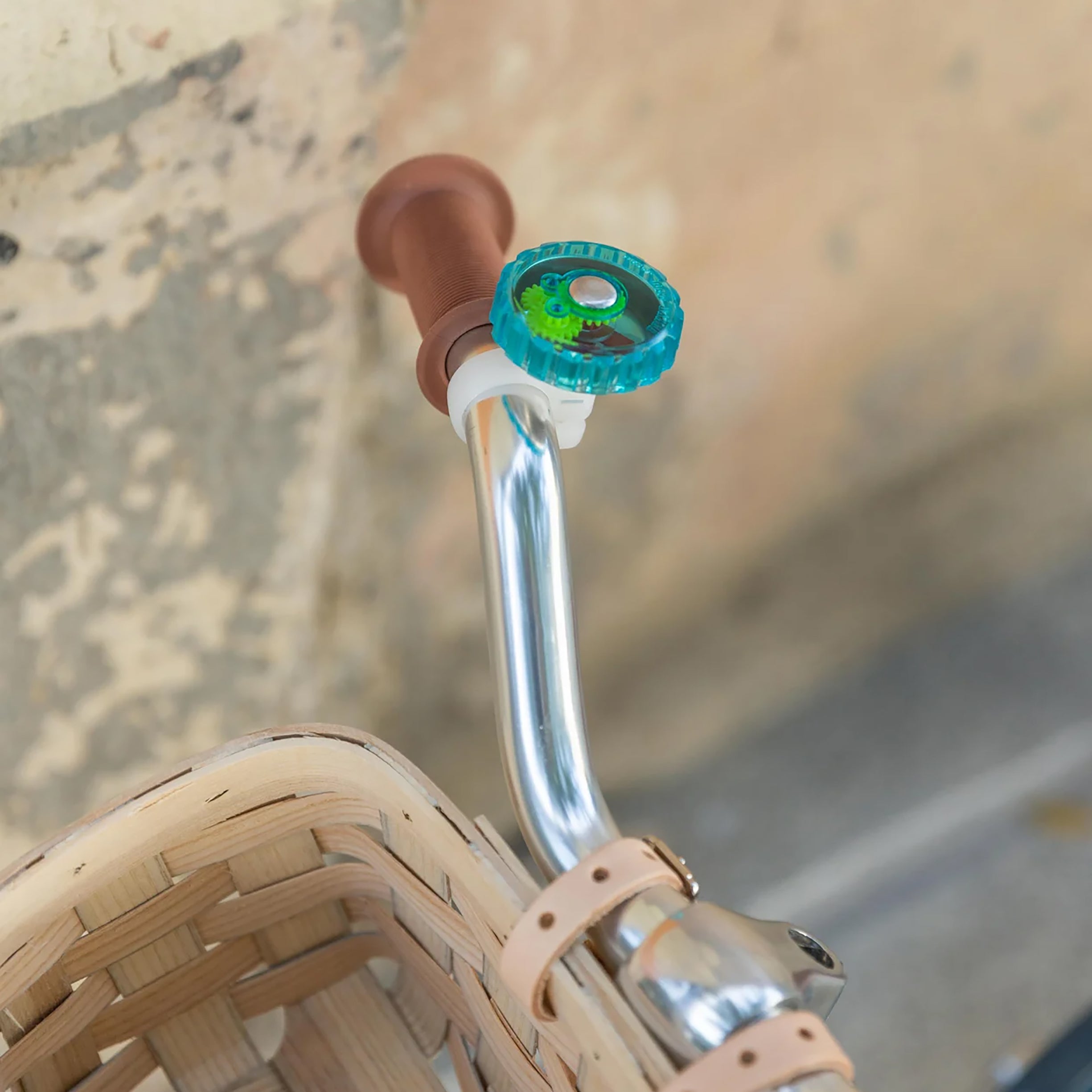 The sound of a classic bicycle bell with moving gears visible through its transparent casting. It can be easily turned (rung) without much effort making it great for kids bikes.