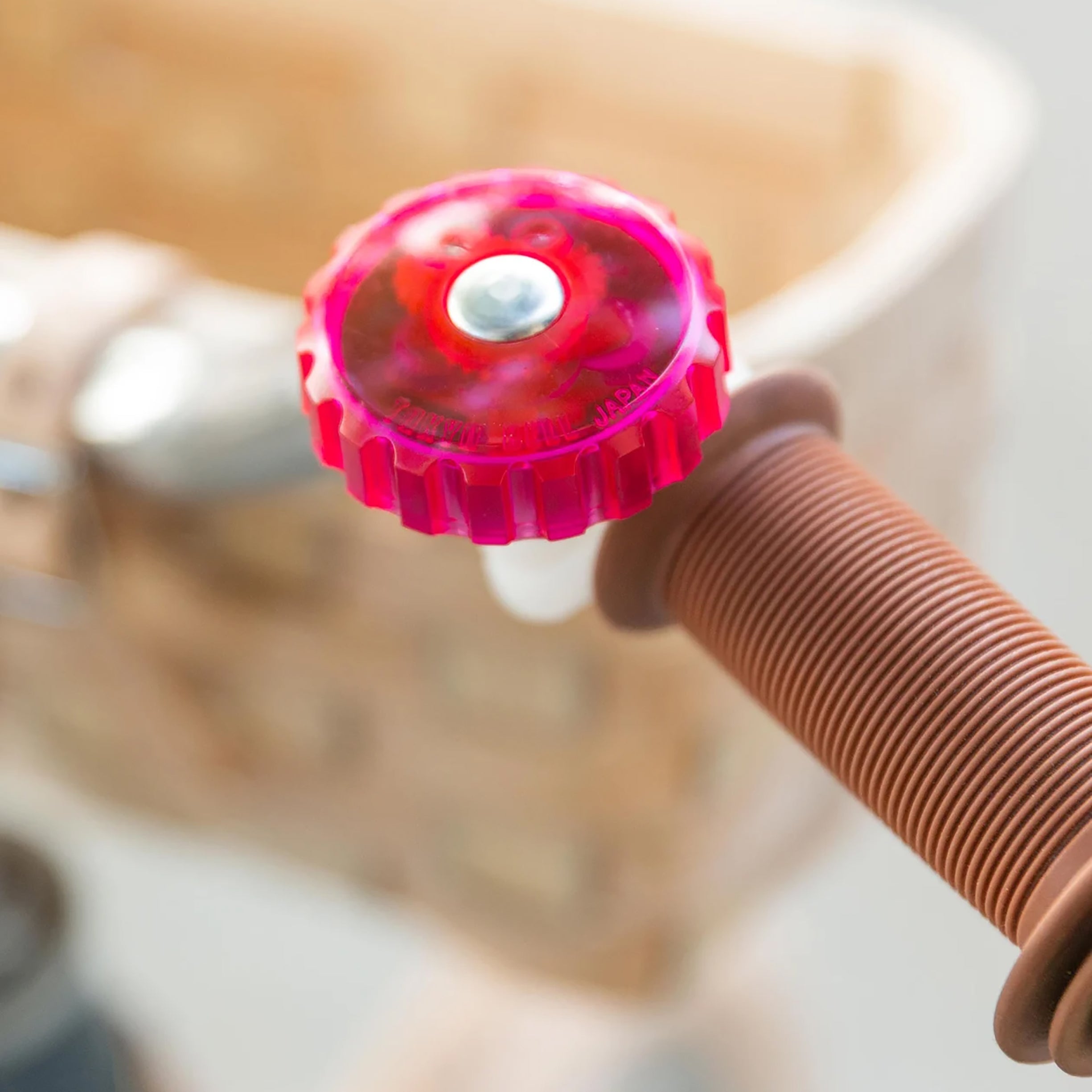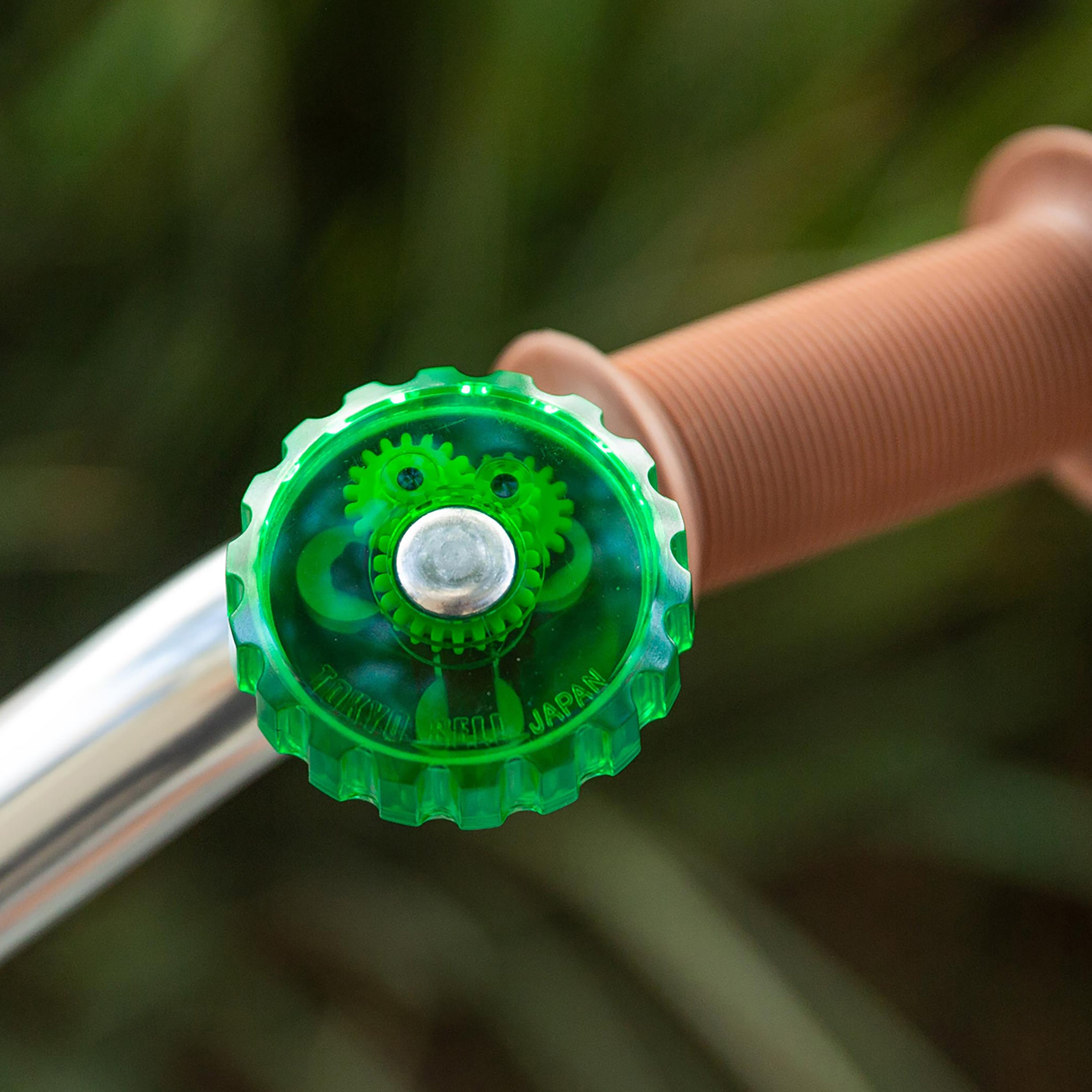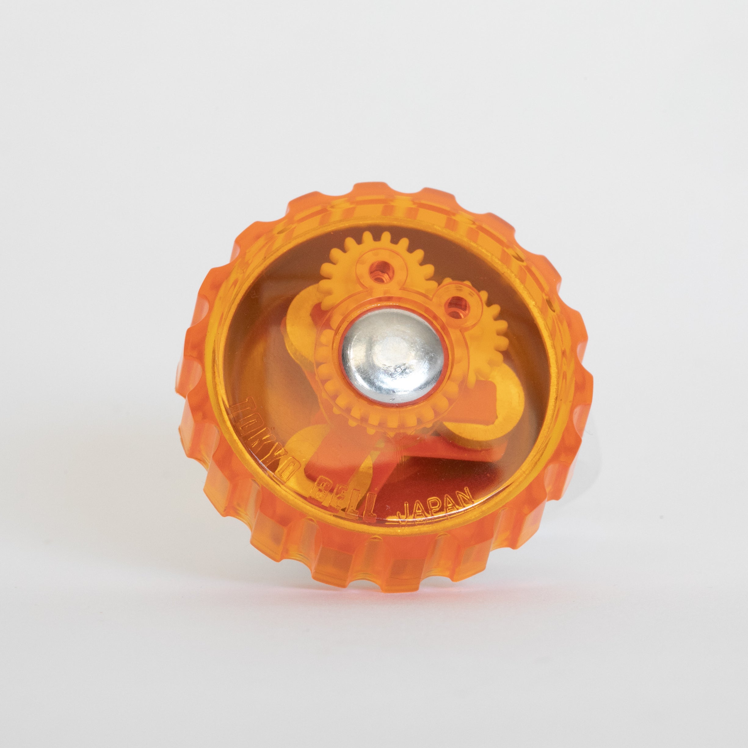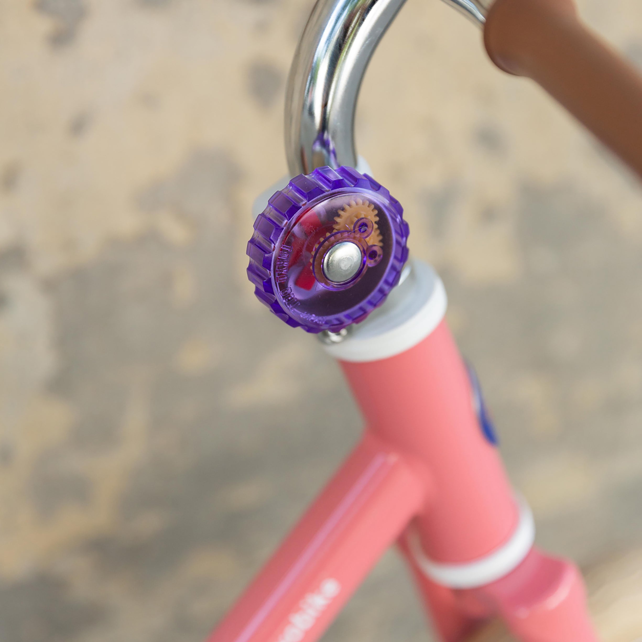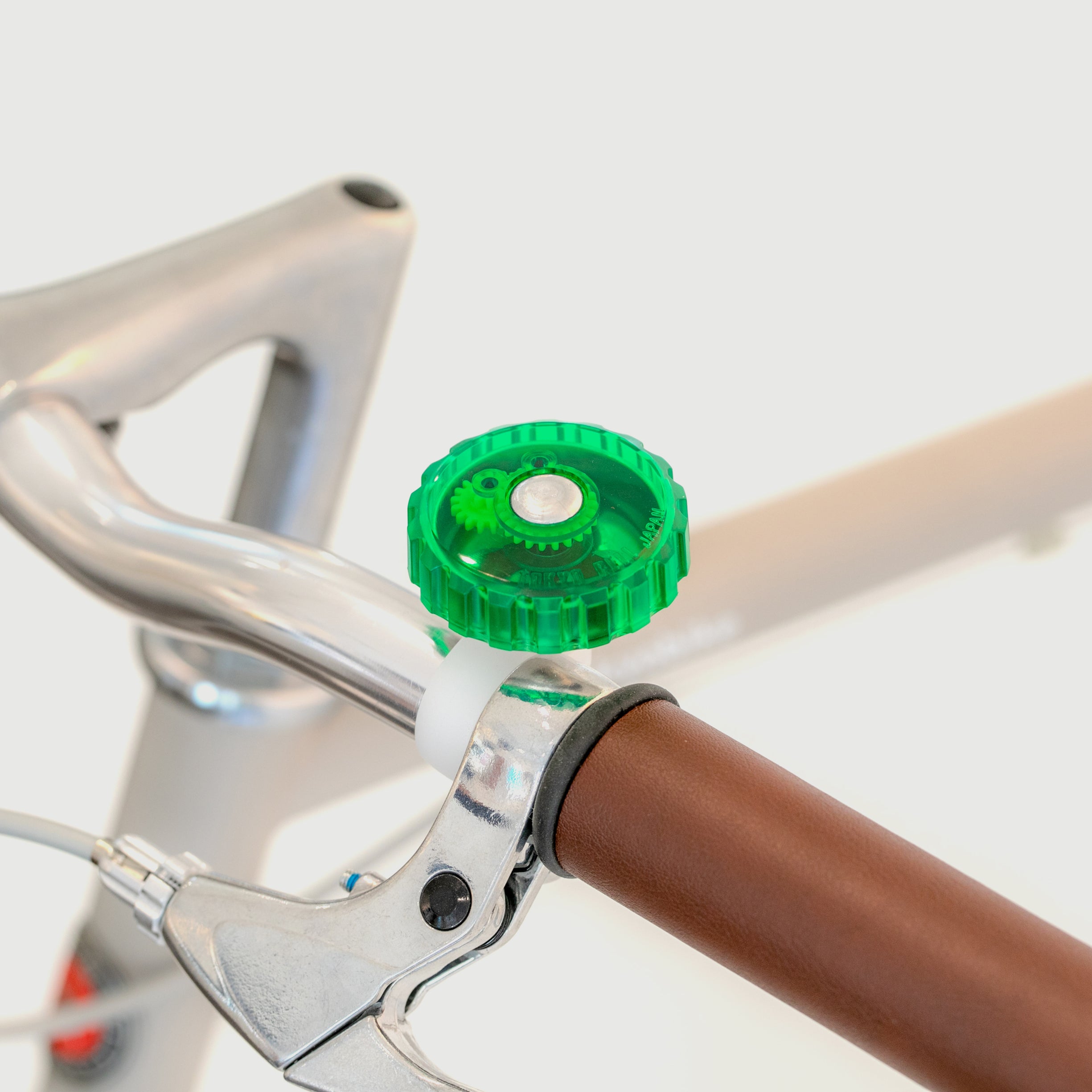 The sound of a classic bicycle bell with moving gears visible through its transparent casting. It can be easily turned (rung) without much effort making it great for kids bikes.