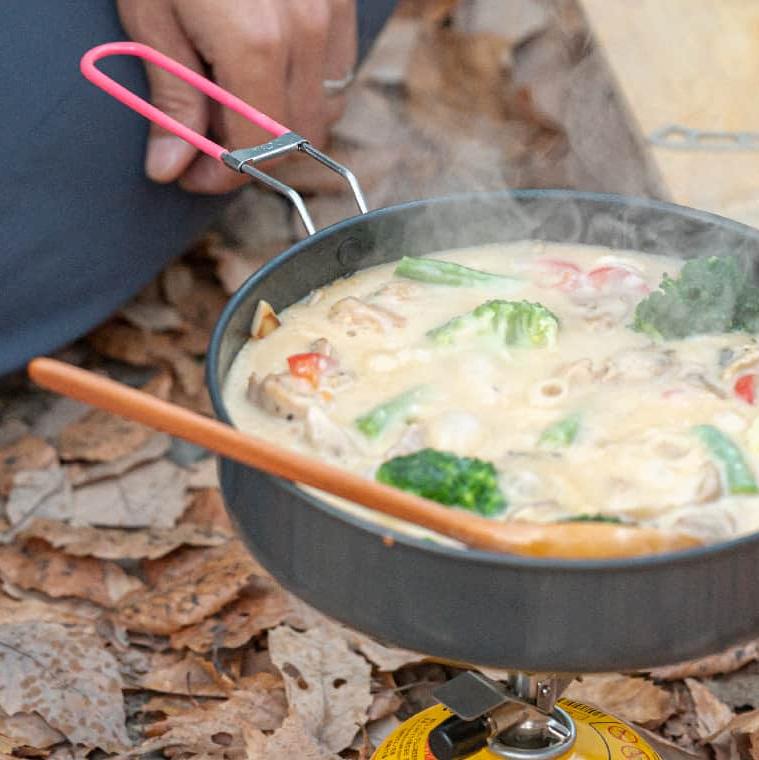Ideal for cooking a variety of meals, the pan heats up quickly even with low heat due to its thin material, and its size (16cm/900ml and 18cm/1200ml) makes it versatile for both frying and boiling. Weighing just 129g (16cm) or 152g (18cm), it's perfect for ultralight hikers and campers who want reliable cookware for more complex outdoor meals. *1*2