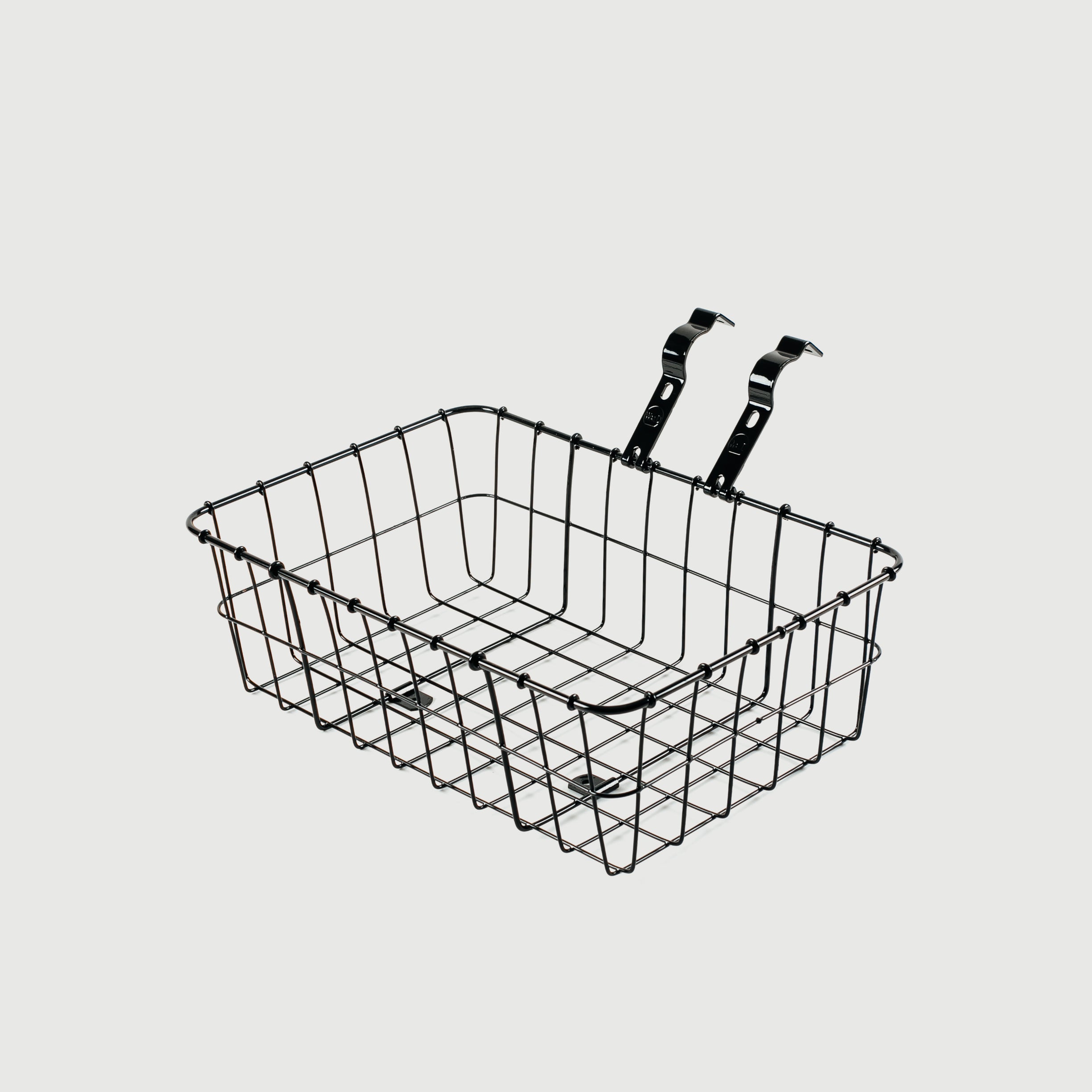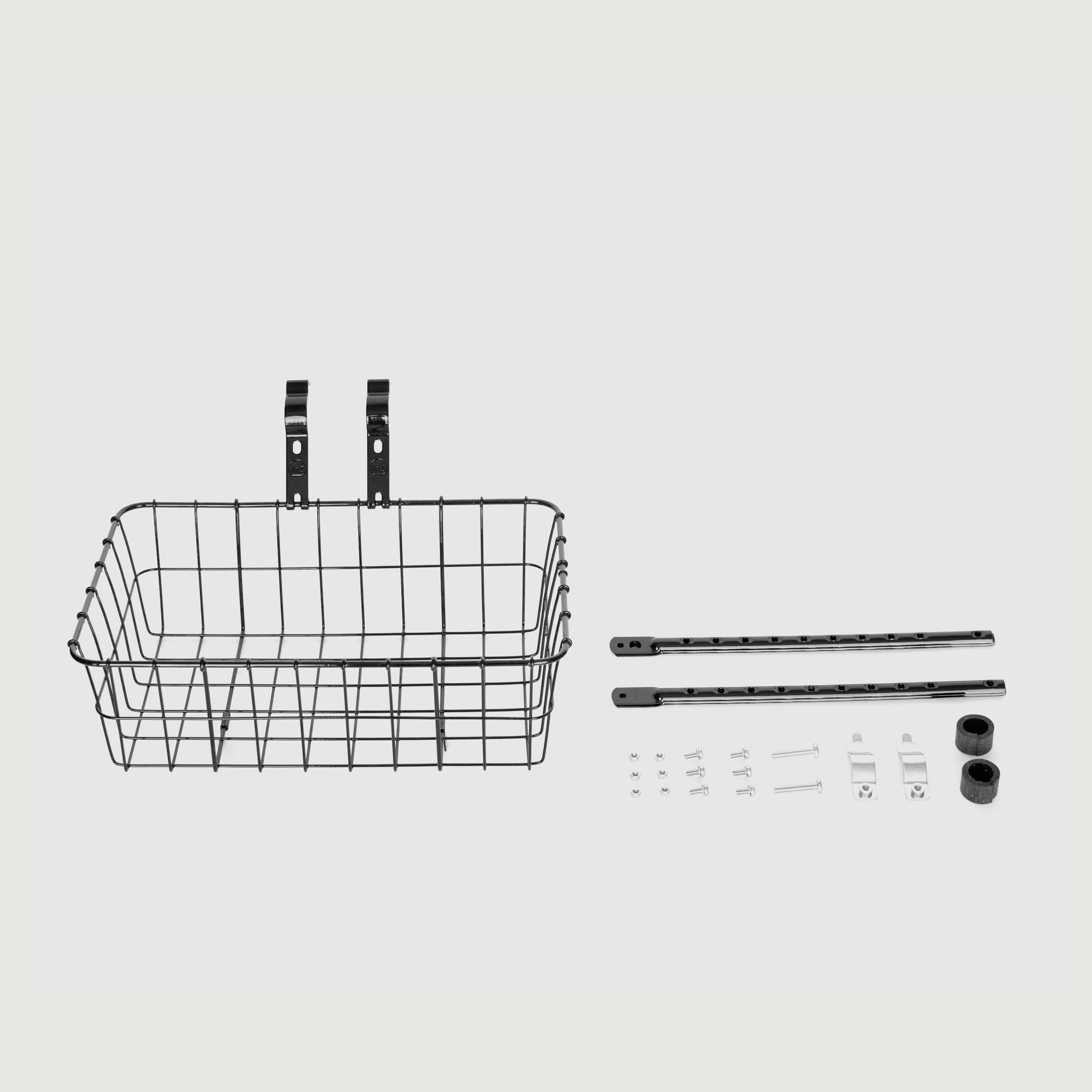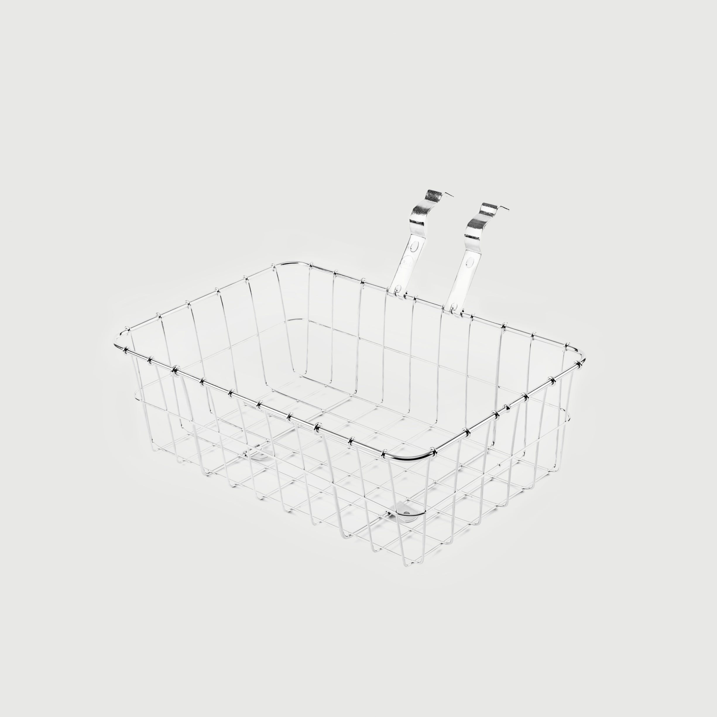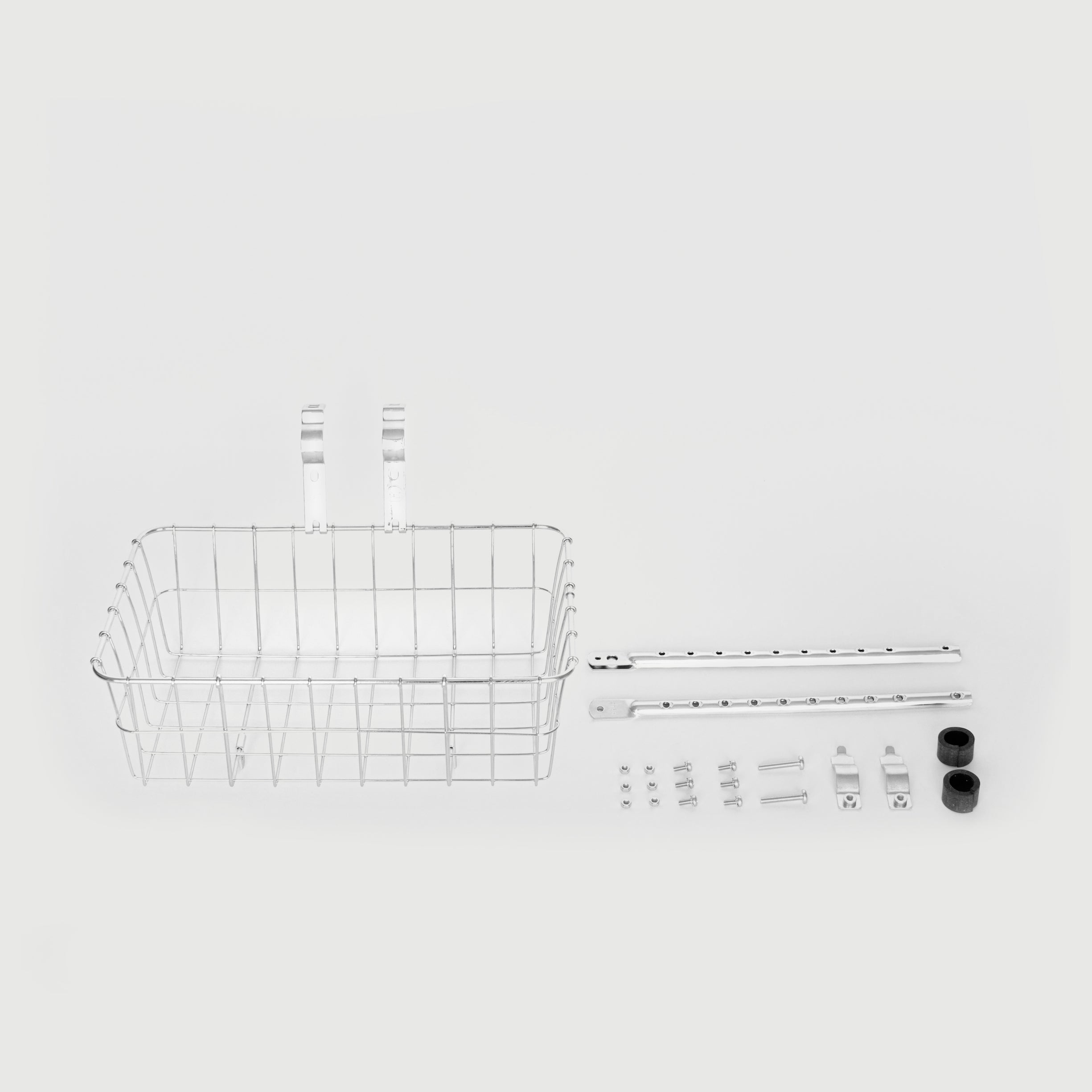 A shallow front basket suitable for most bicycles and available in silver or gloss black. The basket comes with adjustable legs that can be fitted to eyelets or solid axles, making them suitable for most bikes.