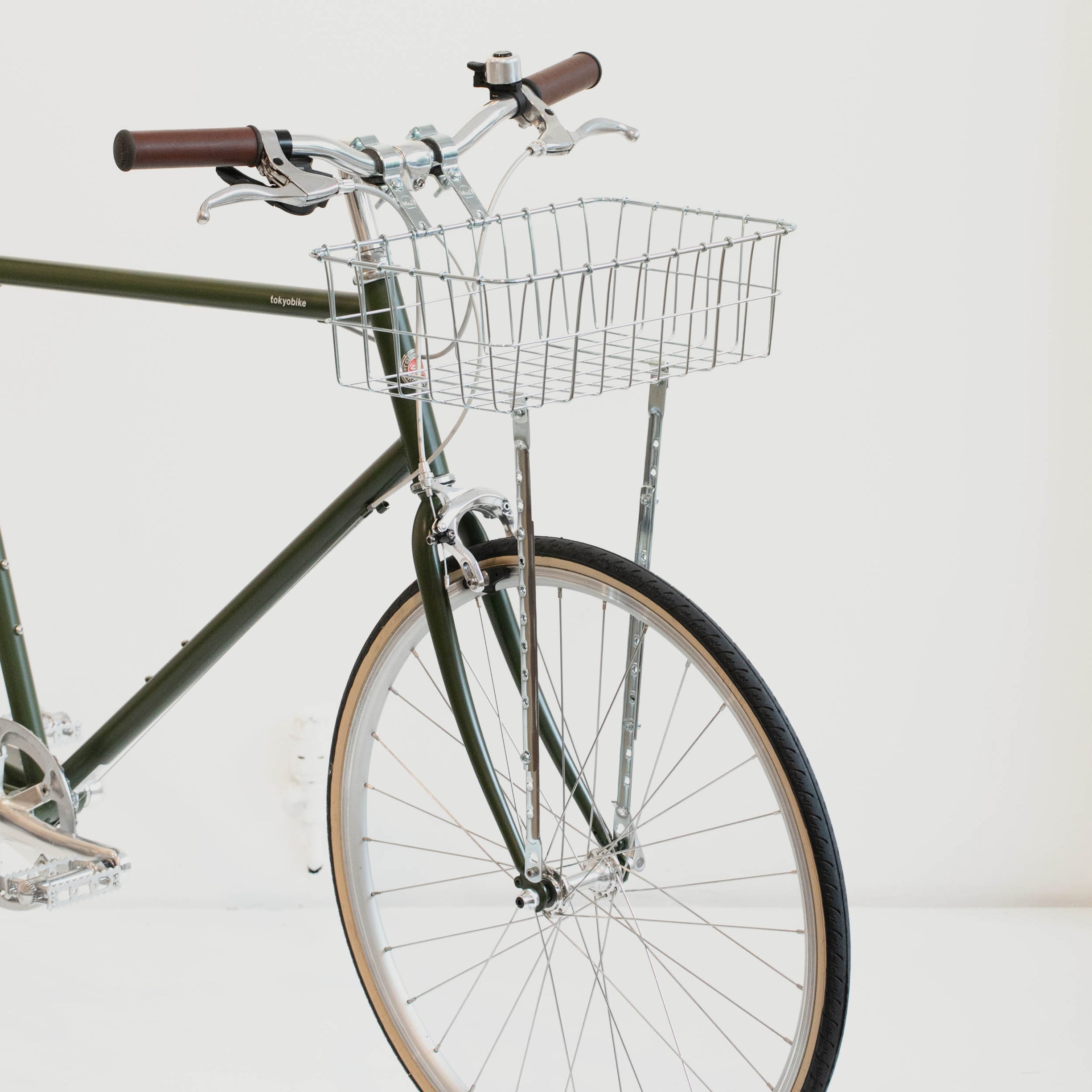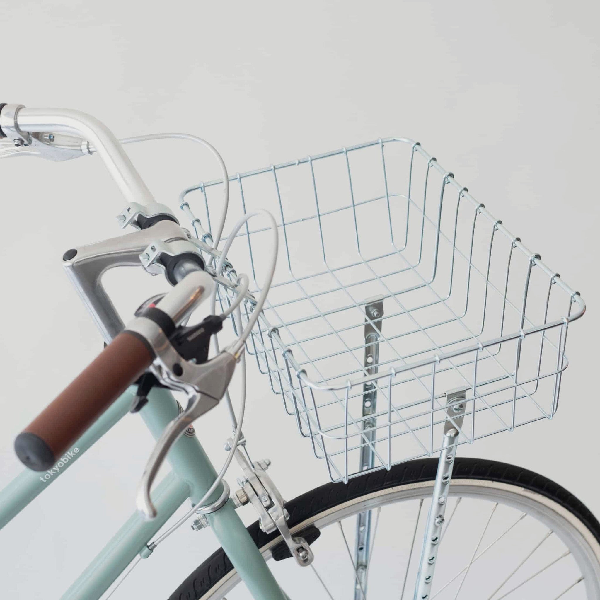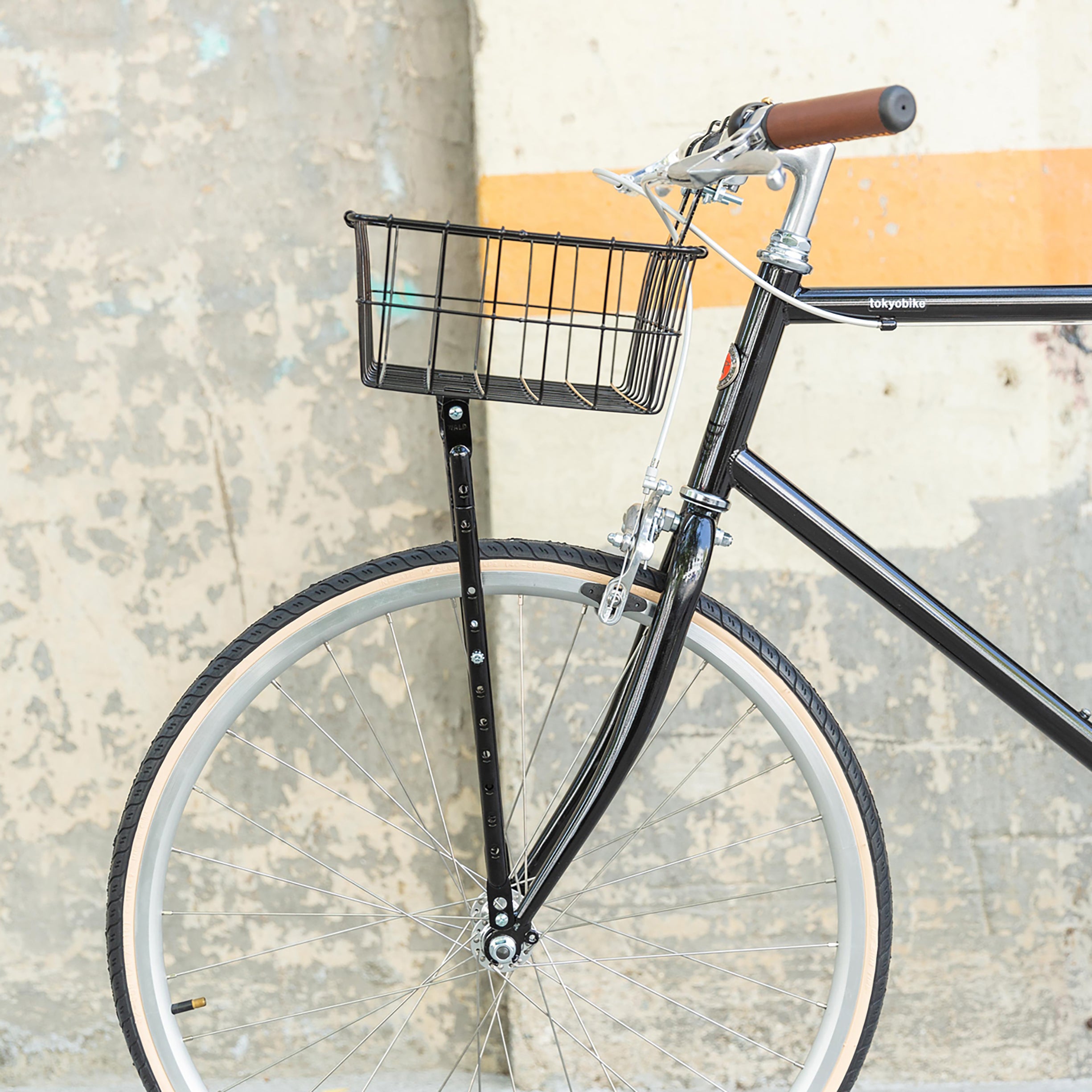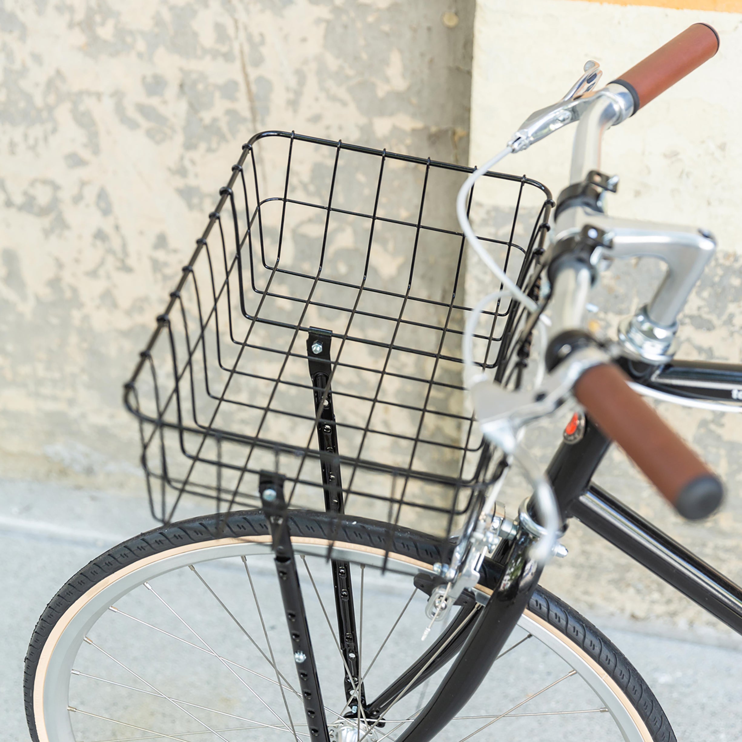 A shallow front basket suitable for most bicycles and available in silver or gloss black. The basket comes with adjustable legs that can be fitted to eyelets or solid axles, making them suitable for most bikes.