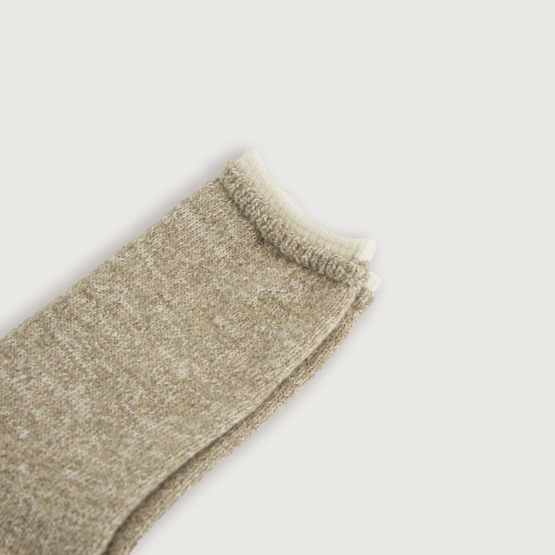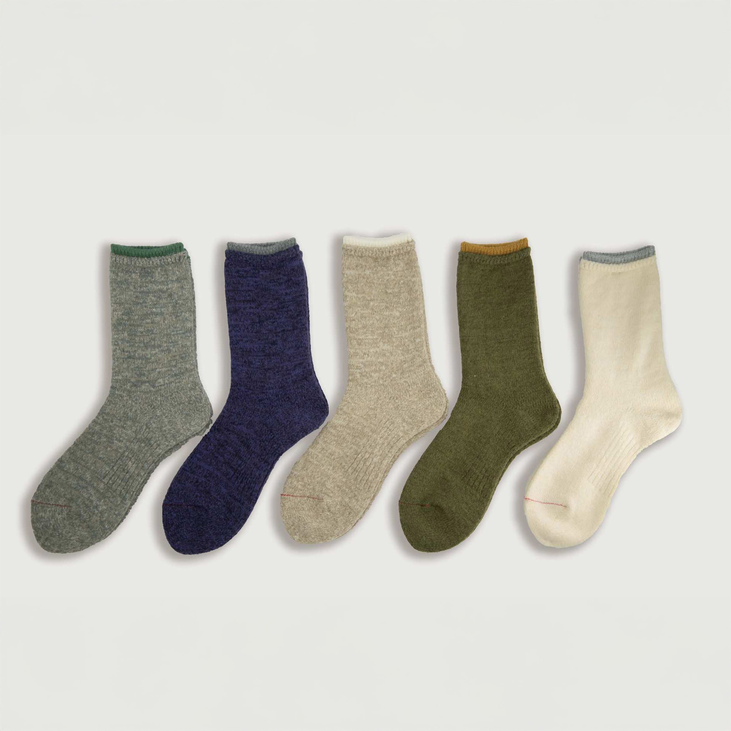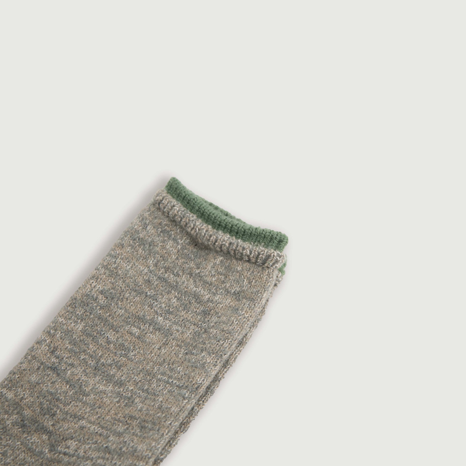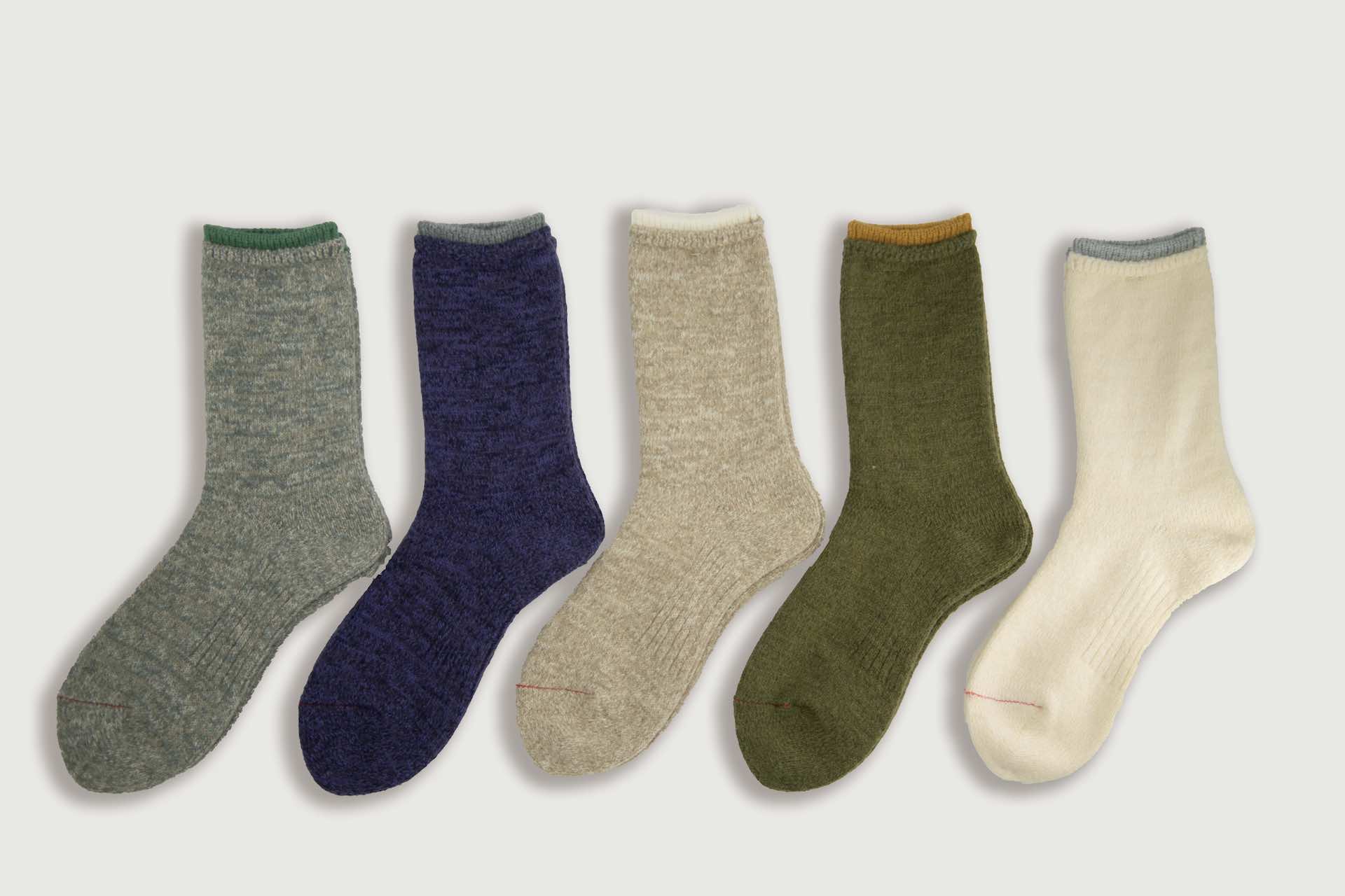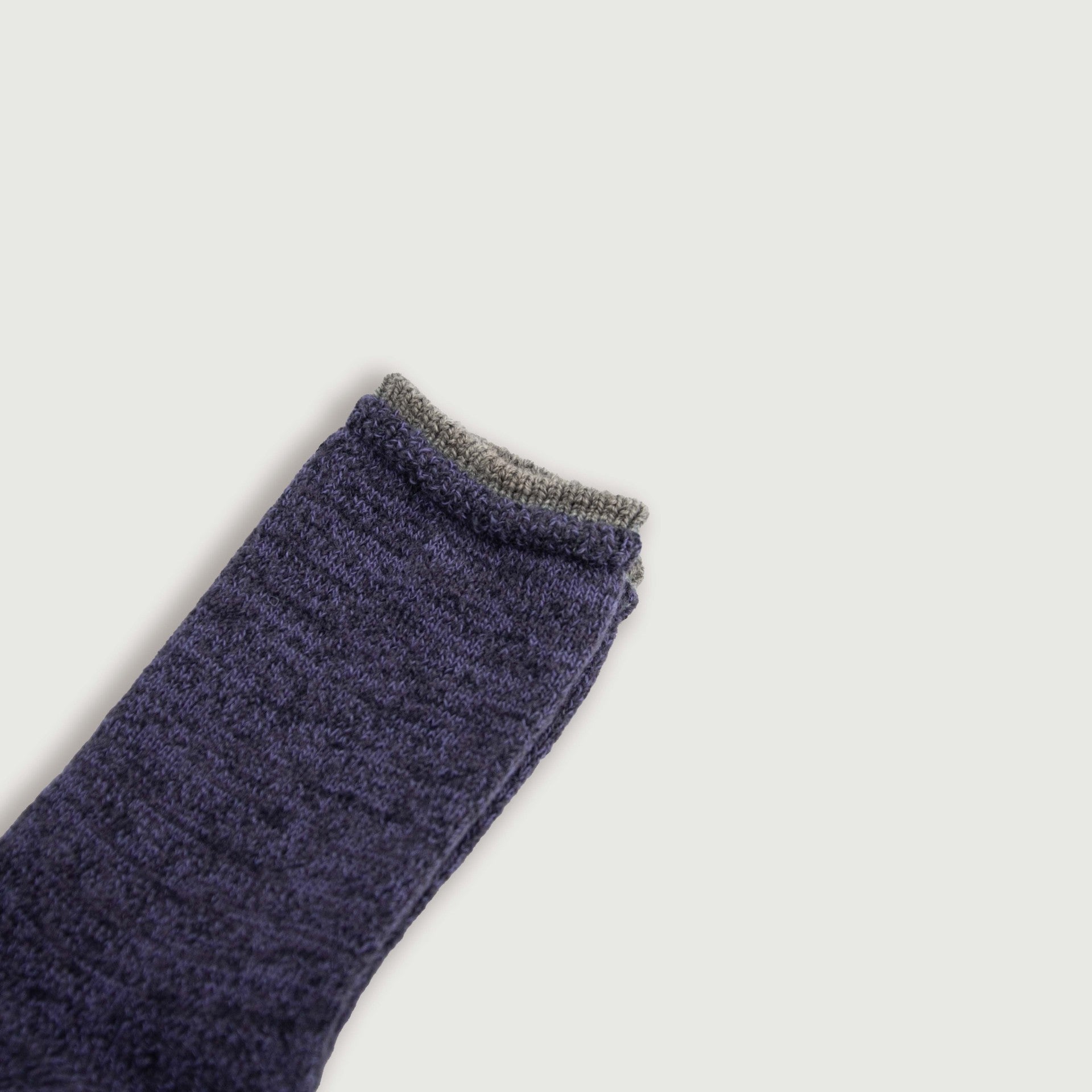 Warm, comfy, socks made from a mix of wool and hemp on vintage knitting machines in Nara prefecture, Japan. Designed with a contrasting hem and toe stitch they are both soft and supremely comfortable.