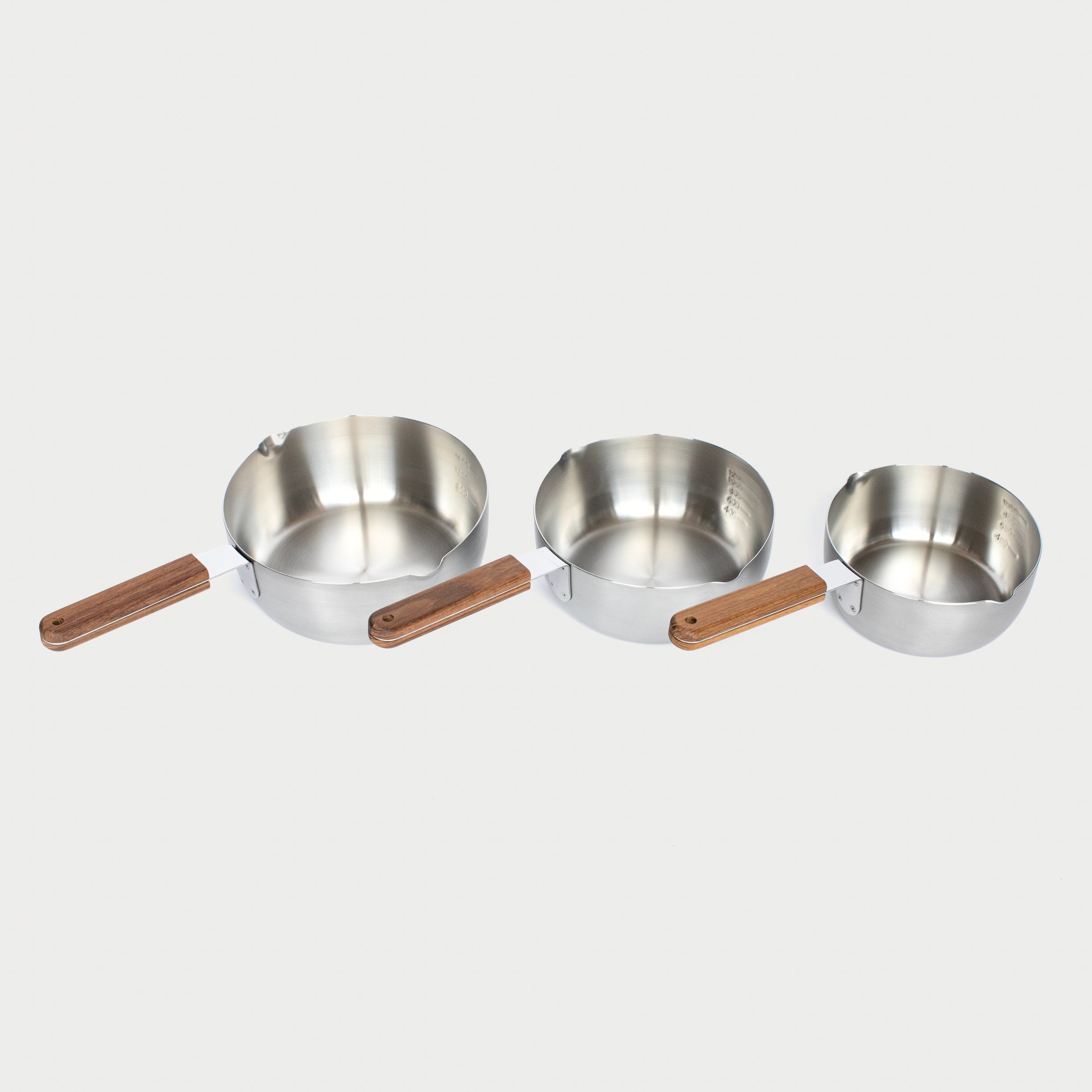 A Yukihira Pans designed by Makoto Koizumi for Ambai. Traditionally Yukihira pans are made from aluminium to heat quickly, but these contemporary, stainless steel versions with teak handles are hard wearing and thoughtfully designed. Three layers of stainless steel provide excellent heat conduction while measurements on the interior surface aid with cooking. The inbuilt spout makes pouring easier.